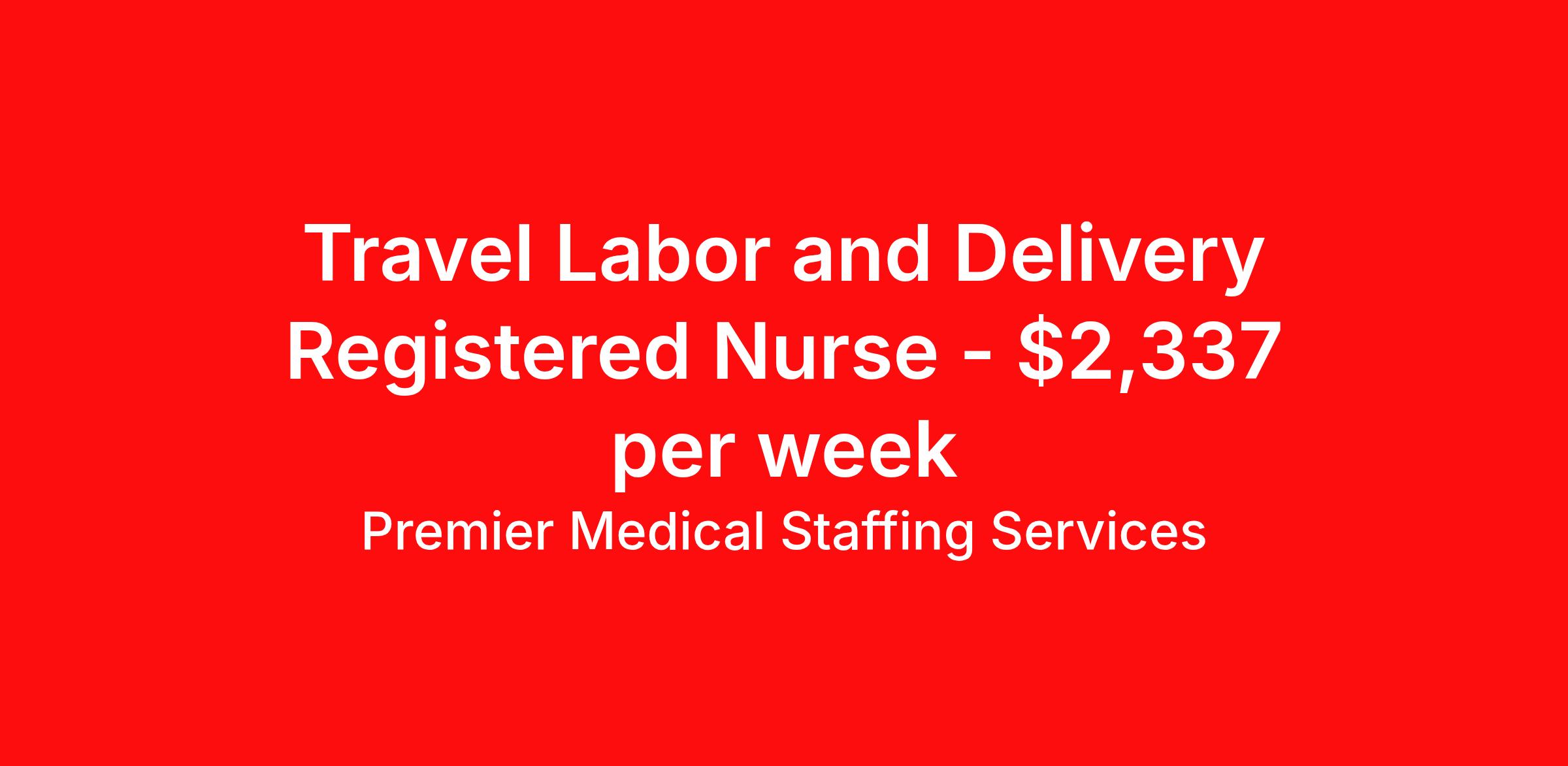 Premier Medical Staffing Services is seeking a travel nurse RN Labor and Delivery for a travel nursing job in Clinton, Maryland. Job Description & Requirements Specialty: Labor and Delivery Discipline: RN Start Date: 04/20/2026 Duration: 13 weeks 36 hours per week Shift: 12 hours Employment Type: Travel Premier Medical Staffing Job ID 626067. Pay package is based on 12 hour shifts and 36 hours per week (subject to confirmation) with tax-free stipend amount to be determined. Posted job title: RN L&D About Premier Medical Staffing Services Premier Medical Staffing Services, LLC is a nationally expanding healthcare staffing firm for healthcare professionals and companies. We understand our clients’ need for highly qualified, expertly trained medical professionals and are passionate about helping clinicians find employment opportunities that fit their personality and needs. Able to accommodate the ever-changing needs of the healthcare landscape, we offer per-diem, contract and direct hire placements to support the unique needs of each industry sector. Premier Medical Staffing Services is Joint Commission Certified, a Military Spouse Employment Partner and is certified as a Women’s Business Enterprise. We are proudly nurse owned.
