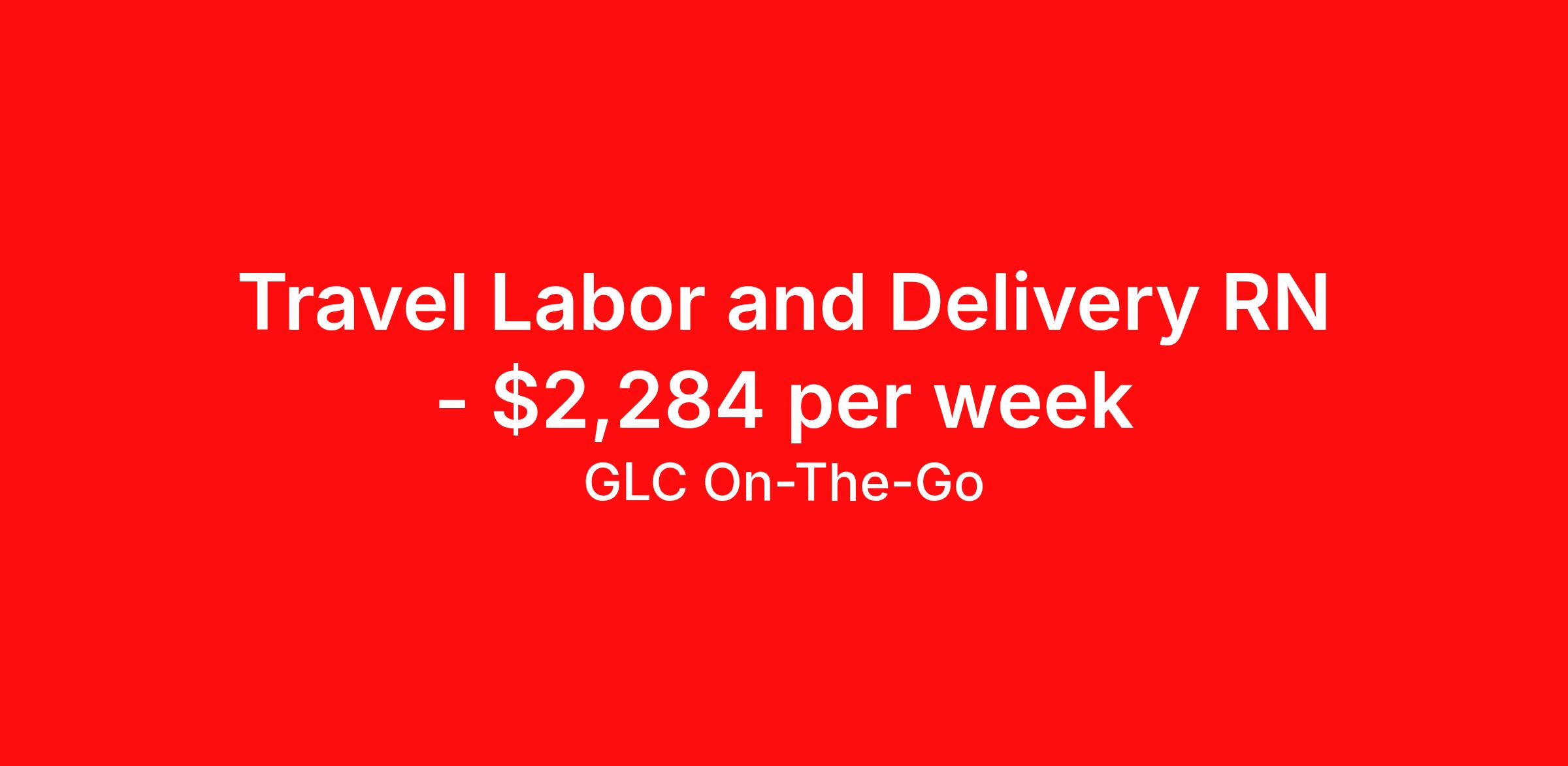 GLC On-The-Go is seeking a travel nurse RN Labor and Delivery for a travel nursing job in Pueblo, Colorado. Job Description & Requirements Specialty: Labor and Delivery Discipline: RN Start Date: 03/30/2026 Duration: 13 weeks 36 hours per week Shift: 12 hours Employment Type: Travel GLC is hiring: RN Labor & Delivery (L&D) - Pueblo, CO - 13-week contract GLC – Named Best Nurse Agency 2024–2025 We connect nurses, nursing professionals, and allied health professionals like you to contracts that align with your skills, schedule, and career goals. About this Assignment Join the care team in Labor & Delivery (L&D) where you’ll provide patient-centered care in a collaborative environment. Typical responsibilities include direct patient care, timely documentation, and coordination with the care team. Specific duties will be confirmed during your interview with a recruiter. Assignment Details Location: Pueblo, CO Assignment Length: 13 weeks Start Date: 03/30/2026 End Date: 06/29/2026 Pay Range: $2,055 - $2,284 Minimum Requirements Active license in Labor & Delivery (L&D) 1 year full-time RN, Labor & Delivery (L&D) experience within the last 2 years What you can expect from GLC Weekly on-time pay with direct deposit Transparent communication, clear assignment details, and recruiter support from start to finish - or extension Referral bonus up to $500 Health, dental, and vision insurance 401(k) plan Completion and signing bonuses may also be available Ready to move forward? Apply now and start your rewarding journey with GLC - a recruiter will connect quickly to review pay , start date , and assignment details so you can make the best decision for your next contract. GLC On-The-Go Job ID 502129. Pay package is based on 12 hour shifts and 36 hours per week (subject to confirmation) with tax-free stipend amount to be determined. Posted job title: Labor and Delivery Registered Nurse About GLC On-The-Go GLC is more than just a staffing agency – we’re your trusted partner in finding travel, local, and PRN contracts that align with your career aspirations and lifestyle. We specialize in connecting travel nurses and allied healthcare professionals like you with opportunities in acute care, long-term care, behavioral health, and allied fields across the U.S. Our attentive and friendly recruiters are always just a call or text away, ready to guide you at every step, ensuring you feel valued and heard. We understand the unique needs of travel healthcare professionals, which is why we offer comprehensive benefits and 24/7 support. Join GLC, where our 20 years of experience mean we know how to help you find the assignments that turn your career goals into reality. With us, it's not just a placement – it's your dream career made possible