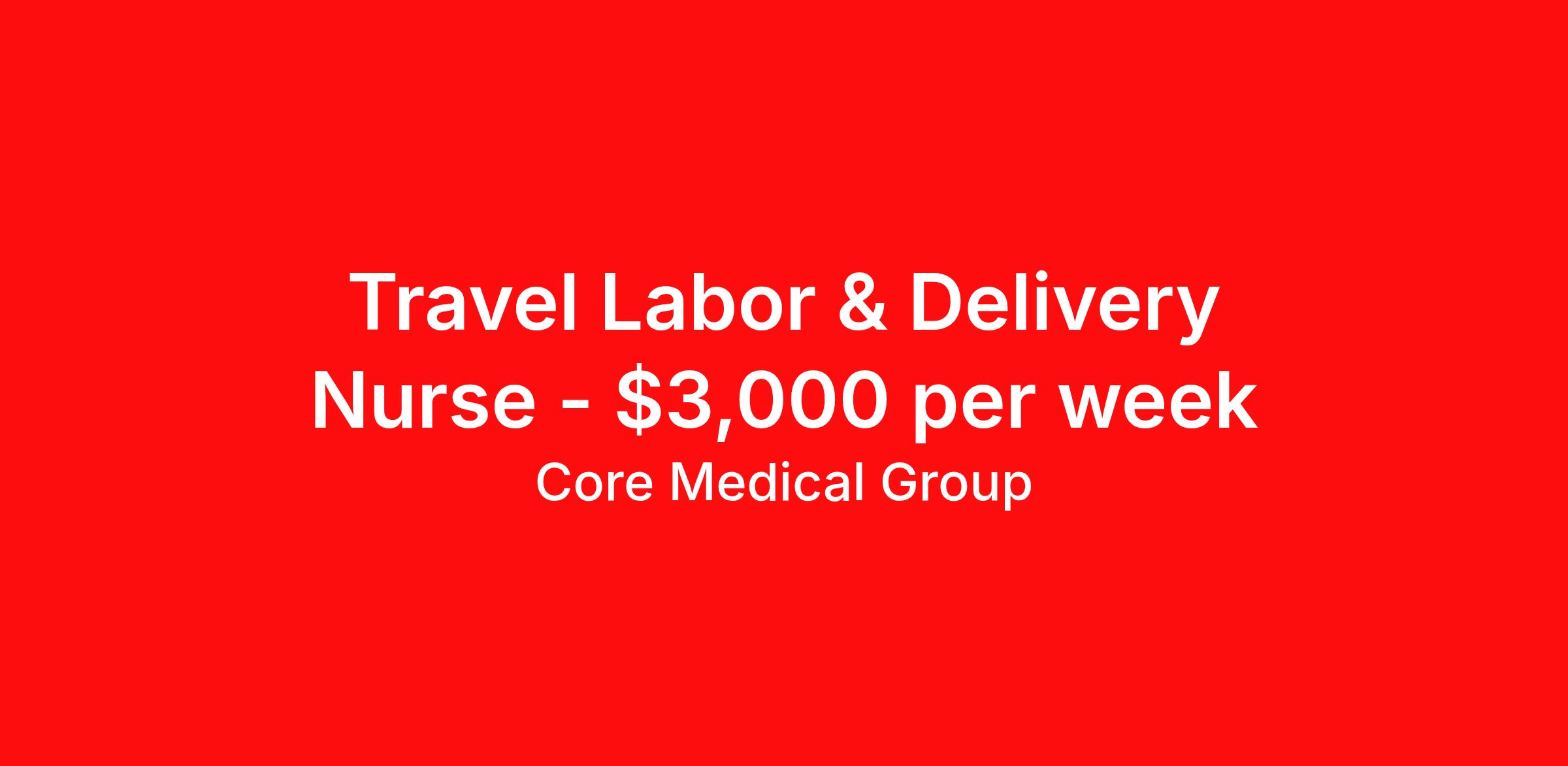 Core Medical Group is seeking a travel nurse RN Labor and Delivery for a travel nursing job in Modesto, California. Job Description & Requirements Specialty: Labor and Delivery Discipline: RN Start Date: 04/07/2026 Duration: 13 weeks 36 hours per week Shift: 12 hours Employment Type: Travel Client in CA seeking Registered Nurse: Labor & Delivery for the following shift(s): Days We are looking for a healthcare professional who is ready to provide exceptional patient care in this contract/travel role. Contract/travel assignments are typically 13 weeks, with potential to extend. Help us continue our mission to connect people, improve lives, and give back to the community by joining the CoreMedical Group team. When you work with CoreMedical Group, we put you first and treat you like family, supporting you every step of the way. CoreMedical Group is one of the largest healthcare staffing agencies in the country, with travel and contract positions located across the United States. Our recruiters will help you find the perfect job, whether it's across the country or across the street. In addition to dedicated, personalized support from your recruiter, when you work with CoreMedical Group you'll receive: Access to an extensive benefits package, including day 1 health, dental, and vision insurance, employer paid life insurance, a health reimbursement account, and more! Weekly paychecks with competitive pay packages Matching 401(k) benefits to help you save for retirement Licensure assistance and reimbursement to set you up for success on your contract Travel reimbursement and dedicated housing support while on assignment Referral cash bonuses when you connect us with other clinicians CoreMedical Group also offers you a free, all-inclusive vacation each year as our way of saying "thank you" for your hard work. Join other healthcare professionals on the annual Club CoreMed retreat and you'll see why our contract and travel professionals come back to us year after year! Your career is too valuable to tackle on your own. Let CoreMedical Group help you with your healthcare journey! *Estimate of weekly payments is intended for informational purposes and includes hourly wages, as well as reimbursements for meal & incidental expenses, and housing expenses incurred on behalf of the Company. Any benefits (medical/dental/vision) are in addition to the weekly pay. Please speak with your Recruiter for additional details. Estimated payments are subject to change until formal offer of assignment is made and accepted. Core Medical Group Job ID 1368403. Pay package is based on 12 hour shifts and 36 hours per week (subject to confirmation) with tax-free stipend amount to be determined. Posted job title: RN About Core Medical Group CoreMedical Group is one of the largest healthcare staffing agencies in the country. We have jobs nationwide in travel nursing, travel allied health, interim, locum tenens, and permanent placements! Join the staffing agency with Club CoreMed, the best perk in the industry - an all inclusive paid trip to a tropical resort! Benefits Weekly pay Holiday Pay Guaranteed Hours Continuing Education 401k retirement plan Pet insurance Company provided housing options Sick pay Wellness and fitness programs Mileage reimbursement Referral bonus Employee assistance programs Medical benefits Dental benefits Vision benefits Benefits start day 1 License and certification reimbursement Life insurance Discount program