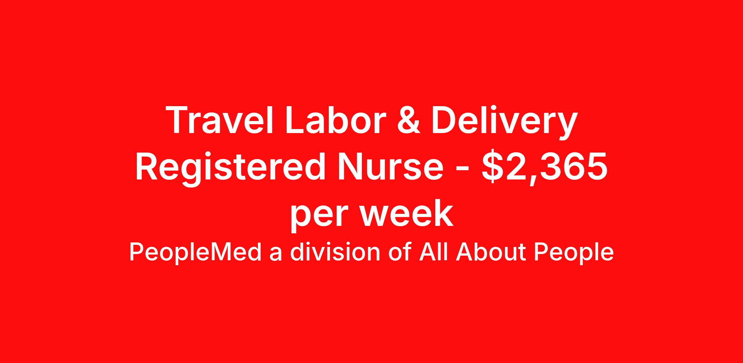 PeopleMed a division of All About People is seeking a travel nurse RN Labor and Delivery for a travel nursing job in Louisville, Kentucky. Job Description & Requirements Specialty: Labor and Delivery Discipline: RN Start Date: 04/19/2026 Duration: 13 weeks 36 hours per week Shift: 12 hours, days Employment Type: Travel Must reside 75 miles from facility for travel rate Shift: DAYS 645a-715p, every other weekend Required: BLS, ACLS, NRP, EFM, Epic experience, 2 years RN experience, KY license at time of submission PeopleMed a division of All About People Job ID 3006. Pay package is based on 12 hour shifts and 36 hours per week (subject to confirmation) with tax-free stipend amount to be determined. About PeopleMed a division of All About People PeopleMed works with the best and the brightest medical professionals developing deep relationships with every clinician on our team. We understand the demand for excellence, efficient service and timely follow up, while never compromising. We are honored to represent our registry to ensure that all of their individual needs are met every step of the way. Transparent communication and a nurse-first approach. PeopleMed offers competitive hourly rates . Potential for stipends, bonuses, overtime, and benefits (health insurance and 401(k). Flexible scheduling & work-life balance Opportunity to work in different healthcare settings (hospitals, clinics, long-term care, etc.). Dedicated recruiters and career advisors help with job placements and career advancement. Benefits 401k retirement plan