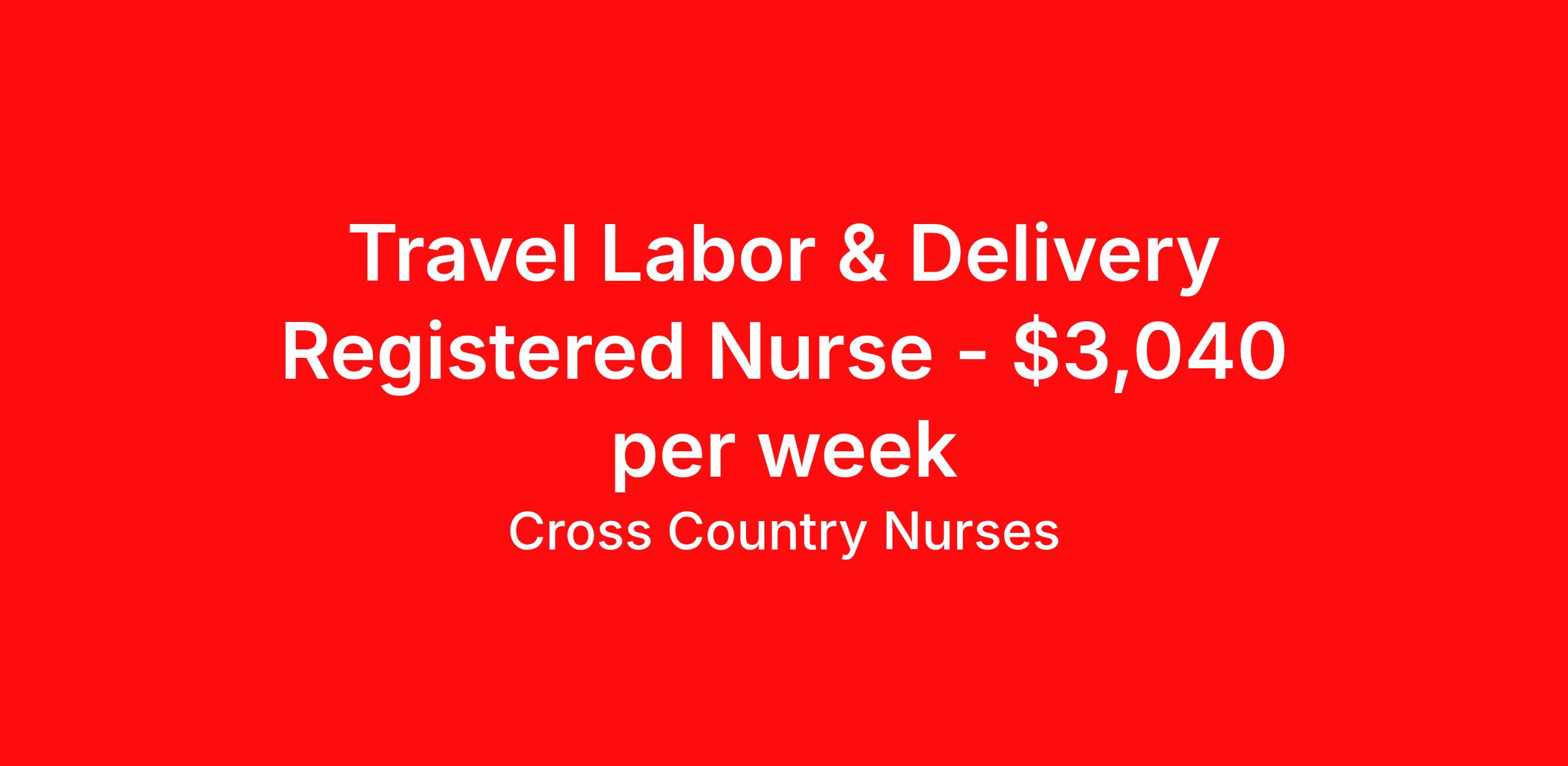Cross Country Nurses is seeking a travel nurse RN Labor and Delivery for a travel nursing job in Greenbrae, California. Job Description & Requirements Specialty: Labor and Delivery Discipline: RN Start Date: 04/06/2026 Duration: 13 weeks 36 hours per week Shift: 12 hours, nights Employment Type: Travel Job Description As a labor and delivery nurse (RN L&D), you will care for women and newborns during the antepartum, intrapartum, postpartum, and neonatal stages of childbirth. This includes coaching women throughout the birthing process, monitoring the mother's and baby's vitals, administering medication and managing potential complications that may arise. You may also be called upon to assist in caesarian sections. You will provide education and guidance to new mothers in regard to recovery and caring for their infants. Minimum Requirements At least 1 year of recent acute care experience in specialty Active RN license Benefits The benefits of taking a travel nursing job with Cross Country include: Private housing or generous housing allowance Comprehensive health insurance with prescription coverage Dependent health insurance with prescription coverage Competitive salaries Referral bonuses Travel reimbursement 401(k) retirement plan Direct deposit/free checking Unlimited free CE credits Cross Country Job ID 1235830. Pay package is based on 12 hour shifts and 36 hours per week (subject to confirmation) with tax-free stipend amount to be determined. Posted job title: Registered Nurse / Labor And Delivery Department About Cross Country Nurses You care for others — we’re here to care for you. At Cross Country, we know travel nursing is about more than just the job. It’s about building a career that supports your lifestyle, your values, and your impact. We offer competitive pay, full benefits, and 24/7 support from a team that truly understands what it means to be on the front lines. Wherever your journey takes you, we’re with you every step of the way. Let’s build your best life — one assignment at a time. Benefits 401k retirement plan Referral bonus