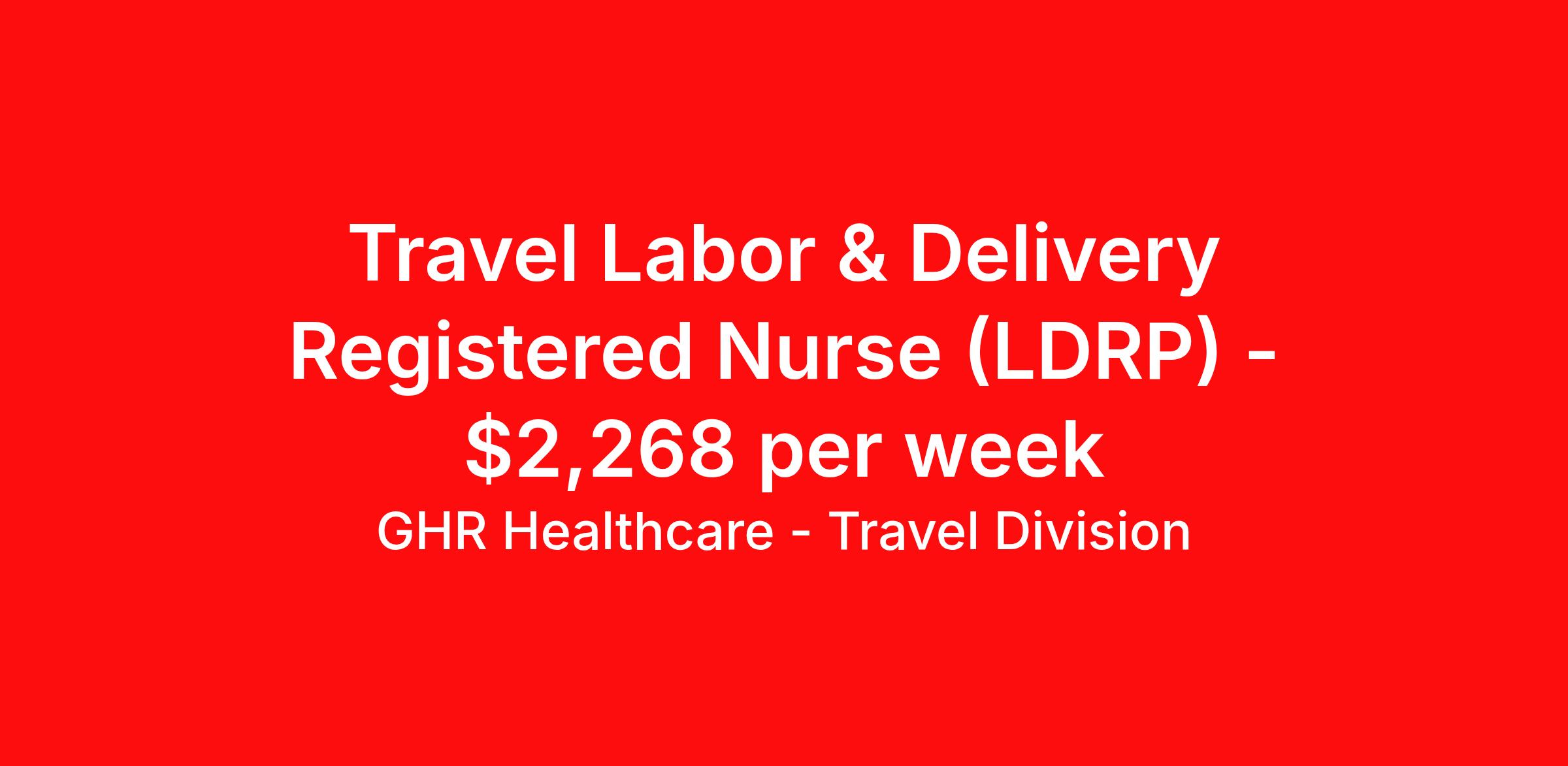 GHR Healthcare - Travel Division is seeking a travel nurse RN Labor and Delivery for a travel nursing job in Monroe, Wisconsin. Job Description & Requirements Specialty: Labor and Delivery Discipline: RN Start Date: 04/06/2026 Duration: 13 weeks 36 hours per week Shift: 12 hours Employment Type: Travel GHR Healthcare - Travel Division Job ID 76376936. Pay package is based on 12 hour shifts and 36 hours per week (subject to confirmation) with tax-free stipend amount to be determined. About GHR Healthcare - Travel Division For over 30 years, GHR Healthcare has been the bridge between healthcare professionals and the facilities that need them nationwide. We're committed to uncovering your ideal fit, supported by GHR's dedication to competitive compensation, transparent communication, and a devoted team that genuinely cares about your career journey. You can trust us to stand by your side as your advocate, confidante, and partner in advancing your career. At GHR, care and consideration are at the heart of everything we do. Visit ghrhealthcare.com to learn more.