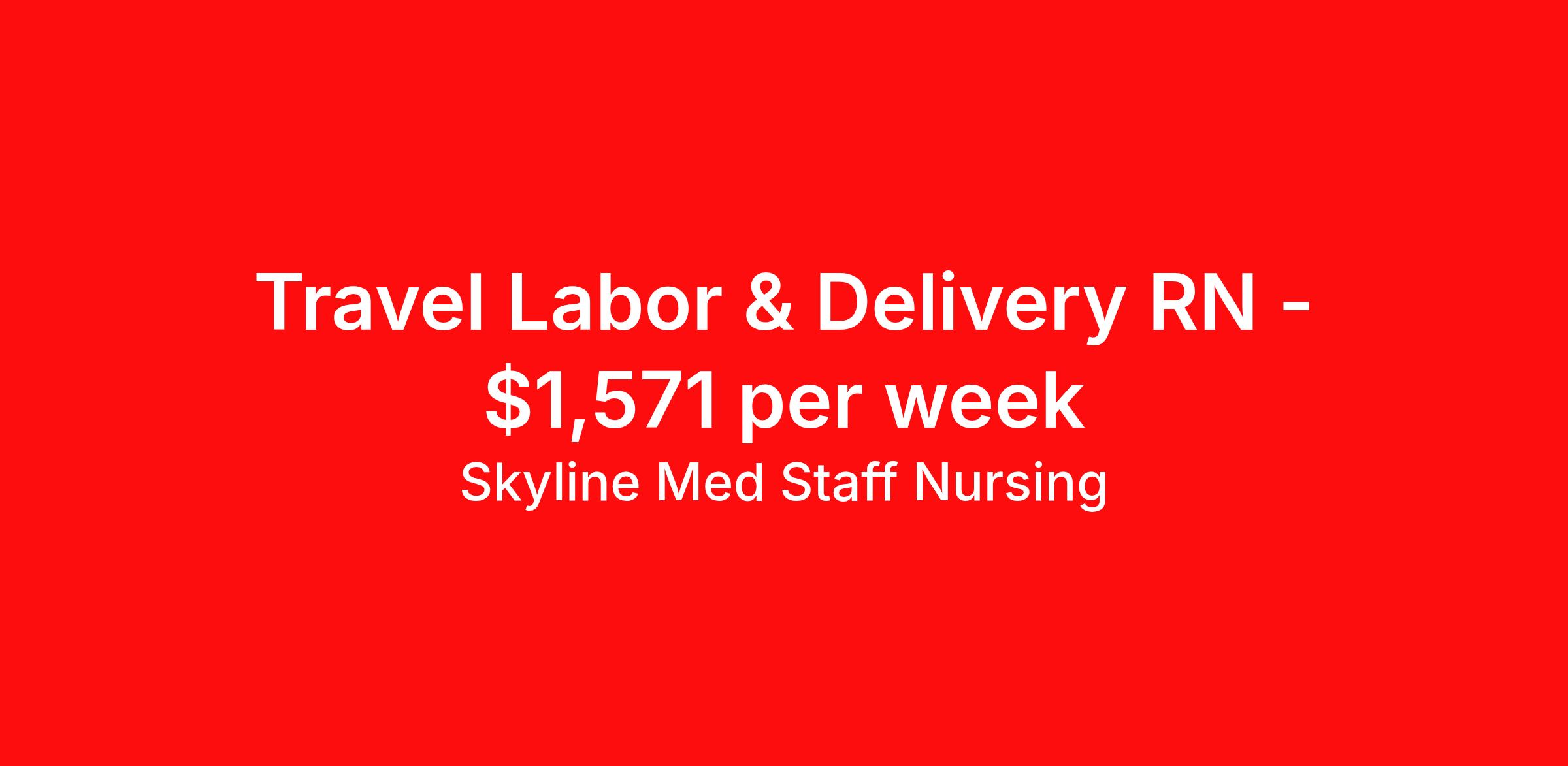 Skyline Med Staff Nursing is seeking a travel nurse RN Labor and Delivery for a travel nursing job in Birmingham, Alabama. Job Description & Requirements Specialty: Labor and Delivery Discipline: RN Start Date: 04/07/2026 Duration: 13 weeks 36 hours per week Shift: 12 hours, nights Employment Type: Travel Weekly amount stated in job postings is an estimate based on estimated hourly wage and potential stipends available for the location of the assignment. Pay package is calculated on bill rate at the time job was posted, but can change or vary without notice. Exact pay packages might vary as this is an estimate. Our recruiter would be happy to build an exact pay package for you for each job. Skyline Med Staff Nursing Job ID 36176768. Pay package is based on 12 hour shifts and 36.0 hours per week (subject to confirmation) with tax-free stipend amount to be determined. Posted job title: RN:L&D,19:00:00-07:00:00 About Skyline Med Staff Nursing Join the Top- Rated Travel Healthcare Team! Skyline Med Staff was named as the 1 Best Travel Healthcare Company in 2025 by BluePipes, a recognition driven by glowing reviews from travel healthcare professionals. Our recruiters are consistently praised on Google for their responsiveness, dedication, accessibility, and industry knowledge. Ready to experience the difference? Apply for a job today and see why healthcare professionals choose Skyline! Certified Women Owned Business We believe that travel is good for the soul. We want to be on your journey with you and find the right job that fits you Skyline Med Staff is committed to one vision treating others the way that THEY want to be treated. The executive team at Skyline Med Staff focuses on a commitment to quality, consistency, and the highest level of service. Our team members continually strive to build long term relationships that center on you and helping you achieve your goals. Some of the Benefits you will receive with Skyline Med Staff: Over 30 years of combined experience in the staffing industry Higher Take-Home Pay Rates Dedicated Personal Recruiter We are available to you 24/7 Health Insurance Plan Options Tax Free Per Diems, Housing Stipends and Travel Reimbursements Joint Commission Certified Contracts in all 50 states Referral and Loyalty Bonuses Benefits Medical benefits Referral bonus