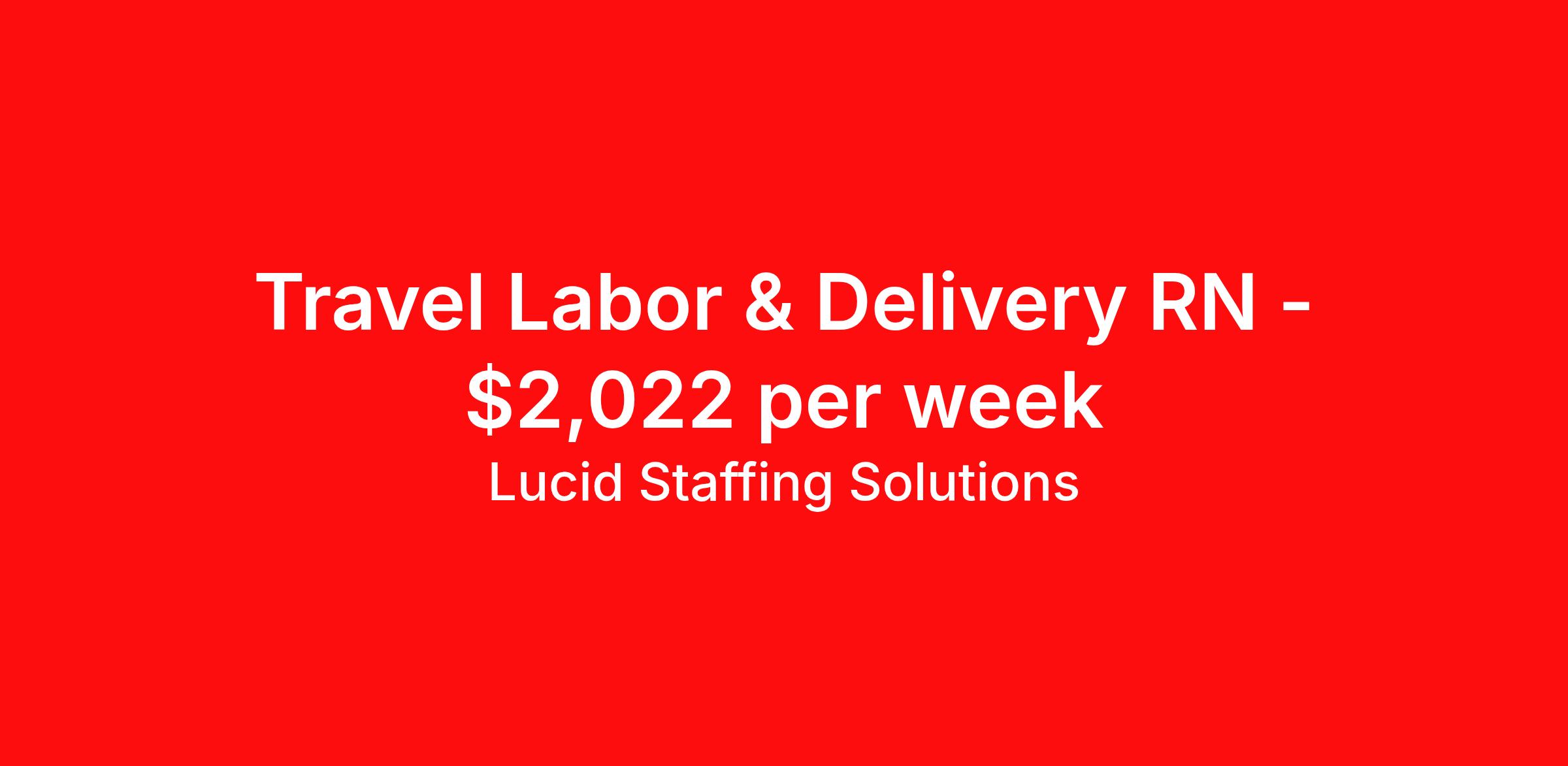 Lucid Staffing Solutions is seeking a travel nurse RN Labor and Delivery for a travel nursing job in Kokomo, Indiana. Job Description & Requirements Specialty: Labor and Delivery Discipline: RN Duration: 13 weeks 36 hours per week Shift: 12 hours, nights Employment Type: Travel Job Description Position: Travel Registered Nurse (RN) with experience in L&D Location: Kokomo, Indiana Shift: hr Night Weekly Gross: $2021.80 Lucid Staffing Solutions was created by former healthcare workers who lived the short staffing, the chaotic workflows, and the nonstop pressure that comes with patient care. We built an agency powered by real clinical experience, kept simple and supportive, so you never have to guess whether the people guiding you actually know what they’re talking about. Minimum Requirements: Active license as a Registered Nurse (RN) Licensed in Indiana (If applicable) or compact eligible Two years of recent L&D experience Active BLS Why Lucid Works for Travelers Paid Weekly: Stipends pushed to GSA limits whenever possible $500 Travel Reimbursement: Paid at the start of each assignment Clinician-Led Team: Recruiters and Account Managers with real clinical experience In-House Compliance: fast updates, real communication, and none of the delays that come with outsourced vendors. Health Coverage Options: Multiple medical plans plus dental, vision, and workers compensation 401(k) Match: 4 percent match after 6 months License & Certification Reimbursement: We help cover the cost of staying compliant Liability Insurance: Included automatically Referral Bonuses: $500 per referral, $750 after five referrals Ready to start your journey? Apply today to connect with a Clinician-Recruiter! Lucid Staffing Solutions Job ID 37959. Pay package is based on 12 hour shifts and 36 hours per week (subject to confirmation) with tax-free stipend amount to be determined. Posted job title: L&D About Lucid Staffing Solutions Clinician Owned & Operated At Lucid Staffing Solutions, we do things differently—because we’ve been in your shoes. Founded by actual healthcare professionals, Lucid was built to fix the issues we experienced as travelers. We know what makes a great assignment: competitive pay, seamless onboarding, honest recruiters, and most importantly—working with a team that truly sees and supports you. Our entire team is made up of former clinicians who understand the demands of the job and what travelers truly need to succeed. We offer some of the highest paying allied health and nursing contracts across the country, along with some amazing benefits & perks. Whether you're chasing freedom, flexible schedules, bigger paychecks, or your next adventure, Lucid helps you get there—with real support, real respect , and real healthcare experts. Benefits Dental benefits Medical benefits Vision benefits