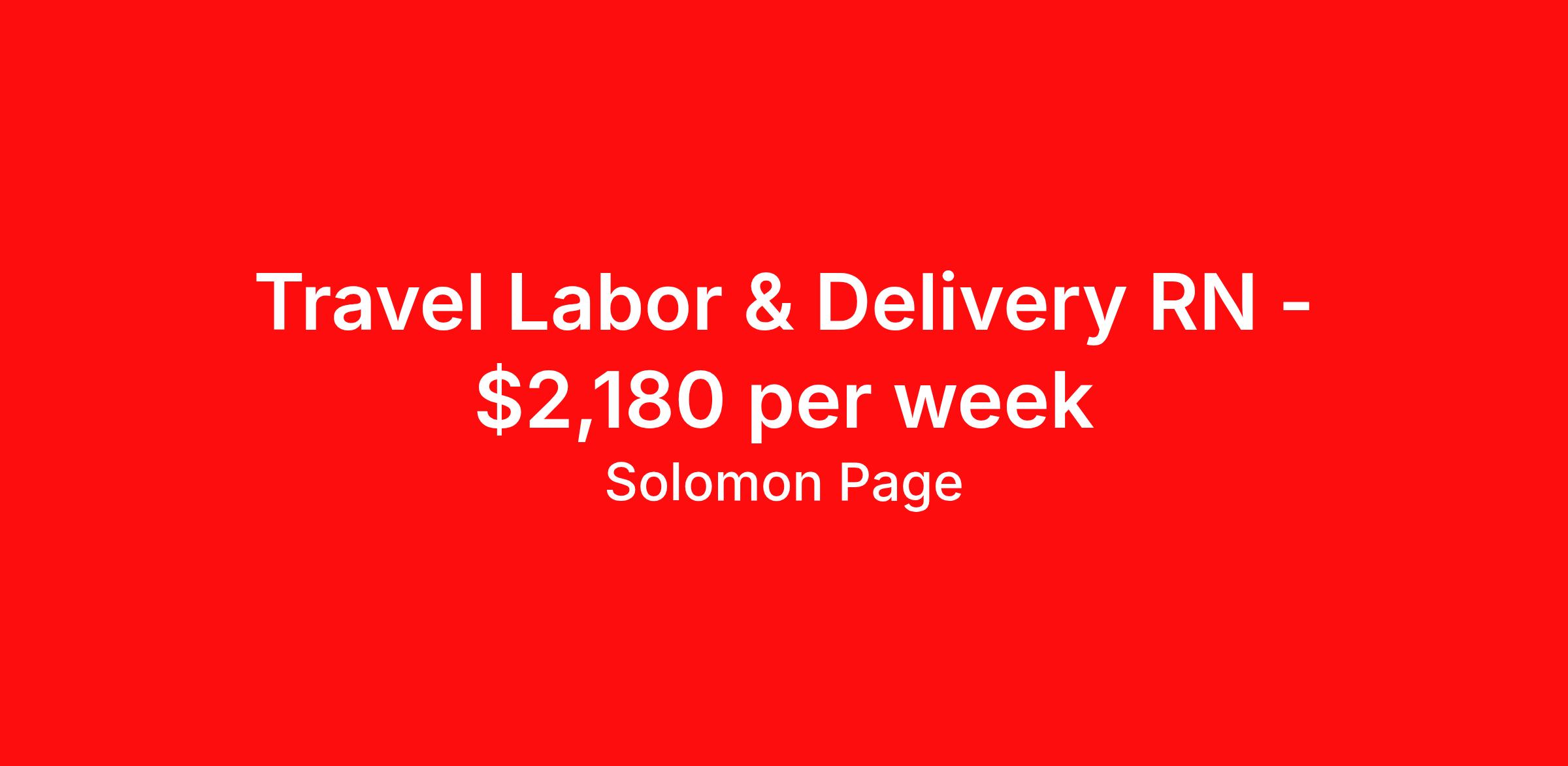 Solomon Page is seeking a travel nurse RN Labor and Delivery for a travel nursing job in Albany, Georgia. Job Description & Requirements Specialty: Labor and Delivery Discipline: RN Start Date: 04/13/2026 Duration: 17 weeks 36 hours per week Shift: 12 hours, days Employment Type: Travel Our client is looking to add a Registered Nurse to their team. Job Details: Location: Albany, Georgia Duration: 17 Weeks Start Date: 04/13/2026 Shift: 3x12 Days Estimated Gross Weekly Pay: 2180 Qualifications: Current Georgia license Excellent interpersonal skills including patience, empathy, and compassion Effective communication skills, including active listening, writing, speaking and reading comprehension Fast and adaptive problem-solving abilities Ability to stand for long periods of time If you meet the required qualifications and are interested in this role, please apply today. Why Work with Us The success of Solomon Page is defined by our people. Offering a comprehensive benefits package, travel nurses have immediate access to medical coverage and ReviveHealth virtual care. Additionally, you are offered access to dental and vision coverage, commuter benefits, a 401(k) plan, flexible spending, referral bonuses, ongoing training, and more. As an ESOP company, Solomon Page offers an employee stock ownership plan to all consultants. As a member of our traveler community, you will join a nurturing culture that fosters your career goals. Solomon Page can connect you with your next opportunity – whether it is in your hometown, or you are looking to travel to a new destination. About Solomon Page Healthcare & Medical Staffing Accredited by the Joint Commission with the Gold Seal of Approval, Solomon Page prides ourselves in developing long-term relationships with healthcare providers based on trust and respect. Our experienced Healthcare and Medical Staffing experts are committed to providing safe and quality patient care through our wide network of travel nurses, locum tenens, and allied resources. For more information and additional healthcare opportunities, visit: solomonpage.com and connect with Solomon Page on Instagram, Facebook, Twitter, LinkedIn, and TikTok. Solomon Page Job ID 432540. Pay package is based on 12 hour shifts and 36 hours per week (subject to confirmation) with tax-free stipend amount to be determined. Posted job title: nurse - rn - labor and delivery / l&d | albany, georgia About Solomon Page Founded in 1990, Solomon Page has grown to be a leader in the staffing industry. As a member of our healthcare provider community, you will join a nurturing culture that fosters your career goals. We have the network and resources to connect you with your next opportunity – whether it is in your hometown, or you are looking to travel to a new destination. Accredited by the Joint Commission with the Gold Seal of Approval, Solomon Page prides itself in developing long-term relationships with healthcare providers based on trust and respect. Headquartered in New York with offices throughout the United States our experienced healthcare and medical staffing experts are committed to providing safe and quality patient care through our wide network of travel nurses, locum tenens, and allied resources. For more information and additional healthcare opportunities, visit: solomonpage.com /healthcare and connect with us on Facebook , Twitter , Instagram , Tik Tok , and LinkedIn. ReviveHealth Virtual Care: Available immediately. Receive free, 100% company paid, virtual care access. Upon commencement of your employment, Solomon Page offers automatic enrollment into ReviveHealth, which offers concierge, membership-based access to virtual primary care, urgent care, mental health therapy, a vision program, and prescription medications. Medical Coverage : Available immediately . Whether you are looking to enroll in single or family insurance, you have immediate access to quality coverage. Dental Coverage : Available the 1st of the month after your hire date . We offer dental insurance to you and your dependents. Vision Coverage : Available the 1st of the month after your hire date . We offer vision insurance to you and your dependents. Commuter Benefits: Available the 1st of the month after your hire date . Set aside pre-tax money to pay for public transportation. 401K Plan: Associates can enroll in the 401K plan after they have worked 1000 hours. ESOP Benefits: As an ESOP company, Solomon Page offers an employee stock ownership plan. Referral Bonus: A cash bonus is offered for referring a candidate to Solomon Page who gets placed. Training & Support: Training programs and ongoing career coaching and support is offered to consultants. Benefits Medical benefits Dental benefits Vision benefits 401k retirement plan Referral bonus