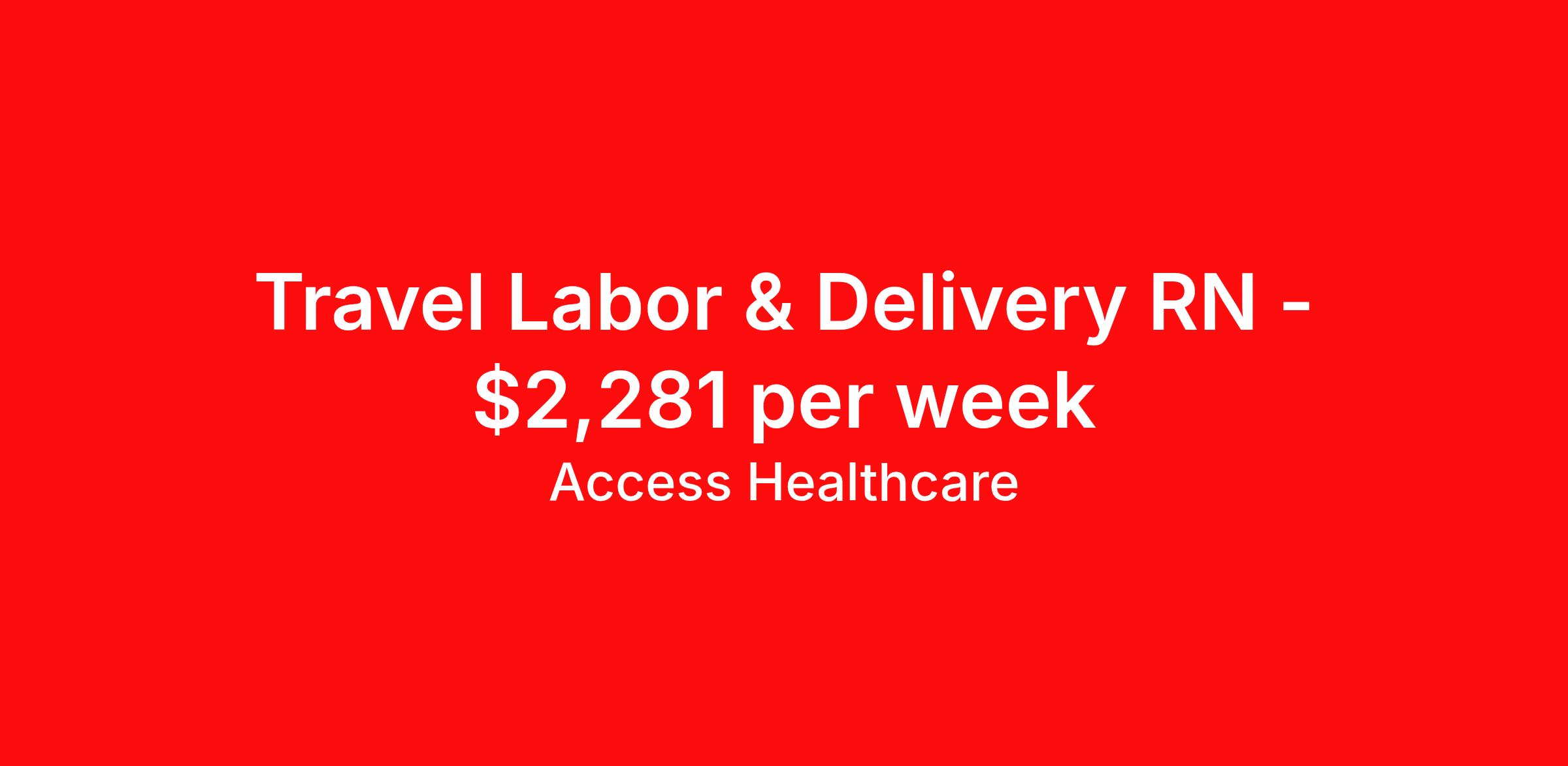 Access Healthcare is seeking a travel nurse RN Labor and Delivery for a travel nursing job in Albany, Georgia. Job Description & Requirements Specialty: Labor and Delivery Discipline: RN Start Date: 03/30/2026 Duration: 17 weeks 36 hours per week Shift: 12 hours, nights Employment Type: Travel Access Healthcare Job ID 76328881. Pay package is based on 12 hour shifts and 36 hours per week (subject to confirmation) with tax-free stipend amount to be determined. About Access Healthcare Access Healthcare aims to provide superior service to our nursing family by providing around the clock support, competitive pay packages and an unmatched benefits package! Unlike other agencies, we offer a true family feel and work with you to find the placement that is right for you. We offer one of the top leading pay packages in the industry and we are ready to get you the money you deserve! Access Healthcare was founded by two travel nurses, Danielle and Diego, who had a dream and a shared vision of creating an agency which all nurses would want to work with. Our passion has led us to where we are today as one of the top 10 agencies in our home state of New Jersey, with access to contracts in all 50 states! We encourage you to join our team and we cannot wait to get to know you!
