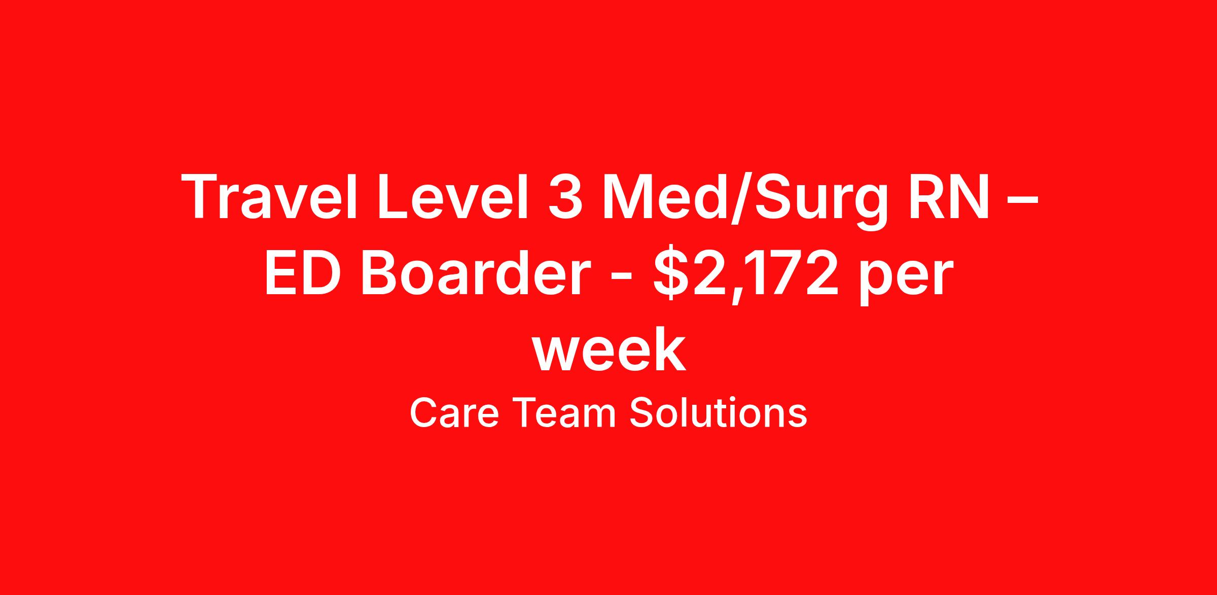 Care Team Solutions is seeking a travel nurse RN ED - Emergency Department Med Surg for a travel nursing job in Rochester, New York. Job Description & Requirements Specialty: ED - Emergency Department Discipline: RN Start Date: 04/13/2026 Duration: 13 weeks 36 hours per week Shift: 12 hours Employment Type: Travel Registered Nurse must have 2 years of recent experience in particular specialty Details: Must Have 2 Years of recent Emergency Room experience. Specialty: Emergency Room Discipline: Registered Nurse Start Date: 2026-04-13 Duration: 13 Weeks Shift: 12 Hours Day shift Hours Per Week: 36 Hours Employment Type: Contract Gross Weekly Pay: $2171.51 Six things that won’t happen if you apply to this job: You won’t have to guess what the downsides are. We’ll tell you up front. You won’t show up on day 1 and find out this is not what you signed up for. We won't leave your phone call ringing when it's inconvenient. Business hours for you are business hours for us. You won’t get shuffled to some customer service rep when a problem pops up. If we screw up something in securing your placement, we'll own it. That means it's on us to make it right. You won’t figure out your credentials alone. Our credentialing experts will walk you through it step by step. We've talked to thousands of travel nurses like you. We know you want good pay. You want to choose when you work. But the one thing nurse after nurse has said they want and don't have is someone in their corner. There's a lot in this business that’s messed up. We’re trying to be the people that fix it. You and every nurse with the guts to travel deserve it. We've worked hard for you to enjoy some one-of-a-kind benefits you'll not likely find anywhere else, because they benefit you more than they benefit us: Our early pay program Student loan reimbursement Free well-being tele-visits with a psychologist Care Team Solutions Job ID 587256. Pay package is based on 12 hour shifts and 36 hours per week (subject to confirmation) with tax-free stipend amount to be determined. Posted job title: SMH Level 3 RN Med/Surg - ED Boarder About Care Team Solutions Two brothers who give an enormous damn. We're Justin and Kyle. Neither of us are nurses. It doesn’t take a nurse to see that the way travel nurses are treated sucks. Nursing is already hard enough. Travel nursing takes serious guts. You get the toughest assignments in places you’ve never been. Which can be fun, but it’s also stressful. You’re in your element but outside of your hometown. You can be a stranger on the team. If anyone deserves someone in their corner, it’s you. But that’s not how most agencies operate. Which is why travel nurses hate working with them. We got into this business because we saw bucket-loads of nurses moving through the "churn and burn" travel machinery. We absolutely hate that. You'll do your best work when you have the placements you want and feel fully supported in your work. We pay our people well because we want them to treat you well. Our recruiters are amazing (we picked each of them ourselves), but if you've got a problem too big for them, they can come straight to us. We work like ten feet away. The "Churners and Burners" promise you the same benefits. They might as well copy/paste them from each other. We have them too: 401k, holiday pay, healthcare, dental, travel reimbursement, etc But we've worked hard for you to enjoy some one-of-a-kind benefits you'll not likely find anywhere else, because they benefit you more than they benefit us: Our early pay program Student loan reimbursement Free well-being tele-visits with a psychologist Benefits Weekly pay Holiday Pay Guaranteed Hours 401k retirement plan Wellness and fitness programs Referral bonus Medical benefits Dental benefits Vision benefits School loan reimbursement