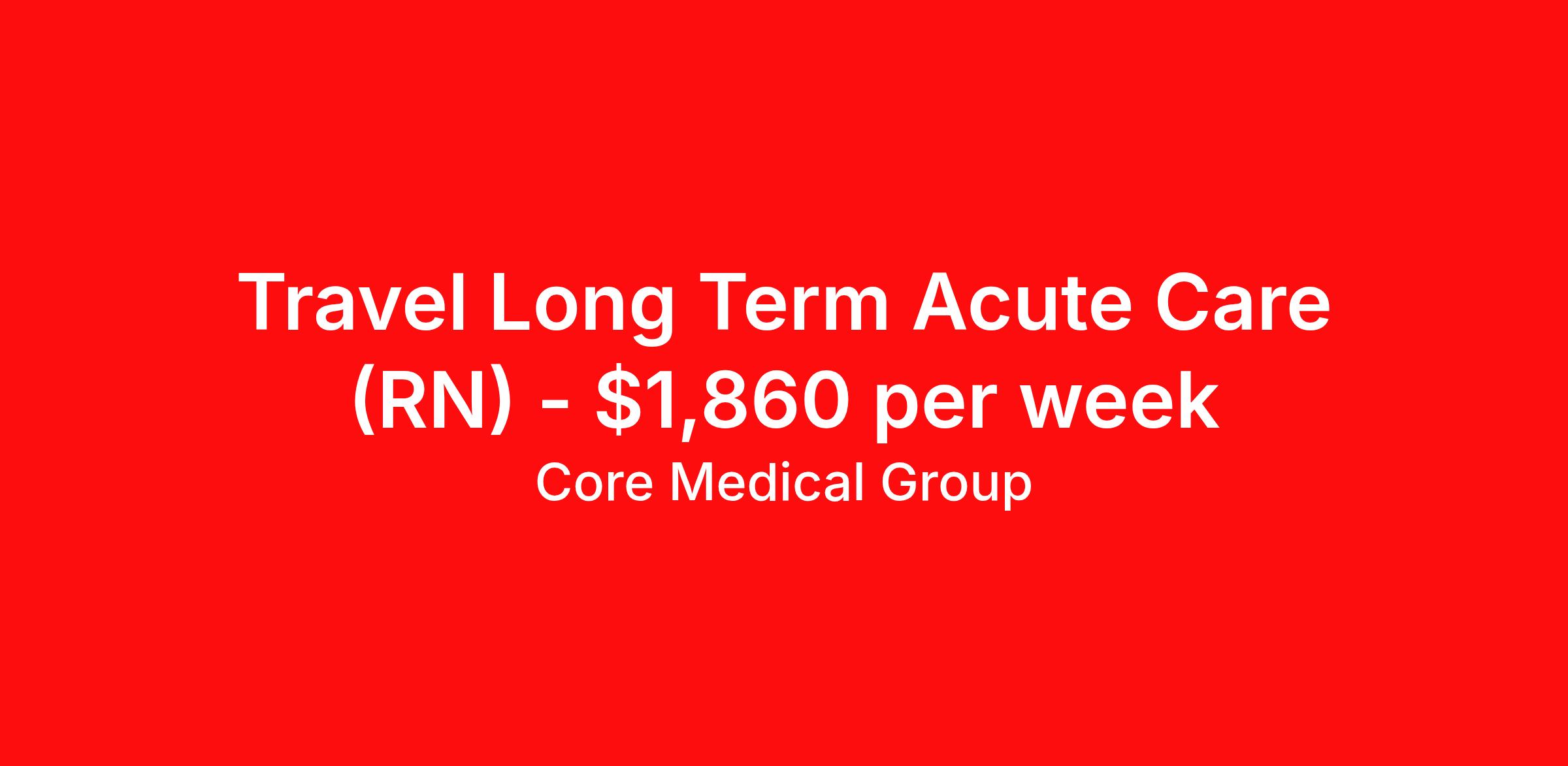 Core Medical Group is seeking a travel nurse RN Long Term Acute Care for a travel nursing job in Memphis, Tennessee. Job Description & Requirements Specialty: Long Term Acute Care Discipline: RN Start Date: ASAP Duration: 13 weeks 36 hours per week Shift: 12 hours Employment Type: Travel Client in TN seeking Registered Nurse: LTAC / Long-Term Acute Care for the following shift(s): Nights We are looking for a healthcare professional who is ready to provide exceptional patient care in this contract/travel role. Contract/travel assignments are typically 13 weeks, with potential to extend. Help us continue our mission to connect people, improve lives, and give back to the community by joining the CoreMedical Group team. When you work with CoreMedical Group, we put you first and treat you like family, supporting you every step of the way. CoreMedical Group is one of the largest healthcare staffing agencies in the country, with travel and contract positions located across the United States. Our recruiters will help you find the perfect job, whether it's across the country or across the street. In addition to dedicated, personalized support from your recruiter, when you work with CoreMedical Group you'll receive: Access to an extensive benefits package, including day 1 health, dental, and vision insurance, employer paid life insurance, a health reimbursement account, and more! Weekly paychecks with competitive pay packages Matching 401(k) benefits to help you save for retirement Licensure assistance and reimbursement to set you up for success on your contract Travel reimbursement and dedicated housing support while on assignment Referral cash bonuses when you connect us with other clinicians CoreMedical Group also offers you a free, all-inclusive vacation each year as our way of saying "thank you" for your hard work. Join other healthcare professionals on the annual Club CoreMed retreat and you'll see why our contract and travel professionals come back to us year after year! Your career is too valuable to tackle on your own. Let CoreMedical Group help you with your healthcare journey! *Estimate of weekly payments is intended for informational purposes and includes hourly wages, as well as reimbursements for meal & incidental expenses, and housing expenses incurred on behalf of the Company. Any benefits (medical/dental/vision) are in addition to the weekly pay. Please speak with your Recruiter for additional details. Estimated payments are subject to change until formal offer of assignment is made and accepted. Core Medical Group Job ID 1356457. Pay package is based on 12 hour shifts and 36 hours per week (subject to confirmation) with tax-free stipend amount to be determined. Posted job title: RN About Core Medical Group CoreMedical Group is one of the largest healthcare staffing agencies in the country. We have jobs nationwide in travel nursing, travel allied health, interim, locum tenens, and permanent placements! Join the staffing agency with Club CoreMed, the best perk in the industry - an all inclusive paid trip to a tropical resort! Benefits Weekly pay Holiday Pay Guaranteed Hours Continuing Education 401k retirement plan Pet insurance Company provided housing options Sick pay Wellness and fitness programs Mileage reimbursement Referral bonus Employee assistance programs Medical benefits Dental benefits Vision benefits Benefits start day 1 License and certification reimbursement Life insurance Discount program