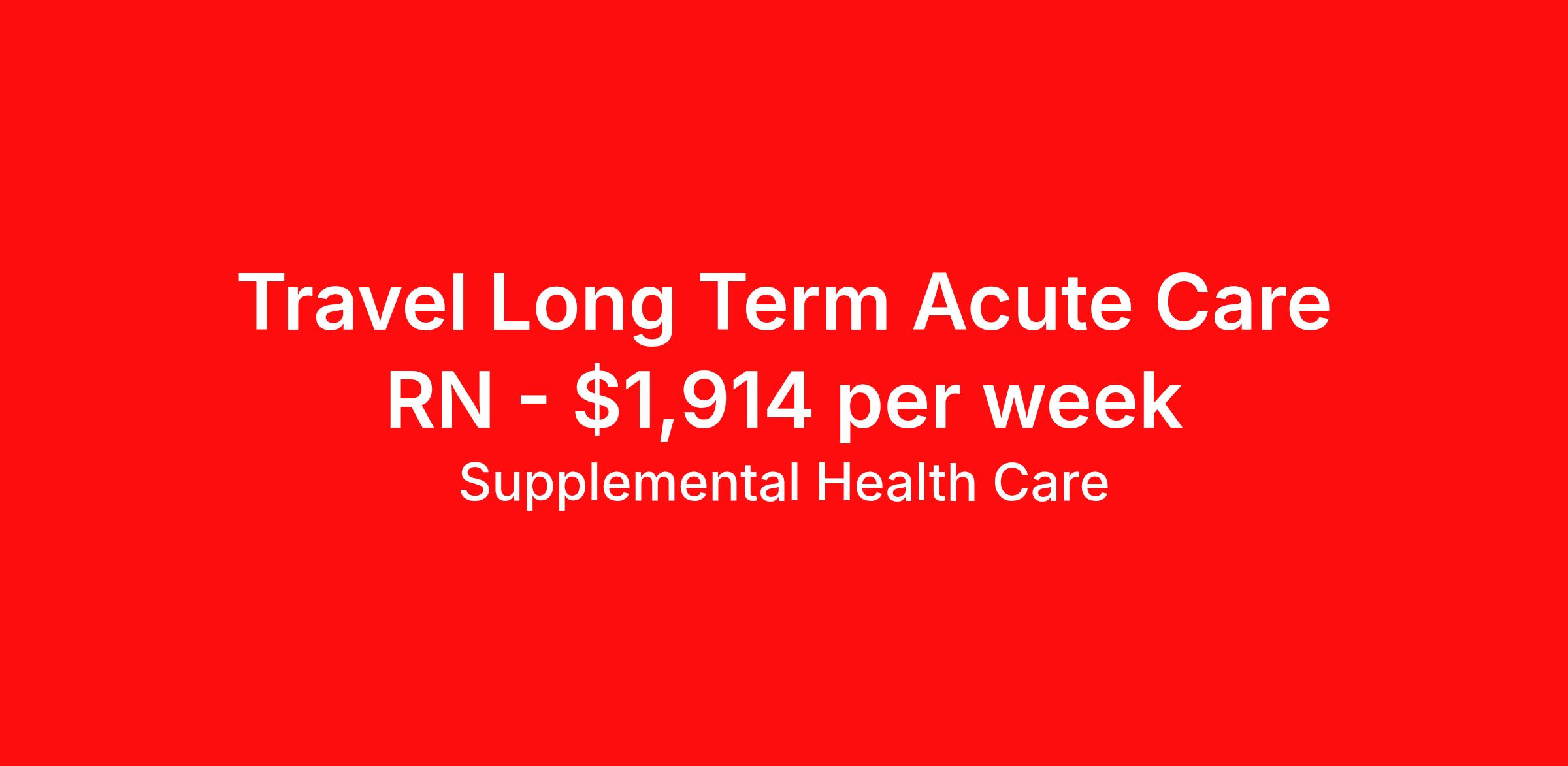 Supplemental Health Care is seeking a travel nurse RN Long Term Acute Care for a travel nursing job in Tucson, Arizona. Job Description & Requirements Specialty: Long Term Acute Care Discipline: RN Start Date: ASAP Duration: 13 weeks 36 hours per week Shift: 12 hours, days Employment Type: Travel Job Description: Supplemental Health Care is hiring Registered Nurses for contract assignments at a partnering Long Term Acute Care Facility in Tucson, Arizona. Whether you’re looking to travel or stay local, we’re committed to helping LTAC RNs find the right fit with top hospitals across the country. With more than 40 years of experience in healthcare staffing, Supplemental Health Care offers reliable support, competitive pay, and great benefits every step of the way. Qualifications: Active Arizona RN License or Compact State Nursing License 2 years of recent clinical nursing experience Previous LTAC experience preferred American Heart Association BLS ACLS preferred LTAC RN Contract Details $1,728 - $1,914 per week* AM shift available 13-week contract with possibility of extension RN will provide nursing care within their scope of practice and in accordance with the standards of the facility *Estimated weekly payment may include both taxable wages and tax-free reimbursements for meals, housing, and incidentals. Please speak with a recruiter for details. The average stay at an LTAC facility is 25 days and RNs working there often care for their patients from admission to discharge. We understand that you make important connections with your patients and offer the support you need while on assignment to provide the best care possible. Apply today to get started with this Registered Nurse contract opportunity, or talk to our team about the full range of RN opportunities available. What We Offer: Full medical, dental, vision, life, and even pet insurance! Round the clock support. No matter where you are or what time it is, Supplemental Health Care is standing by. SHC's Share the Care referral program is the most dynamic, profitable referral program in the industry. 401(k) Retirement Savings Program with a wide range of investment options. Discounted and free online access to CEU courses through Supplemental University. Supplemental Health Care is an Equal Opportunity Employer. All candidates, including veterans and those with disabilities, are encouraged to apply. SHC will consider for employment qualified applicants with criminal histories in a manner consistent with the requirements of applicable local, state, or federal law. To learn more, visit www.shccares.com/eeo Supplemental Health Care Job ID 1488953. Pay package is based on 12 hour shifts and 36 hours per week (subject to confirmation) with tax-free stipend amount to be determined. Posted job title: LTAC RN - Registered Nurse About Supplemental Health Care At Supplemental Health Care, a simple belief in the power of caring guides a unique commitment to world-class service in healthcare staffing. For 40 years, we’ve supported talented professionals pursuing their life calling in hospitals, schools, home health, corrections, behavioral health, and other settings. At SHC, we inspire vital connections and enrich lives and inspire better outcomes. As recipients of the Best in Staffing Awards for both Client and Talent, Supplemental Health Care is proud to be among only 2% of staffing companies singled out for the distinction based on the real feedback of our employees and the clients we serve. SHC has also earned The Joint Commission’s Gold Seal of Approval and is named among the Largest Health Care Staffing companies in the United States by Staffing Industry Analysts. We are also thrilled to recognize our very own SLP, Dr. Kelly Byrd as the American Staffing Association 2024 National Staffing Employee of the Year and Health Care Sector All-Star. We’re honored to connect Dr. Byrd to employment, share her incredible story, and support her family literacy nonprofit. For everyone that we serve, SHC is the place where caring hearts thrive. Benefits Referral bonus Benefits start day 1 401k retirement plan Continuing Education Discount program Health savings account