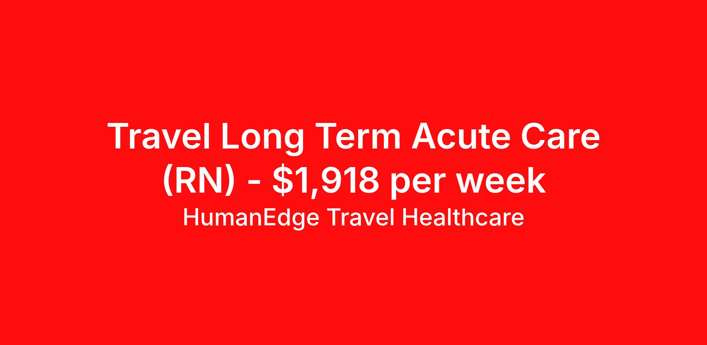 HumanEdge Travel Healthcare is seeking a travel nurse RN Long Term Acute Care for a travel nursing job in Cincinnati, Ohio. Job Description & Requirements Specialty: Long Term Acute Care Discipline: RN Duration: 13 weeks 36 hours per week Shift: 12 hours, nights Employment Type: Travel HumanEdge Travel Healthcare Job ID 17-796616. Pay package is based on 12 hour shifts and 36 hours per week (subject to confirmation) with tax-free stipend amount to be determined. About HumanEdge Travel Healthcare HumanEdge Allied Health is a full-service nursing and allied health staffing agency that has lived and breathed staffing for more than 30 years, making us one of the most trusted in the industry!