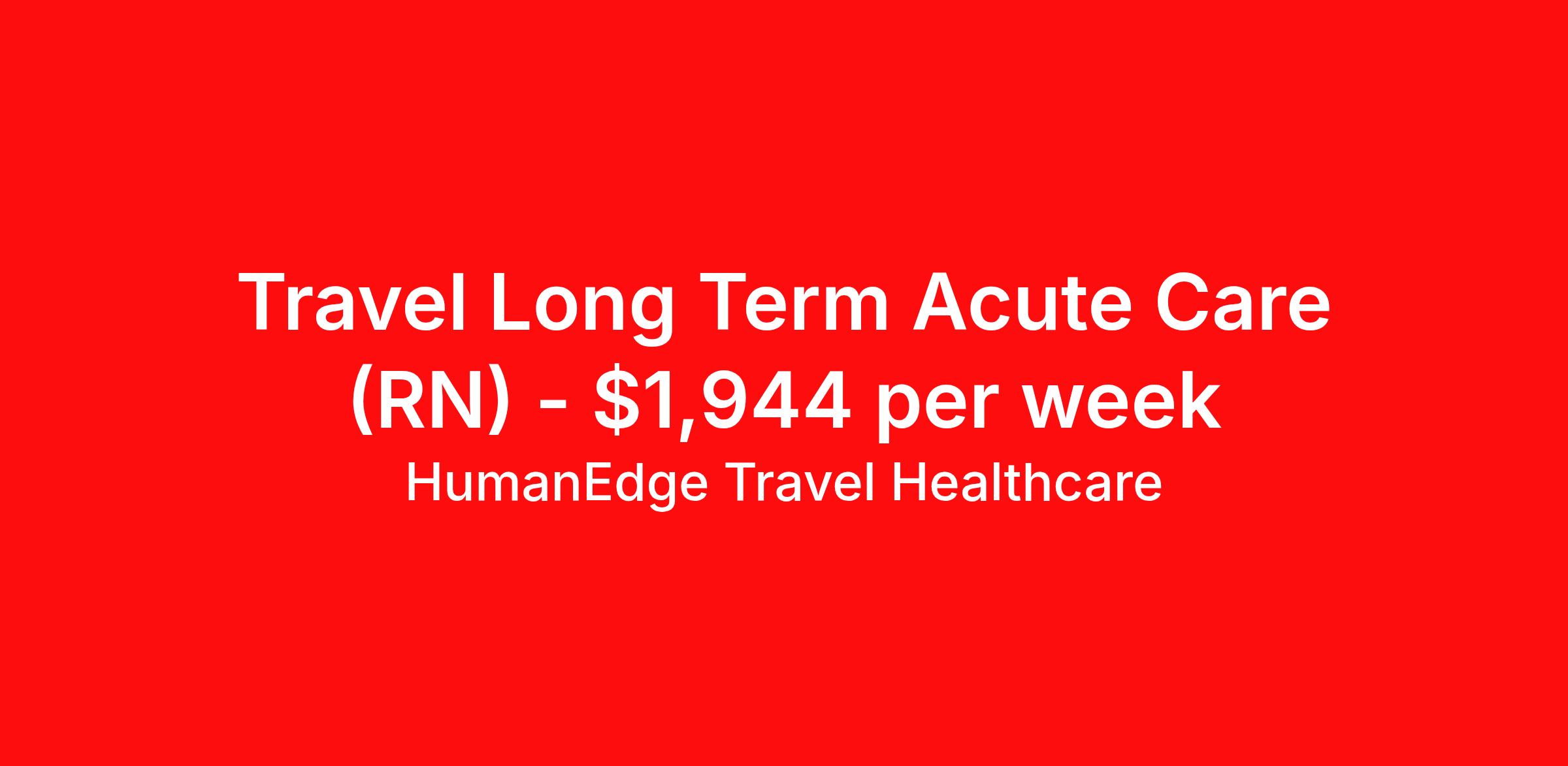 HumanEdge Travel Healthcare is seeking a travel nurse RN Long Term Acute Care for a travel nursing job in Scottsdale, Arizona. Job Description & Requirements Specialty: Long Term Acute Care Discipline: RN Duration: 52 weeks 36 hours per week Shift: 12 hours, nights Employment Type: Travel HumanEdge Travel Healthcare Job ID 17-797320. Pay package is based on 12 hour shifts and 36 hours per week (subject to confirmation) with tax-free stipend amount to be determined. About HumanEdge Travel Healthcare HumanEdge Allied Health is a full-service nursing and allied health staffing agency that has lived and breathed staffing for more than 30 years, making us one of the most trusted in the industry!