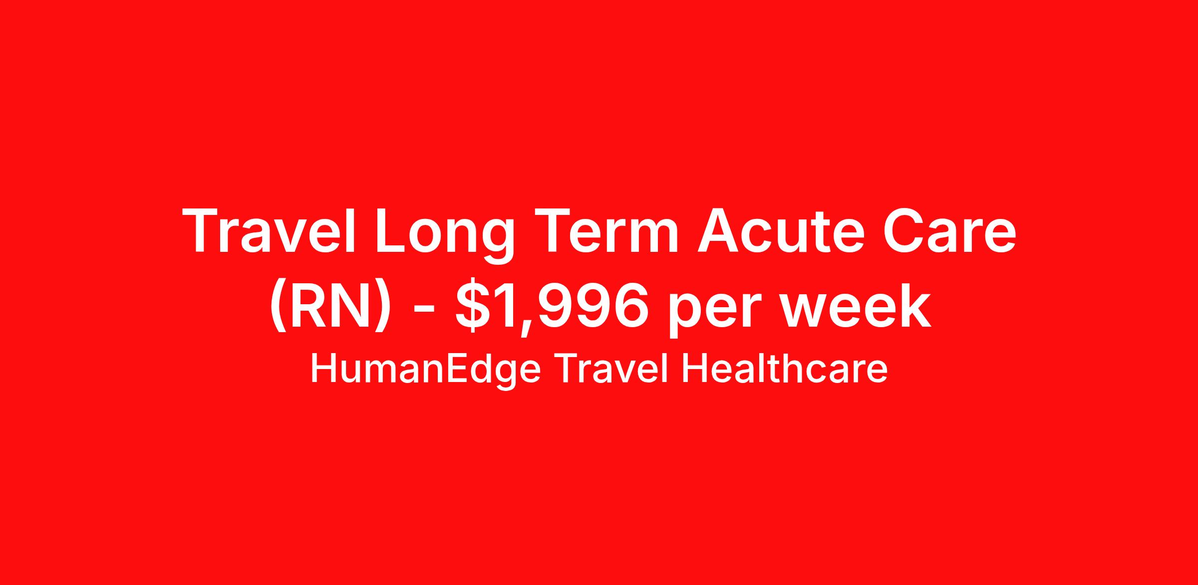 HumanEdge Travel Healthcare is seeking a travel nurse RN Long Term Acute Care for a travel nursing job in Canton, Ohio. Job Description & Requirements Specialty: Long Term Acute Care Discipline: RN Duration: 13 weeks 36 hours per week Shift: 12 hours, nights Employment Type: Travel HumanEdge Travel Healthcare Job ID 17-797411. Pay package is based on 12 hour shifts and 36 hours per week (subject to confirmation) with tax-free stipend amount to be determined. About HumanEdge Travel Healthcare HumanEdge Allied Health is a full-service nursing and allied health staffing agency that has lived and breathed staffing for more than 30 years, making us one of the most trusted in the industry!