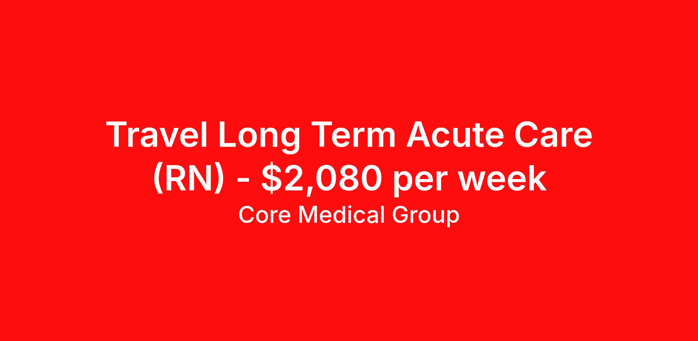 Core Medical Group is seeking a travel nurse RN Long Term Acute Care for a travel nursing job in Des Moines, Iowa. Job Description & Requirements Specialty: Long Term Acute Care Discipline: RN Start Date: 03/21/2026 Duration: 13 weeks 36 hours per week Shift: 12 hours Employment Type: Travel Client in IA seeking Registered Nurse: LTAC / Long-Term Acute Care for the following shift(s): Days We are looking for a healthcare professional who is ready to provide exceptional patient care in this contract/travel role. Contract/travel assignments are typically 13 weeks, with potential to extend. Help us continue our mission to connect people, improve lives, and give back to the community by joining the CoreMedical Group team. When you work with CoreMedical Group, we put you first and treat you like family, supporting you every step of the way. CoreMedical Group is one of the largest healthcare staffing agencies in the country, with travel and contract positions located across the United States. Our recruiters will help you find the perfect job, whether it's across the country or across the street. In addition to dedicated, personalized support from your recruiter, when you work with CoreMedical Group you'll receive: Access to an extensive benefits package, including day 1 health, dental, and vision insurance, employer paid life insurance, a health reimbursement account, and more! Weekly paychecks with competitive pay packages Matching 401(k) benefits to help you save for retirement Licensure assistance and reimbursement to set you up for success on your contract Travel reimbursement and dedicated housing support while on assignment Referral cash bonuses when you connect us with other clinicians CoreMedical Group also offers you a free, all-inclusive vacation each year as our way of saying "thank you" for your hard work. Join other healthcare professionals on the annual Club CoreMed retreat and you'll see why our contract and travel professionals come back to us year after year! Your career is too valuable to tackle on your own. Let CoreMedical Group help you with your healthcare journey! *Estimate of weekly payments is intended for informational purposes and includes hourly wages, as well as reimbursements for meal & incidental expenses, and housing expenses incurred on behalf of the Company. Any benefits (medical/dental/vision) are in addition to the weekly pay. Please speak with your Recruiter for additional details. Estimated payments are subject to change until formal offer of assignment is made and accepted. Core Medical Group Job ID 1363720. Pay package is based on 12 hour shifts and 36 hours per week (subject to confirmation) with tax-free stipend amount to be determined. Posted job title: RN About Core Medical Group CoreMedical Group is one of the largest healthcare staffing agencies in the country. We have jobs nationwide in travel nursing, travel allied health, interim, locum tenens, and permanent placements! Join the staffing agency with Club CoreMed, the best perk in the industry - an all inclusive paid trip to a tropical resort! Benefits Weekly pay Holiday Pay Guaranteed Hours Continuing Education 401k retirement plan Pet insurance Company provided housing options Sick pay Wellness and fitness programs Mileage reimbursement Referral bonus Employee assistance programs Medical benefits Dental benefits Vision benefits Benefits start day 1 License and certification reimbursement Life insurance Discount program