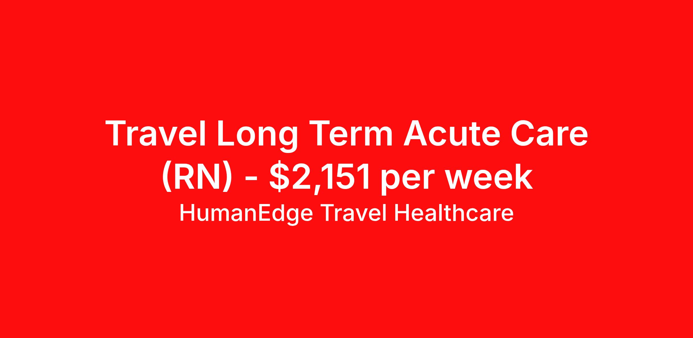 HumanEdge Travel Healthcare is seeking a travel nurse RN Long Term Acute Care for a travel nursing job in Madison, Wisconsin. Job Description & Requirements Specialty: Long Term Acute Care Discipline: RN Duration: 13 weeks 36 hours per week Shift: 12 hours, nights Employment Type: Travel HumanEdge Travel Healthcare Job ID 17-795908. Pay package is based on 12 hour shifts and 36 hours per week (subject to confirmation) with tax-free stipend amount to be determined. About HumanEdge Travel Healthcare HumanEdge Allied Health is a full-service nursing and allied health staffing agency that has lived and breathed staffing for more than 30 years, making us one of the most trusted in the industry!