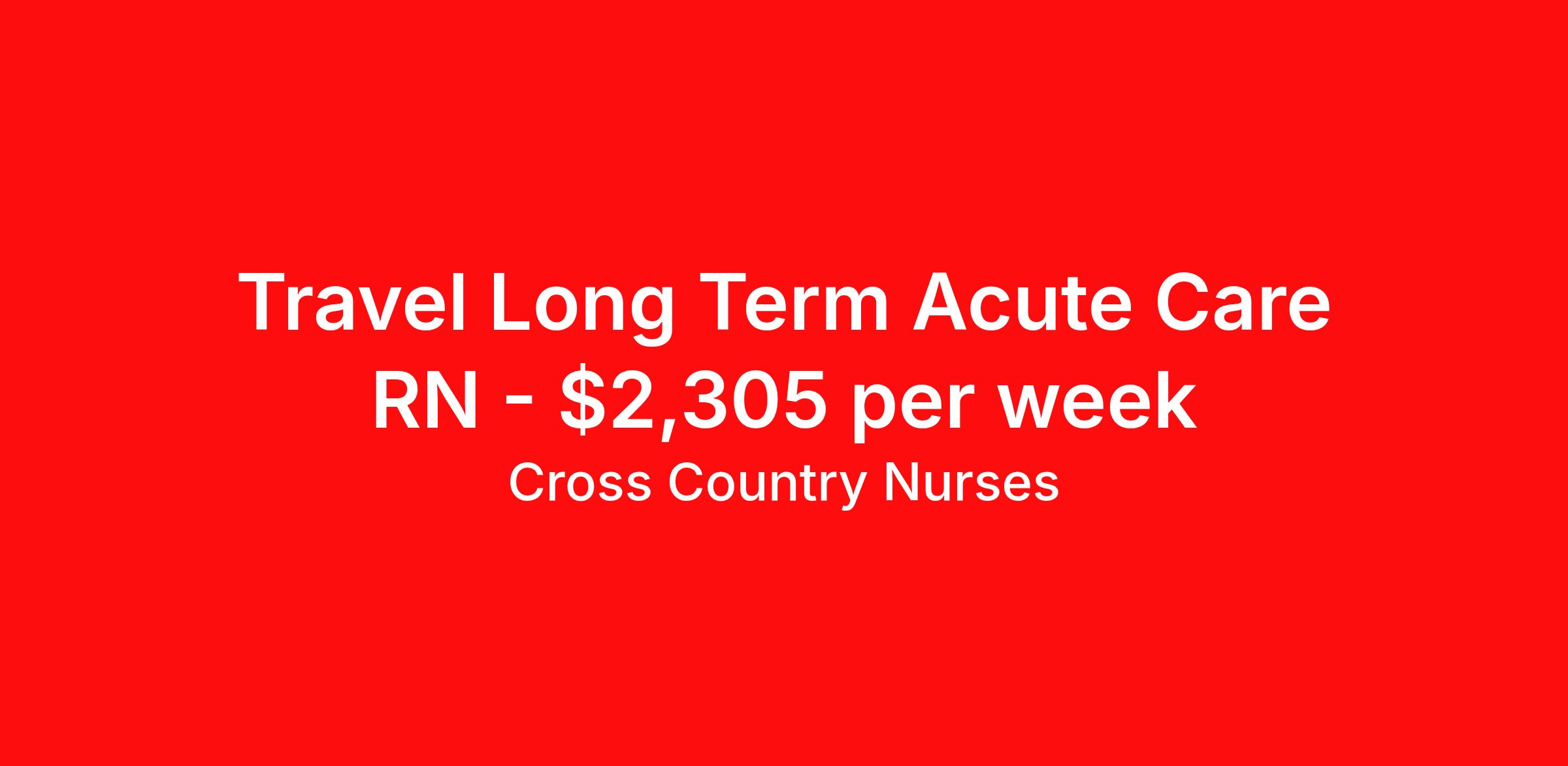 Cross Country Nurses is seeking a travel nurse RN Long Term Acute Care for a travel nursing job in West Burlington, Iowa. Job Description & Requirements Specialty: Long Term Acute Care Discipline: RN Start Date: 04/06/2026 Duration: 13 weeks 40 hours per week Shift: 8 hours, nights Employment Type: Travel Job Description As a registered nurse - long-term acute care (RN LTAC), youll treat patients who have serious medical conditions and need ongoing care. Working at an acute care hospital or long-term acute care center, youll provide care for those with medically or surgically complex cases. Your patients may need ventilators, transfusions, complex wound care or ongoing dialysis. Youll play a critical role in preventing disease and providing emotional support for your patients and their families. Minimum Requirements At least 1 year of recent acute care experience in specialty Active RN license Benefits The benefits of taking a travel nursing job with Cross Country include: Private housing or generous housing allowance Comprehensive health insurance with prescription coverage Dependent health insurance with prescription coverage Competitive salaries Referral bonuses Travel reimbursement 401(k) retirement plan Direct deposit/free checking Unlimited free CE credits Cross Country Job ID 1235500. Pay package is based on 8 hour shifts and 40 hours per week (subject to confirmation) with tax-free stipend amount to be determined. Posted job title: Registered Nurse / Long Term Acute Care About Cross Country Nurses You care for others — we’re here to care for you. At Cross Country, we know travel nursing is about more than just the job. It’s about building a career that supports your lifestyle, your values, and your impact. We offer competitive pay, full benefits, and 24/7 support from a team that truly understands what it means to be on the front lines. Wherever your journey takes you, we’re with you every step of the way. Let’s build your best life — one assignment at a time. Benefits 401k retirement plan Referral bonus