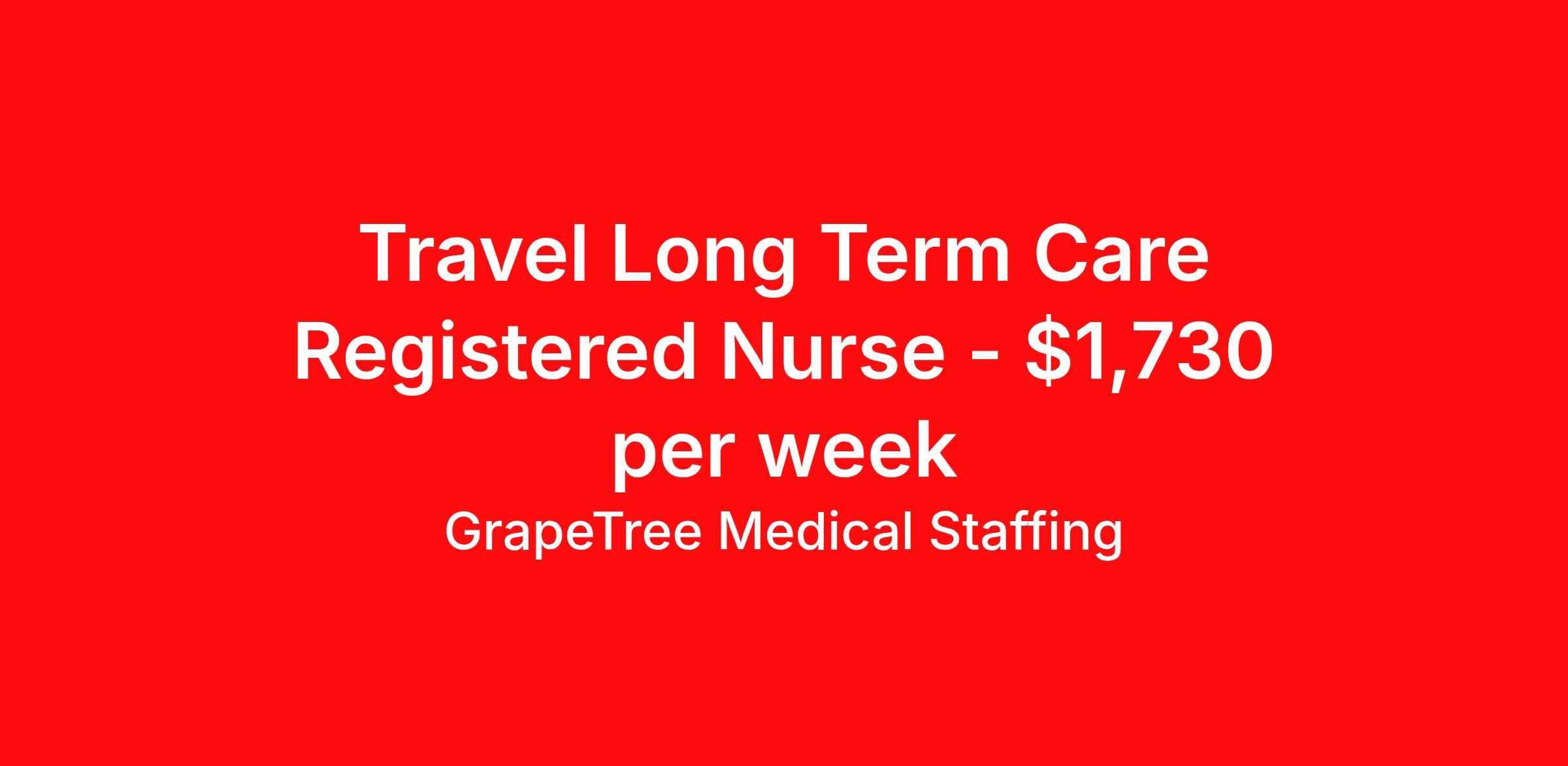 GrapeTree Medical Staffing is seeking a travel nurse RN Long Term Care (LTC) Long Term Care for a travel nursing job in Ellsworth, Kansas. Job Description & Requirements Specialty: Long Term Care Discipline: RN Start Date: 03/23/2026 Duration: 3 weeks 34 hours per week Shift: 12 hours, days Employment Type: Travel Grape Tree LTC Job ID 88942. Pay package is based on 12 hour shifts and 34 hours per week (subject to confirmation) with tax-free stipend amount to be determined. Posted job title: RN - LTC About GrapeTree Medical Staffing GrapeTree Medical Staffing has over 20 years of experience offering 24/7 staffing solutions to healthcare communities. GrapeTree takes pride in staffing high-quality, experienced CNAs, STNAs, LPNs, and RNs in 8-13 week travel contracts in nursing homes, assisted living, skilled nursing and memory care facilities across the midwestern US. Benefits Referral bonus Employee assistance programs License and certification reimbursement Weekly pay Holiday Pay Guaranteed Hours Mileage reimbursement