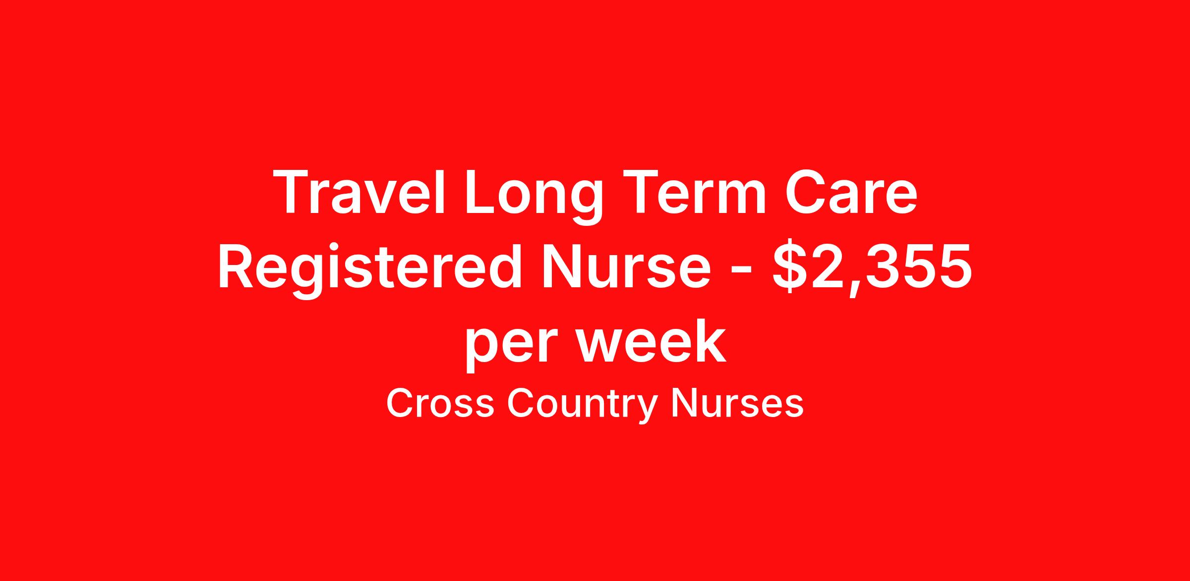 Cross Country Nurses is seeking a travel nurse RN Long Term Care (LTC) Long Term Care for a travel nursing job in Miles City, Montana. Job Description & Requirements Specialty: Long Term Care Discipline: RN Start Date: 04/20/2026 Duration: 13 weeks 36 hours per week Shift: 12 hours, days Employment Type: Travel Job Description As a registered nurse (RN), you will provide care for patients dealing with illness or injury. Depending on your role, you'll work at a hospital, outpatient center, private practice, home health, telemedicine, nursing facility, clinic or other facility. You'll perform tasks like assessing patients, developing care plans, administering medication, providing treatment, assisting with surgery, changing bandages, monitoring vitals and maintaining records. You'll also provide continued support and education to patients, promoting their overall health and ensuring they have the tools to recover and prevent further health issues. Minimum Requirements At least 1 year of recent acute care experience in specialty Active RN license Benefits The benefits of taking a travel nursing job with Cross Country include: Private housing or generous housing allowance Comprehensive health insurance with prescription coverage Dependent health insurance with prescription coverage Competitive salaries Referral bonuses Travel reimbursement 401(k) retirement plan Direct deposit/free checking Unlimited free CE credits Cross Country Job ID 1237788. Pay package is based on 12 hour shifts and 36 hours per week (subject to confirmation) with tax-free stipend amount to be determined. Posted job title: Registered Nurse / Long Term Care About Cross Country Nurses You care for others — we’re here to care for you. At Cross Country, we know travel nursing is about more than just the job. It’s about building a career that supports your lifestyle, your values, and your impact. We offer competitive pay, full benefits, and 24/7 support from a team that truly understands what it means to be on the front lines. Wherever your journey takes you, we’re with you every step of the way. Let’s build your best life — one assignment at a time. Benefits 401k retirement plan Referral bonus