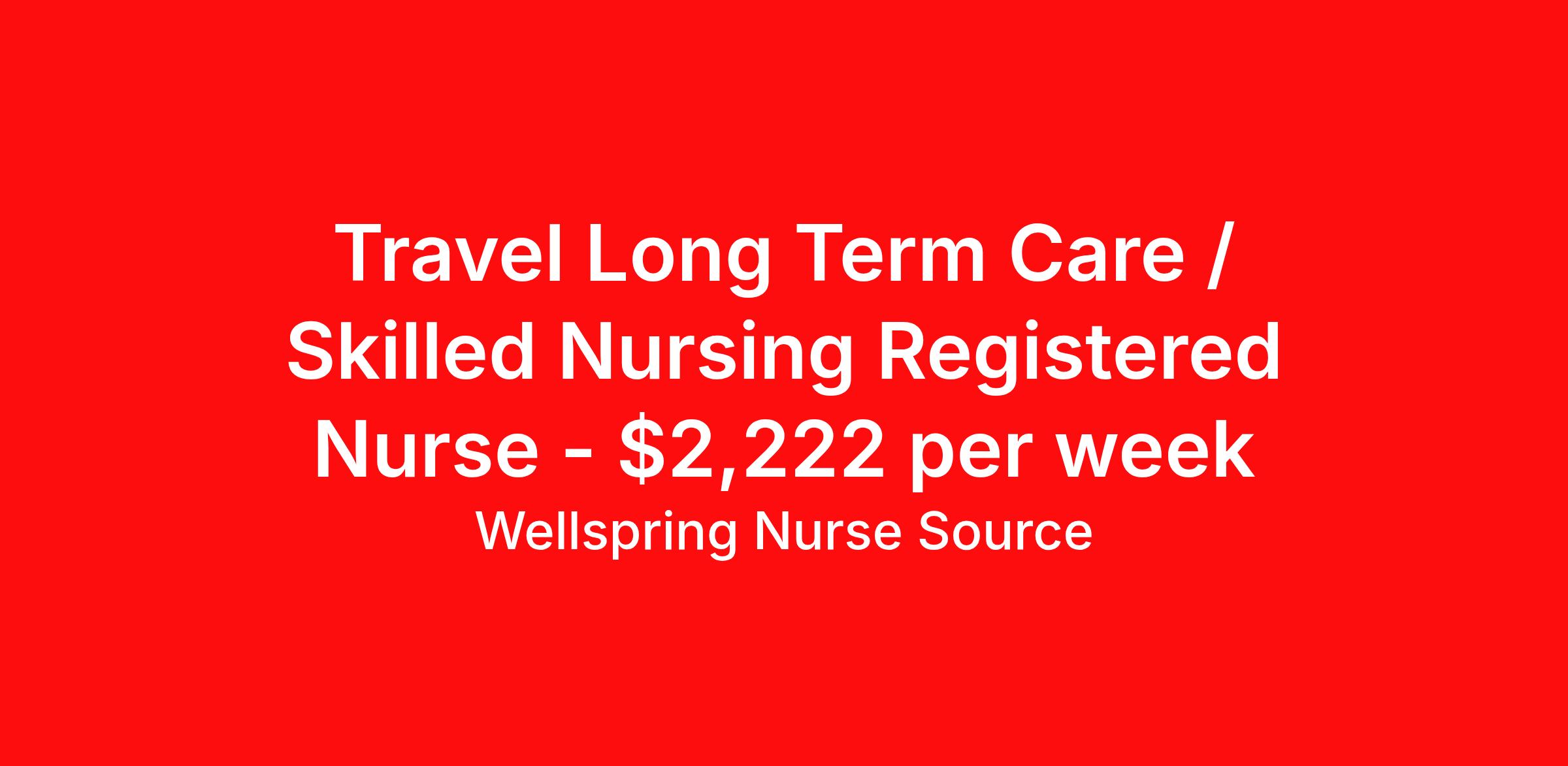 Wellspring Nurse Source is seeking a travel nurse RN Long Term Care (LTC) Long Term Care for a travel nursing job in Lewiston, Maine. Job Description & Requirements Specialty: Long Term Care Discipline: RN Start Date: ASAP Duration: 13 weeks 36 hours per week Shift: 12 hours, days Employment Type: Travel 2 years of experience required. COVID Vaccine - Required. Administer medicines, oversee treatments, and ensure compliance with prescribed therapies. Keep accurate, detailed records of treatments and medications. Assess and record patients' vital signs and other information about their condition. Wellspring Nurse Source Job ID 35711555. Pay package is based on 12 hour shifts and 36.0 hours per week (subject to confirmation) with tax-free stipend amount to be determined. Posted job title: RN LTC About Wellspring Nurse Source Wellspring is nurse owned and operated which means that we get you, we stand behind you, and we advocate for you. We are 100% committed to helping you find your best job at the best rate. We are unwavering in our commitment to supporting our clinicians on every step of their travel adventure, assisting with everything from onboarding and payroll to on-the-job clinical support with a dedicated Clinician Success Team. You’re not just a number at Wellspring, you’re a valued member of our family. Join us and experience the Wellspring difference.