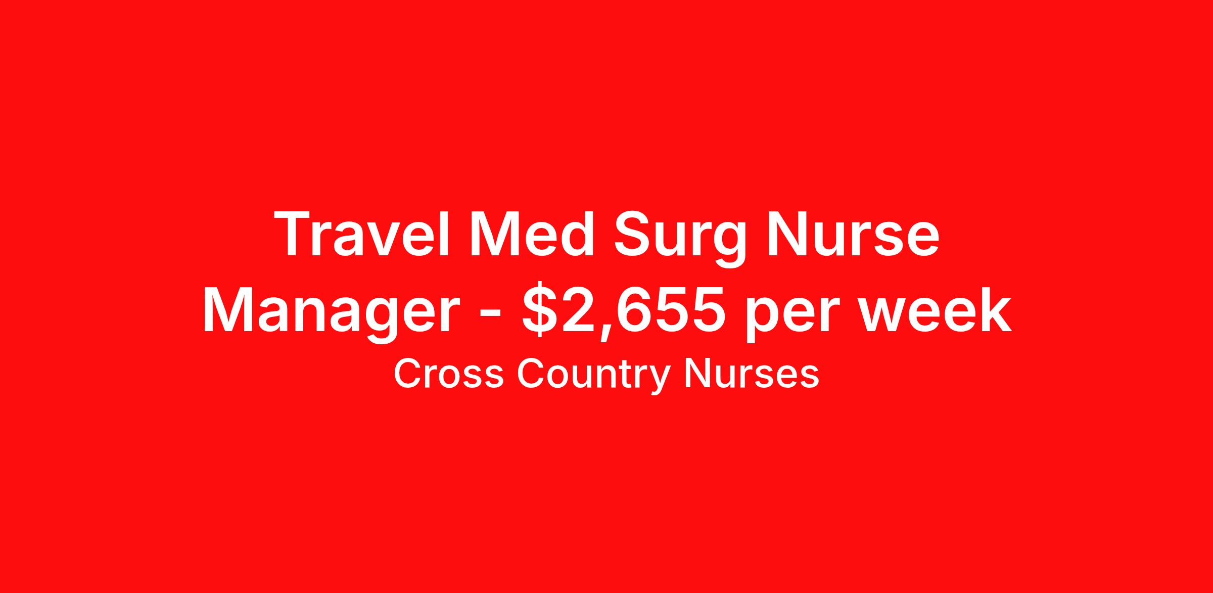 Cross Country Nurses is seeking a travel nurse RN Manager, Med Surg for a travel nursing job in Bakersfield, California. Job Description & Requirements Specialty: Med Surg Discipline: RN Start Date: 04/06/2026 Duration: 16 weeks 36 hours per week Shift: 12 hours, nights Employment Type: Travel Job Description As a registered nurse (RN), you will provide care for patients dealing with illness or injury. Depending on your role, you'll work at a hospital, outpatient center, private practice, home health, telemedicine, nursing facility, clinic or other facility. You'll perform tasks like assessing patients, developing care plans, administering medication, providing treatment, assisting with surgery, changing bandages, monitoring vitals and maintaining records. You'll also provide continued support and education to patients, promoting their overall health and ensuring they have the tools to recover and prevent further health issues. Minimum Requirements At least 1 year of recent acute care experience in specialty Active RN license Benefits The benefits of taking a travel nursing job with Cross Country include: Private housing or generous housing allowance Comprehensive health insurance with prescription coverage Dependent health insurance with prescription coverage Competitive salaries Referral bonuses Travel reimbursement 401(k) retirement plan Direct deposit/free checking Unlimited free CE credits Cross Country Job ID 1233727. Pay package is based on 12 hour shifts and 36 hours per week (subject to confirmation) with tax-free stipend amount to be determined. Posted job title: Registered Nurse / Nurse Manager Med Surg Nursing About Cross Country Nurses You care for others — we’re here to care for you. At Cross Country, we know travel nursing is about more than just the job. It’s about building a career that supports your lifestyle, your values, and your impact. We offer competitive pay, full benefits, and 24/7 support from a team that truly understands what it means to be on the front lines. Wherever your journey takes you, we’re with you every step of the way. Let’s build your best life — one assignment at a time. Benefits 401k retirement plan Referral bonus