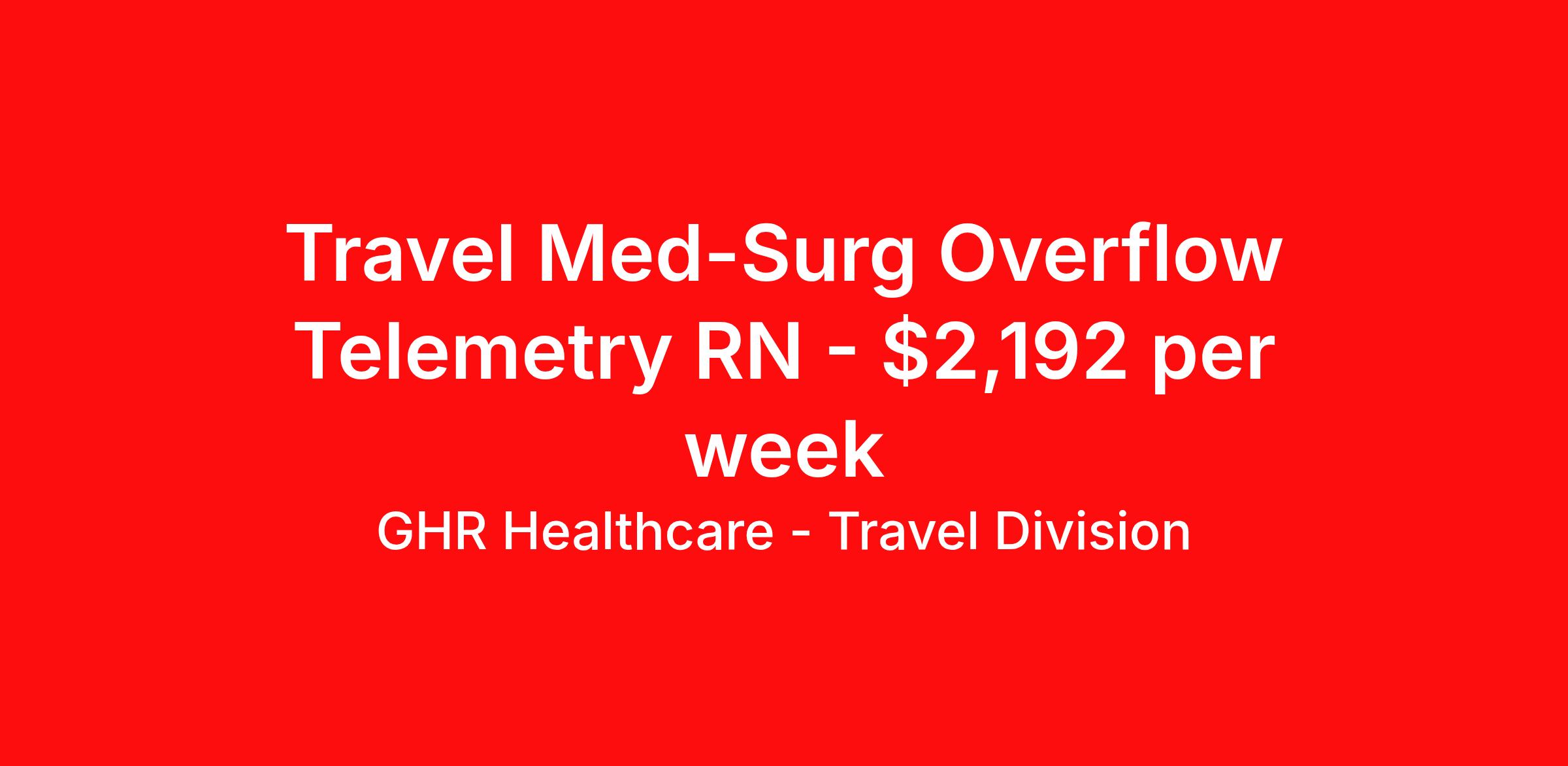 GHR Healthcare - Travel Division is seeking a travel nurse RN Med Surg for a travel nursing job in Wheeling, West Virginia. Job Description & Requirements Specialty: Med Surg Discipline: RN Start Date: ASAP Duration: 13 weeks 36 hours per week Shift: 12 hours Employment Type: Travel GHR Healthcare - Travel Division Job ID 76305530. Pay package is based on 12 hour shifts and 36 hours per week (subject to confirmation) with tax-free stipend amount to be determined. About GHR Healthcare - Travel Division For over 30 years, GHR Healthcare has been the bridge between healthcare professionals and the facilities that need them nationwide. We're committed to uncovering your ideal fit, supported by GHR's dedication to competitive compensation, transparent communication, and a devoted team that genuinely cares about your career journey. You can trust us to stand by your side as your advocate, confidante, and partner in advancing your career. At GHR, care and consideration are at the heart of everything we do. Visit ghrhealthcare.com to learn more.