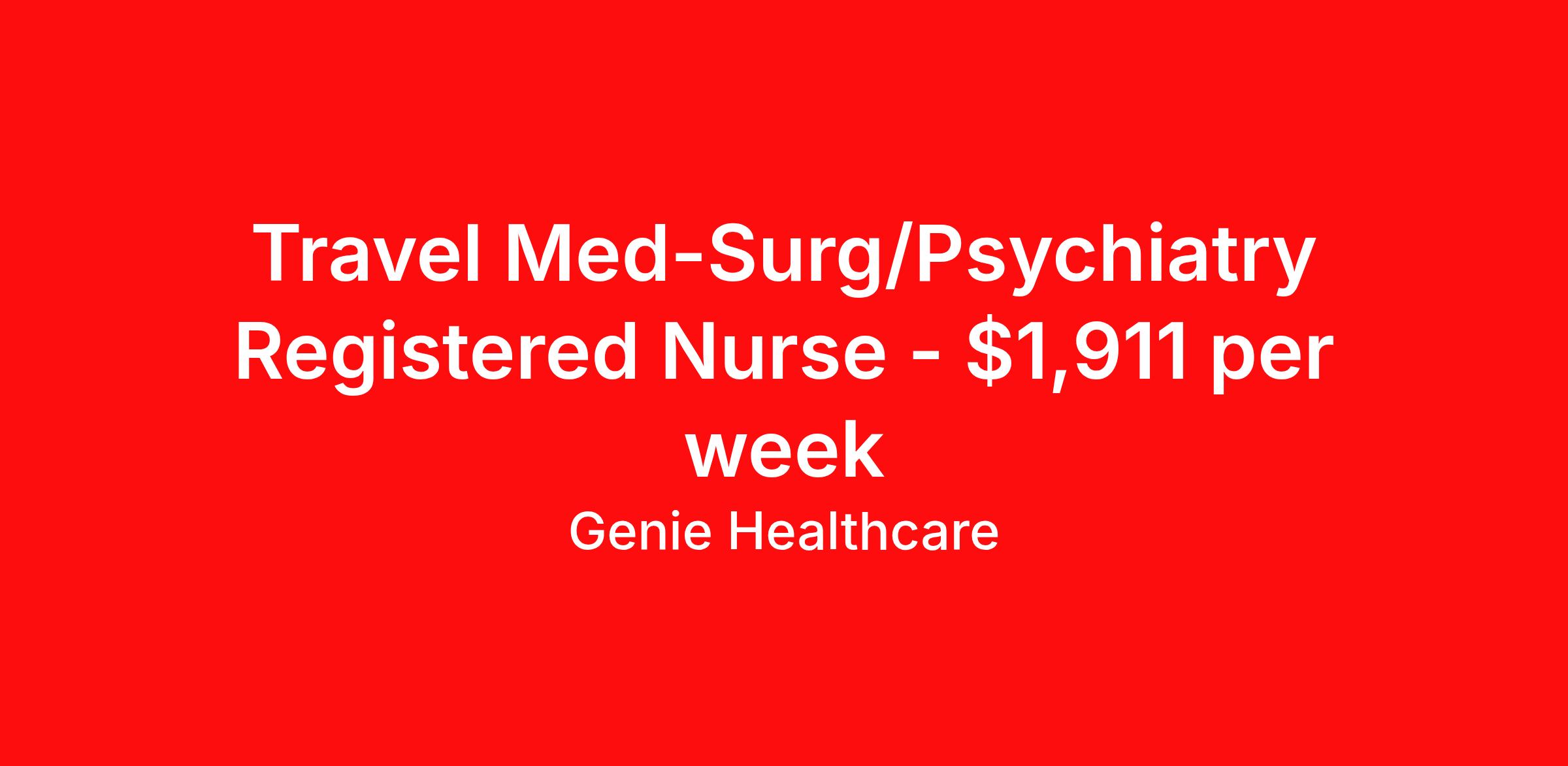Genie Healthcare is seeking a travel nurse RN Med Surg for a travel nursing job in Louisville, Kentucky. Job Description & Requirements Specialty: Med Surg Discipline: RN Start Date: 04/13/2026 Duration: 13 weeks 36 hours per week Shift: 12 hours, days Employment Type: Travel Genie Healthcare is looking for a RN to work in MedSurg for a 12.71 weeks travel assignment located in Louisville, KY for the Shift (3x12hr days, 07:00:00-19:00:00, 12.00-3). Pay and benefits packages are estimated based on client bill rate at time the job was posted. These rates are subject to change. Exact pay and benefits vary based on several things, including, but not limited to, guaranteed hours, client changes in bill rate, experience, etc. Benefits: Medical Insurance, Dental Insurance, Vision Insurance, 401(k) with company matching (50% up to 6% of what you contribute) Genie Healthcare Job ID 17994318. Pay package is based on 12 hour shifts and 36.0 hours per week (subject to confirmation) with tax-free stipend amount to be determined. Posted job title: RN:MedSurg,07:00:00-19:00:00 About Genie Healthcare Genie Healthcare is one of the fastest growing Nurse Travel Agencies in the USA. Genie serves hundreds of facilities and has over 4000 current travel RN contracts open at any given time. Genie provides travel RN’s flexibility, support, top pay scale, housing and the 1 rated, multi-state health insurance coverage. Genie Healthcare carries with it a commitment to providing a comprehensive level of service and quality care. Growing from a small team of eager recruiters to a company with satisfied clients in nearly every corner of the nation, delivering excellence in patient and customer care is the key to Genie’s success. The management team has 20 years of experience in workforce solutions and staffing in medical and non-medical fields, roles ranging from Clerical job to Cardiologist to software developer to CEO.
