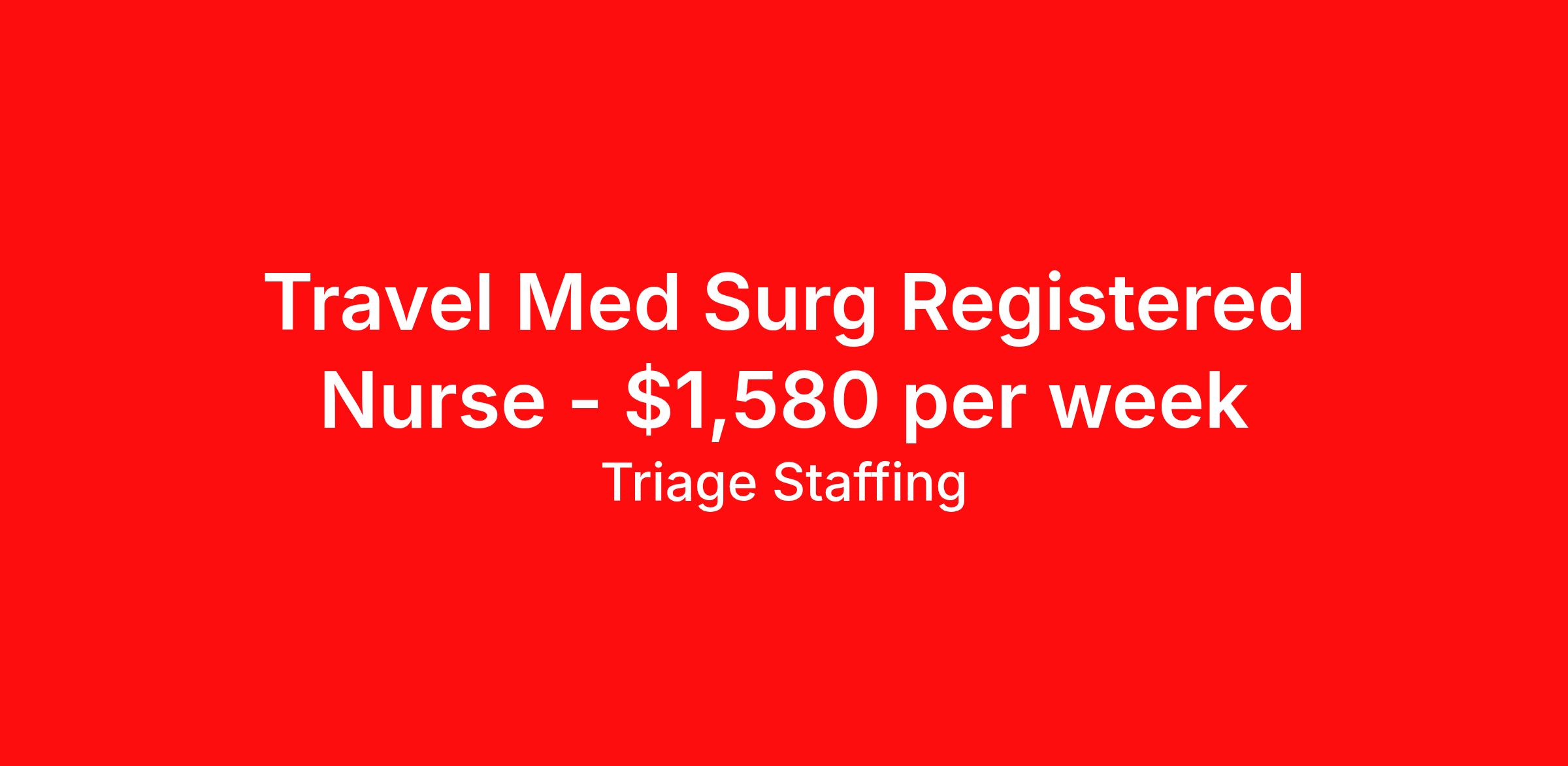 Triage Staffing is seeking a travel nurse RN Med Surg for a travel nursing job in Vicksburg, Mississippi. Job Description & Requirements Specialty: Med Surg Discipline: RN Start Date: ASAP Duration: 13 weeks 36 hours per week Shift: 12 hours, nights Employment Type: Travel Travel Nursing: Med/Surg Vicksburg Location: Vicksburg Start Date: 3/9/2026 Shift Details: 12H Nights 36 hours per week Length: 13 WEEKS Apply for specific facility details.Med Surg RN Triage Staffing Job ID QNCR6UVF. Posted job title: Nursing: Med/Surg About Triage Staffing At Triage, we prefer to be real . Real about expectations—both ours and yours. Real about how a decision you make today could affect your tomorrows. Real about how compensation actually works. Real about how great—or grating—your next supervisor may be. Being real allows everyone at Triage to be ready . Ready to serve you with real honesty. So if that gig near the ocean is really no day at the beach, or that third shift comes with a second-class rate, we tell you. So you can be ready, too. We staff all five major divisions of acute care—nursing, lab, radiology, cardiopulmonary and rehab therapy, offering: - Competitive, custom pay packages - One point of contact for both travelers and facilities (per division) - A reliable recruiter who's got your back throughout your entire assignment - In-house compliance and accounting specialists - A clinical liaison team available 24/7 to offer medical and professional support and career development - A mentoring program that is run and managed by actual clinicians—yeah, you read that right - And more (because of course there’s more) Are we the biggest? No. Are we the best? That’s rather subjective, but we’re trying to be. Will we work like hell to get you as close to your idea of heaven as possible? Yes. Yes, we will. Benefits: Day One comprehensive, nationwide insurance plans for health, vision and dental and life—including a HSA option Day One 401(k) program with employer-matching contributions once eligible Facility cancelling protection—your time is money on and off-the-clock Guaranteed hours Weekly paychecks via direct deposit Earned vacation bonuses for time worked Paid holidays Employee assistance program (EAP)—your mental health is important, too Continuing education, certification and licensing reimbursement Workers comp—because accidents happen Top-rated professional liability insurance Company provided housing options Referral bonus—$750 in your pocket after they’ve completed a 13-week assignment