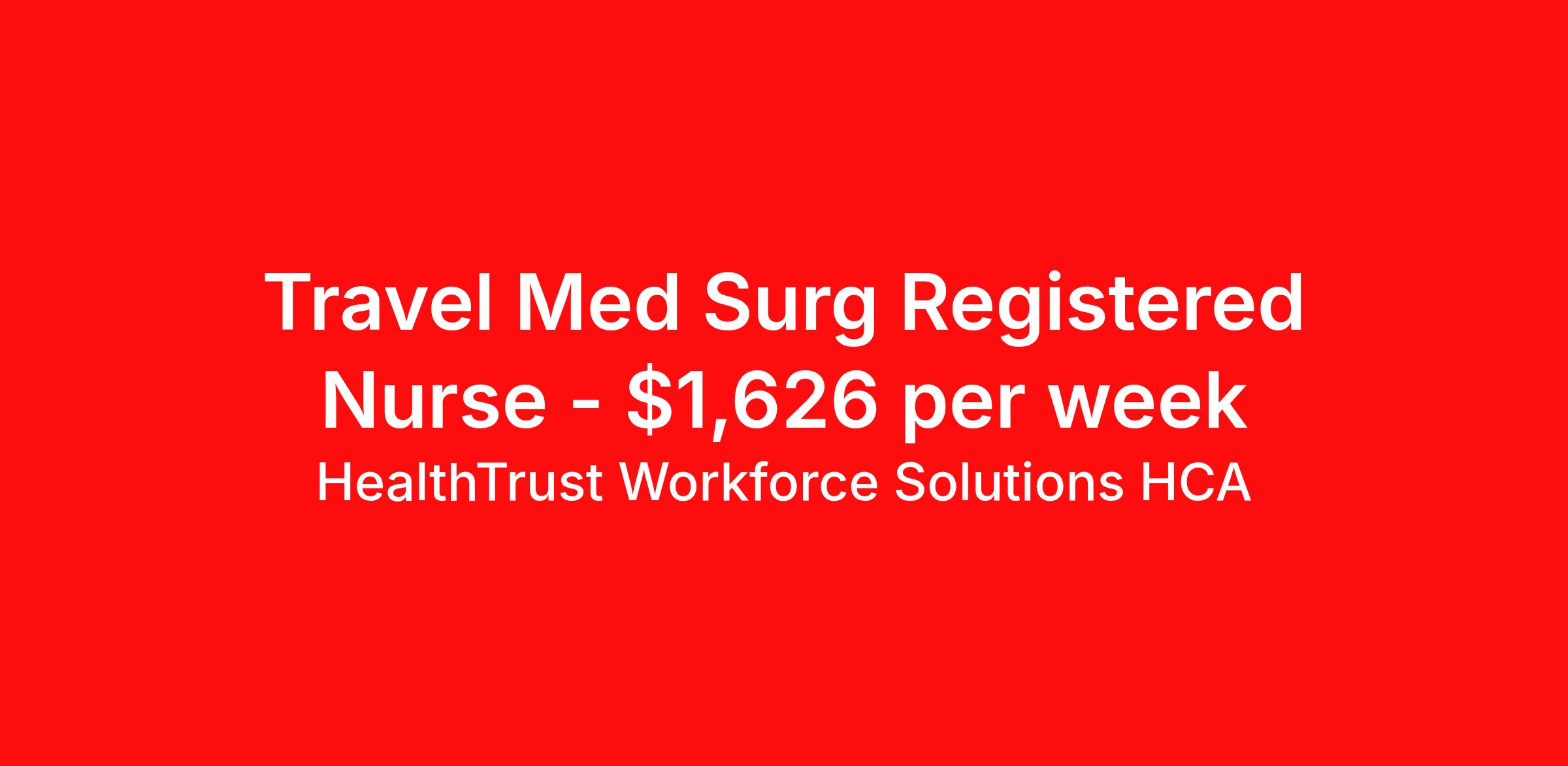 HealthTrust Workforce Solutions HCA is seeking a travel nurse RN Med Surg for a travel nursing job in Dallas, Texas. Job Description & Requirements Specialty: Med Surg Discipline: RN Start Date: 04/21/2026 Duration: 13 weeks 36 hours per week Shift: 12 hours, days Employment Type: Travel Entrust Your Career to HealthTrust! At HealthTrust, we believe that healthcare is not defined by the four walls in which it is practiced; it’s defined by its people. We pride ourselves on crafting opportunities that expand skill sets, broaden career horizons, provide economic stability, and cultivate personal growth. HealthTrust Offers: Competitive Pay Packages Guaranteed hours Weekly direct deposit options 401k with Company Match Earn up to $750 for referrals Free Private Furnished Housing or Tax-Free Subsidy To get started, you will need: RN's a minimum of 1 year in specialty Allied 6 months of experience An adventurous spirit and fierce dedication Degree in corresponding specialty as required Appropriate certifications and licensure as needed for the specific position HealthTrust Benefits: Opportunities for a lifetime: When you become a part of the HCA family, you will have exclusive access to more opportunities than any other healthcare system in the nation. At HWS, we help open the door to a lifetime of lasting career opportunities. A culture of care: Our clinicians have made HWS an industry leader for over 25 years. We are passionate about our mission that, above all else, we are committed to the care and improvement of human life. Career Development: As a wholly owned subsidiary of HCA Healthcare, HWS is a preferred partner to thousands of top-performing hospitals. We provide our healthcare professionals with first-priority access to more than 200,000 jobs nationwide. We are uniquely positioned to offer you exclusive and direct access to HCA Healthcare’s vast network of facilities. Let us open the door to nationwide opportunities that fit your lifestyle! We are an equal opportunity employer and value diversity at our company. We do not discriminate on the basis of race, religion, color, national origin, gender, sexual orientation, age, marital status, veteran status, or disability status. Job Requirements Certifications : BLS (Required) HealthTrust Workforce Solutions HCA Job ID 994969. Posted job title: Travel Nurse - Medical-Surgical About HealthTrust Workforce Solutions HCA At HealthTrust Workforce Solutions, healthcare is not just about the four walls of a facility but about the people who provide and receive care. Our focus is on empowering healthcare professionals to deliver exceptional patient experiences by providing them with the necessary skills, tools, and support. We partner with healthcare facilities nationwide to ensure that the right professionals are in the right roles. We prioritize our clinicians by giving them a voice and access to opportunities to fulfill their mission of improving lives by providing quality patient care. We are committed to our core values of Trust, Innovation, Adaptability, Courage, and Accountability. We are dedicated to positively impacting the healthcare industry by providing first-priority access to more than 200,000 jobs nationwide to our healthcare professionals. Join us and be part of the HealthTrust family, where you can make a difference every day. We embrace our changing environment, and we maintain a culture that has a rich tradition of transforming itself to meet the challenges of the future. MISSION STATEMENT While putting great people in the right roles is essential, our mission is far greater. We want our clinicians to be part of the HealthTrust family, where healthcare professionals have a voice and are empowered with the right tools and opportunities to fulfill their personal mission of improving lives. Plus, as a preferred partner to thousands of top-performing hospitals, we provide our healthcare professionals with first-priority access to more than 200,000 jobs nationwide. Benefits Dental benefits Vision benefits Referral bonus Continuing Education Life insurance