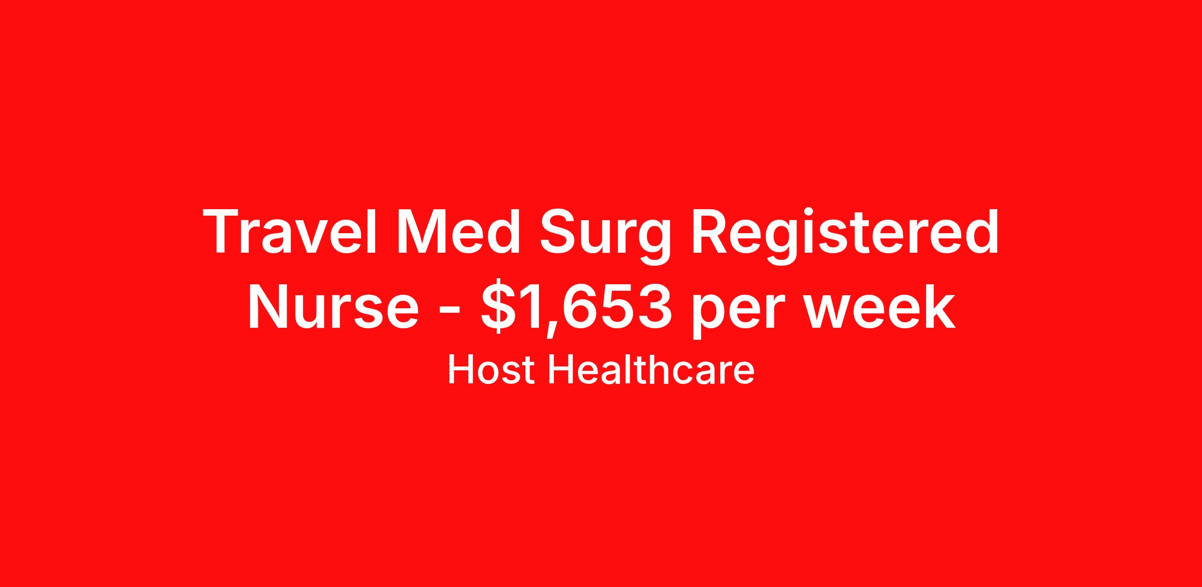 Host Healthcare is seeking a travel nurse RN Med Surg for a travel nursing job in Vicksburg, Mississippi. Job Description & Requirements Specialty: Med Surg Discipline: RN Start Date: 03/30/2026 Duration: 13 weeks 36 hours per week Shift: 12 hours, days Employment Type: Travel Host Healthcare Job ID a1fVX000002xB7xYAE. Pay package is based on 12 hour shifts and 36 hours per week (subject to confirmation) with tax-free stipend amount to be determined. Posted job title: RN - Medical-Surgical About Host Healthcare At Host Healthcare, we provide a truly comfortable experience as you explore your travel nursing, therapy, or allied career. We make your travel healthcare journey easy by taking care of all the details, so you don’t have to. We are on a mission to help others live better and we do this by helping the healers of the world be as comfortable as possible. With access to tens of thousands of travel nursing, therapy, and allied jobs in all 50 states, our responsive and friendly recruiters find your dream position based on what’s important to you. During your assignment, get access to premium benefits, including Day 1 medical that continues up to 30 days between assignments, 401K matching, travel reimbursements, dedicated housing support, and more. We also offer 24/7 support from our team and access to our on-staff clinicians so you can feel comfortable and confident throughout your entire assignment. Travel comfortably with Host Healthcare. Benefits Referral bonus School loan reimbursement Vision benefits Wellness and fitness programs Company provided housing options License and certification reimbursement Life insurance Medical benefits Mileage reimbursement Pet insurance Discount program Employee assistance programs Guaranteed Hours Health savings account Holiday Pay 401k retirement plan Continuing Education Dental benefits