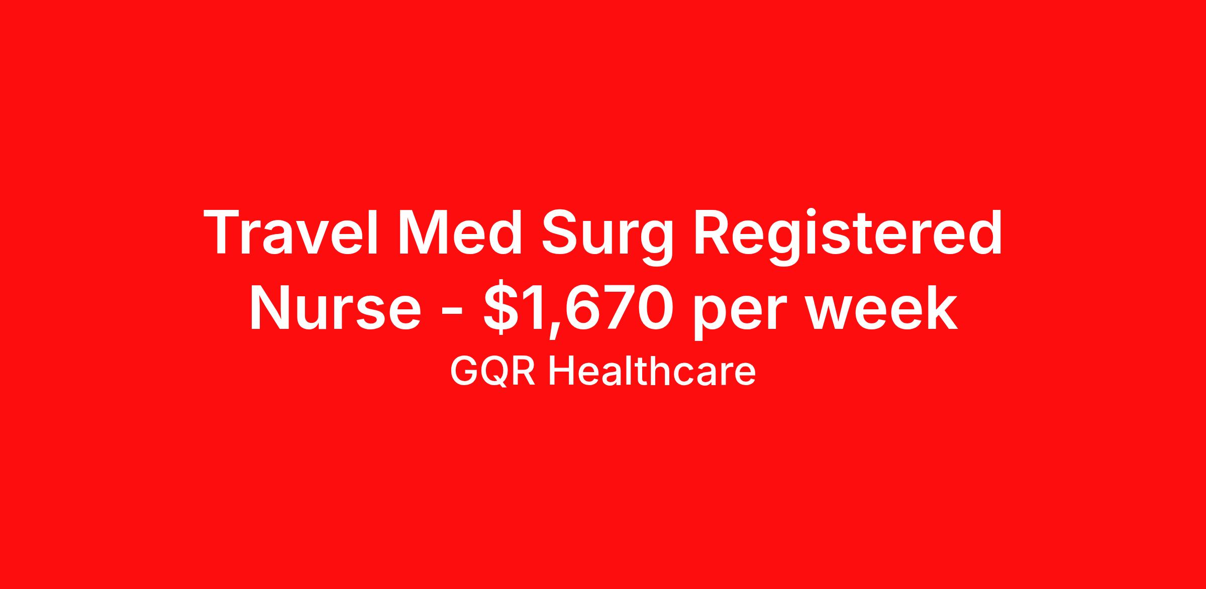 GQR Healthcare is seeking a travel nurse RN Med Surg for a travel nursing job in Carlsbad, New Mexico. Job Description & Requirements Specialty: Med Surg Discipline: RN Start Date: 04/06/2026 Duration: 13 weeks 36 hours per week Shift: 12 hours, nights Employment Type: Travel Medical-Surgical RN Job Location: Carlsbad, NM Profession: Registered Nurse Estimated Pay: $1670.40 Duration (weeks): 13 Specialty: Medical-Surgical Shift Details: Night *Estimated weekly pay includes projected hourly wages and weekly meal and lodging per diems for eligible clinicians based on nationally published GSA rates. Actual weekly pay and per diems may differ from the amount shown and are subject to change during an assignment. Benefits: Day 1 Insurance Cigna medical, MetLife dental and vision insurance License reimbursement for new licenses needed for each assignment Discounts with hotels and rental cars A dedicated recruiter and support team that will help you every step of the way to sure you start on time and have an exceptional experience Referral bonus up to $700 About the Company: Finding the right role is about more than just matching skills to a job—it’s about aligning with your goals, values, and the way you want to work. As an award-winning talent partner, we support healthcare professionals through every step of that process, offering meaningful opportunities, clear guidance, and long-term partnership. From our first conversation to your first day on the job (and beyond!), we’re here to help you move forward with confidence. GQR Job ID 785211. Pay package is based on 12 hour shifts and 36 hours per week (subject to confirmation) with tax-free stipend amount to be determined. Posted job title: Registered Nurse (RN) About GQR Healthcare GQR’s Healthcare team specializes in connecting experts within the industry to highly skilled healthcare professionals across the US market. In the competitive healthcare market, we recognize that the industry’s common goals of improved quality of care and patient outcomes are wholly reliant upon the professionals directly supporting these initiatives. Leveraging our extensive candidate network, we deliver continuity of care for the communities our partners serve to ensure the patient experience is of the highest quality. Through deep market specialization and a unique approach to talent acquisition, GQR Healthcare provides an unparalleled and personalized experience across all medical specialties in nursing and within diverse healthcare platforms across the industry.