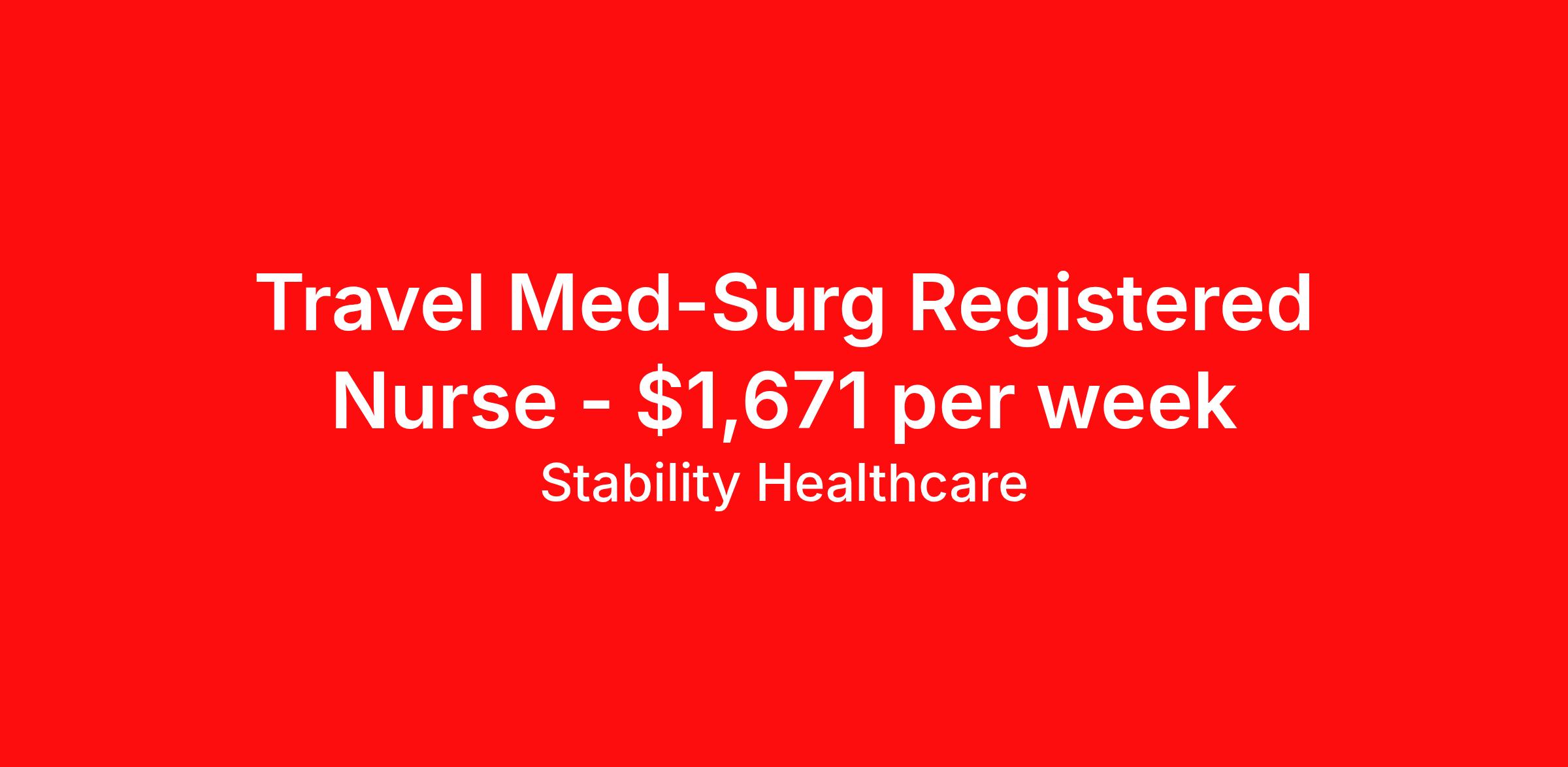 Stability Healthcare is seeking a travel nurse RN Med Surg for a travel nursing job in Harlingen, Texas. Job Description & Requirements Specialty: Med Surg Discipline: RN Duration: 13 weeks 36 hours per week Shift: 12 hours, days Employment Type: Travel Stability Healthcare is looking for a Med-Surg RN contract position in Harlingen, TX. The majority of hospitalized patients are admitted to M/S either directly or after surgery. M/S is also where patients who have been in critical care (ICU) are transferred when they no longer need critical care but still require nursing care. *$600 travel bonus *Day 1 health insurance with United Healthcare *PTO plan start accruing on day 1, use during contract or cash out at the end! *Guaranteed stipend if facility calls you off *Extra hour bonus earn an additional hourly bonus for working over your weekly contracted hours Stability Job ID 827191. Pay package is based on 12 hour shifts and 36 hours per week (subject to confirmation) with tax-free stipend amount to be determined. Posted job title: Med-Surg About Stability Healthcare Stability Healthcare was founded in 2009, with the mission of becoming the best Travel Nursing Agency in California. We have been rated one of the top travel nursing agencies and offer our nurses the highest paying travel nursing jobs available. We have access to the best travel assignments from 1000’s of facilities. You can start the year off in sunny California, spend the Spring in the Colorado Rockies, enjoy the Summer in the Mid-West, experience the change of seasons in Boston and New York, and hit the beaches of Florida in the winter. Our Nurses work in the best hospitals and health systems in the country. Benefits Guaranteed Hours Benefits start day 1