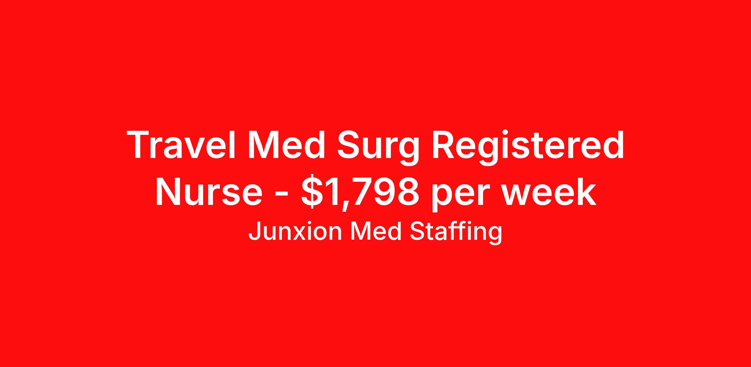 Junxion Med Staffing is seeking a travel nurse RN Med Surg for a travel nursing job in Wilmington, North Carolina. Job Description & Requirements Specialty: Med Surg Discipline: RN Start Date: 04/13/2026 Duration: 13 weeks 36 hours per week Shift: 12 hours, nights Employment Type: Travel Summary: Junxion Med Staffing is looking for a Med surg RN to take an assignment in Wilmington, North Carolina. This assignment lasts 13.14 WEEKS and is scheduled to start on April 13, 2026. If you don't like the start date, pay, or shift, then let’s talk. Give us a call opt 1 Job Details: Shift: 12H Nights Total Weekly Hours: 36 Certifications: BLS, BLS Trauma Level: Benefits: Day 1 Insurance Additional bonus potential for every contract Additional vacation incentives Medical insurance with no more than $175 monthly premium for employee Employee Assistance Program (EAP) Referral bonus up to $1,000 401K and access to financial advisors for financial wellness and education A dedicated recruiter and support team that will help you every step of the way to sure you start on time and have an exceptional experience An agency ran by a traveler for travelers Click here for licensing requirements About the Company: Junxion Med Staffing is an award-winning healthcare staffing company with a mission to provide quality healthcare to our communities. Apply today to speak with a recruiter! Awards: RNVIP- Top 10 Travel Nursing Agencies of 2024 BluePipes – The Best Travel Nursing Companies 2023 *Estimated weekly pay includes projected hourly wages and weekly meal and lodging per diems for eligible clinicians based on nationally published GSA rates. Actual weekly pay and per diems may differ from the amount shown and may be subject to change during an assignment. For all employees and employee applicants, Junxion Med Staffing is an Equal Employment Opportunity ("EEO") Employer, including Disability/Vets, and welcomes all to apply. Junxion Med Staffing Job ID 1362754. Pay package is based on 12 hour shifts and 36 hours per week (subject to confirmation) with tax-free stipend amount to be determined. About Junxion Med Staffing Junxion Med Staffing was founded by a former healthcare traveler who understands the challenges healthcare professionals face - because we’ve been there. We specialize in placing travel nurses, allied health professionals, physicians, physician assistants, and nurse practitioners in both short-term and permanent roles across a wide range of specialties. Whether you're looking for a travel contract or a long-term fit, we work to ensure the right match between each healthcare professional and facility. At Junxion, we keep it simple: ● Transparent communication. No surprises, no hidden details, just honest conversations so you always know what to expect. ● Dedicated support. From job search to contract negotiations and throughout your assignment, you’ll have a recruiter who’s with you every step of the way. ● Competitive pay and benefits. We advocate for you to be fairly compensated and supported in your goals. ● A focus on your success. When healthcare professionals feel valued and empowered, patient care improves and that’s what it’s all about. You’re not just a number here. You’re part of a team that actually cares. Let’s find your next great opportunity together. Benefits Weekly pay Referral bonus Dental benefits Vision benefits 401k retirement plan Medical benefits Mileage reimbursement