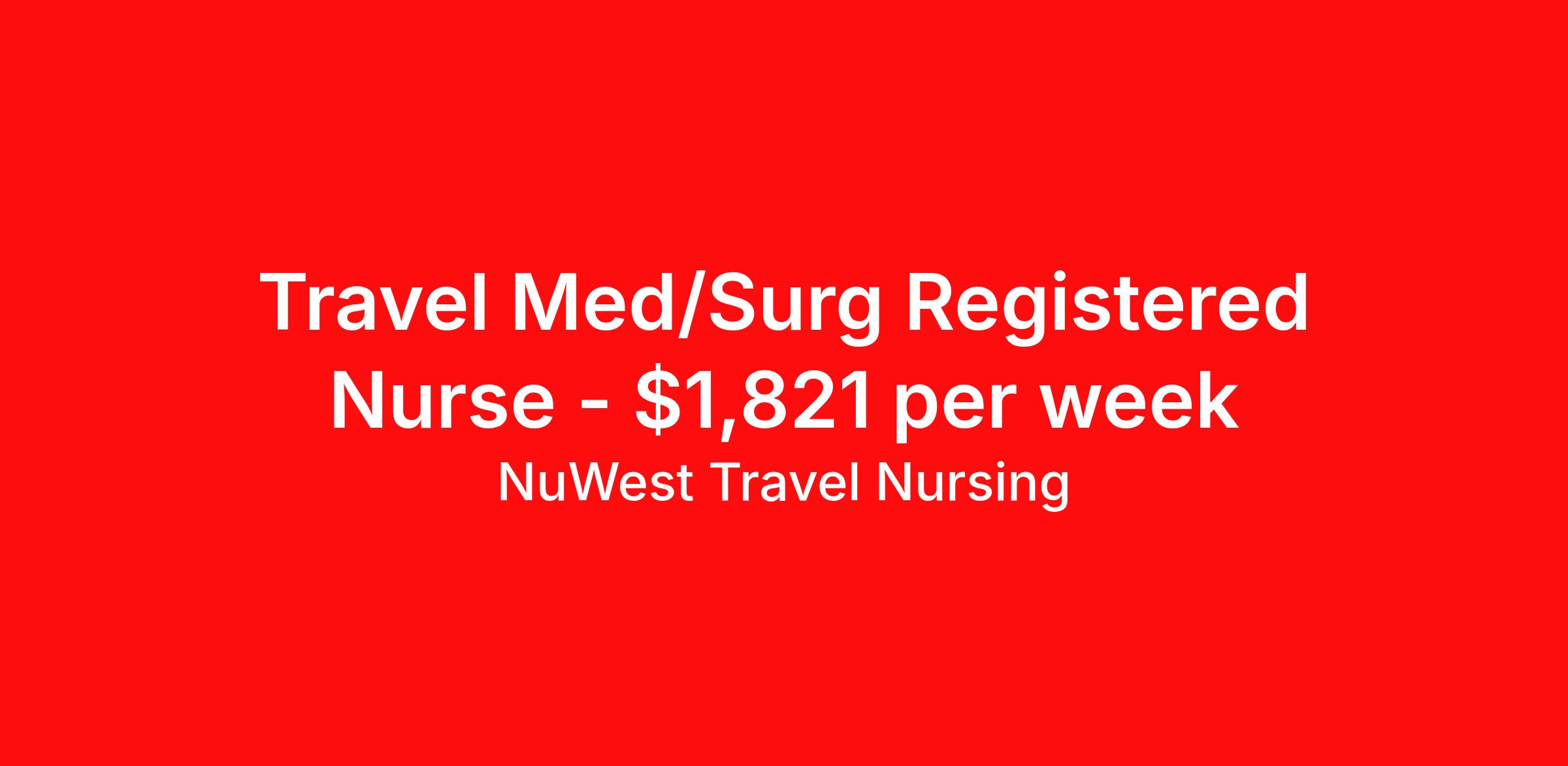 NuWest Travel Nursing is seeking a travel nurse RN Med Surg for a travel nursing job in Cleveland, Ohio. Job Description & Requirements Specialty: Med Surg Discipline: RN Duration: 13 weeks 36 hours per week Shift: 12 hours Employment Type: Travel We have a new assignment for RN - Med/Surg in Cleveland, OH and are interviewing ASAP. This is a travel assignment, 3x12 Days position at a great facility. Pay Range: $1672.96 - $1968.19 Per Week Benefits include medical, dental, vision, 401K, weekly direct deposit, and more! NuWest Travel Nursing Job ID 266074. Pay package is based on 12 hour shifts and 36 hours per week (subject to confirmation) with tax-free stipend amount to be determined.