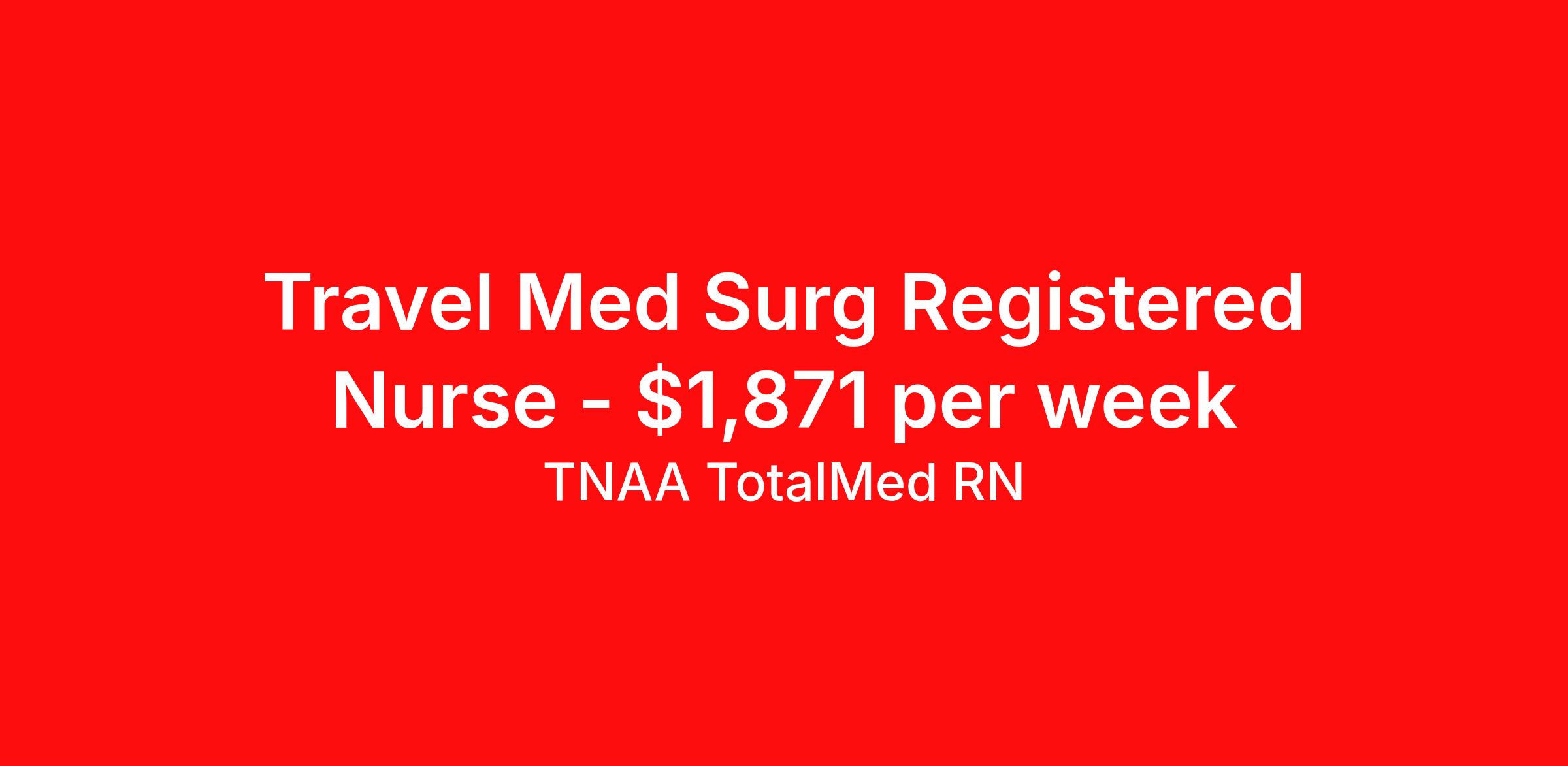TNAA TotalMed RN is seeking a travel nurse RN Med Surg for a travel nursing job in Lawton, Oklahoma. Job Description & Requirements Specialty: Med Surg Discipline: RN Duration: 13 weeks 36 hours per week Shift: 12 hours, nights Employment Type: Travel We're looking for Medical Surgical RNs for an immediate travel nurse opening in Lawton, OK. The right RN should have 1-2 years recent acute care experience. Read below for more requirements. As a MedSurg RN, you will conduct patient assessments and prioritize data collection based on patients' immediate conditions or needs. MedSurg RNs perform ongoing assessments and appropriate treatments as ordered by a physician. Documenting patient findings and providing education and support to patients' families is essential to this travel nurse position. As a Medical Surgical Travel Nurse, you should be prepared to perform the following tasks: Provide bedside care for a variety of patients, including pre- and post-op patients. Prepare, administer and record prescribed medication, reporting any adverse reactions to treatment. Change dressings, insert catheters and start IVs. Prepares equipment and aids physician during examination and treatment of patient. Educates patients on surgical procedures. Participates in discharge planning and initiates patient education plan as prescribed by physician. Medical Surgical Travel Nurses should be able to stand and walk for long periods of time, as well as bend, lean and stoop without difficulty. RNs should be able to easily lift 20 pounds. Moving or lifting of patients may require lifting of up to 50 pounds at times. RNs will work in a fast-paced environment treating patients that may be confused, agitated, and/or uncooperative. Requirements*: BLS, 1 Year * Additional certifications may be required before beginning an assignment. TotalMed Travel Job ID 1390305. Pay package is based on 12 hour shifts and 36 hours per week (subject to confirmation) with tax-free stipend amount to be determined. Posted job title: Medical/Surgical - MedSurg RN - Travel Nurse About TNAA TotalMed RN TotalMed is a Top Ten, travel nursing and healthcare staffing agency with the mission of igniting purpose in healthcare. The organization staffs nurses, therapists, pharmacists, and other clinicians of all specialties in all 50 states. They offer local and travel jobs and match caregivers with the right organization to assist both facilities and patients. As an organization, they focus on putting highly-skilled staff into facilities to ensure adequate staffing for a better patient experience. TotalMed specializes in recruiting and placing healthcare professionals in travel, PRN, and permanent positions across the country in Nursing and Allied Health. Throughout 2020, the organization filled roles at even the most short-staffed facilities during the most challenging time in healthcare. By matching the right travel healthcare professional with the right organization, TotalMed continues to offer a lifeline to facilities and their patients. Benefits Weekly pay Guaranteed Hours Continuing Education 401k retirement plan Sick pay Wellness and fitness programs Referral bonus Employee assistance programs Medical benefits Dental benefits Vision benefits Benefits start day 1