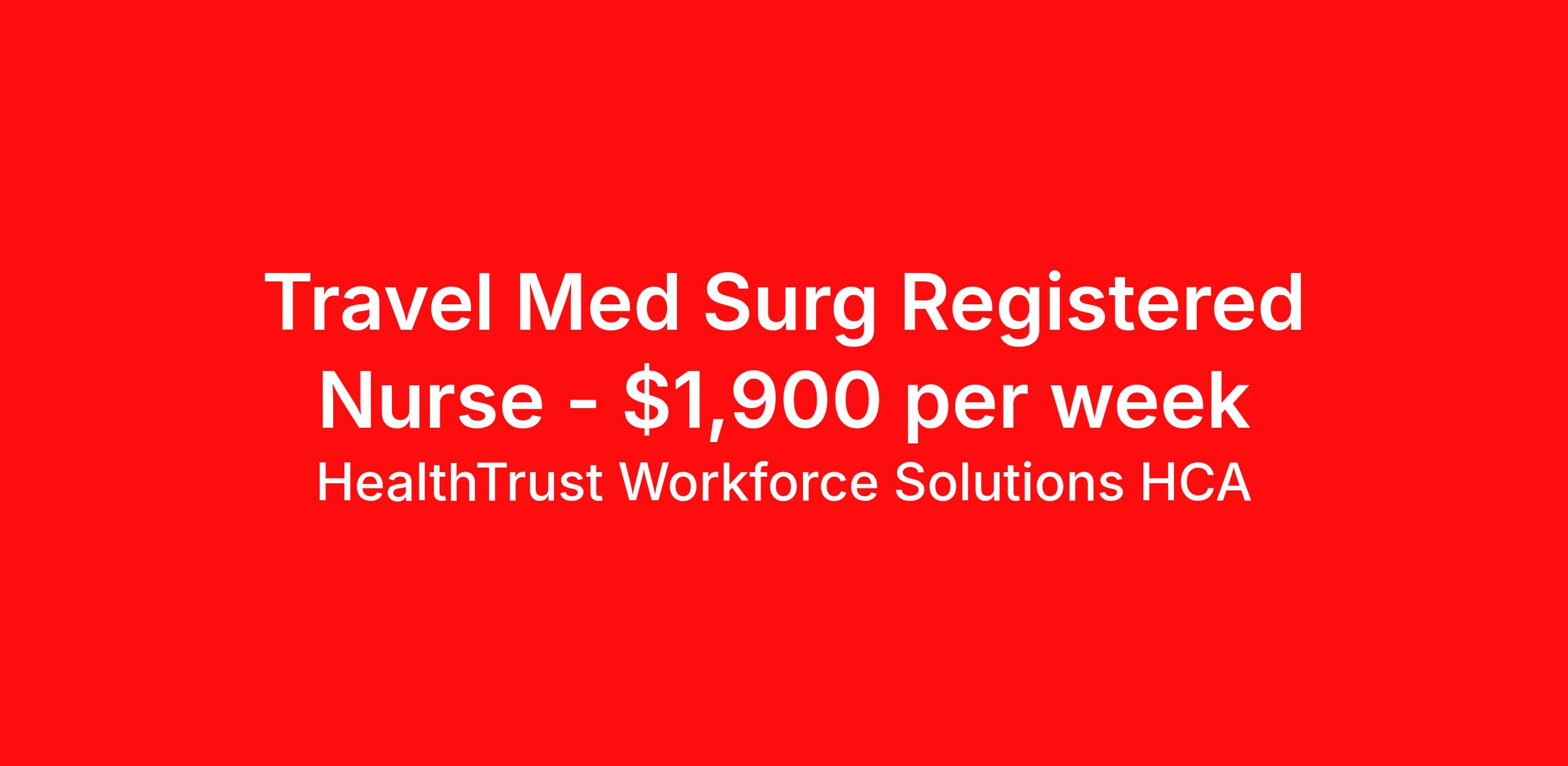 HealthTrust Workforce Solutions HCA is seeking a travel nurse RN Med Surg for a travel nursing job in Vicksburg, Mississippi. Job Description & Requirements Specialty: Med Surg Discipline: RN Start Date: 04/20/2026 Duration: 13 weeks 36 hours per week Shift: 12 hours, days, nights Employment Type: Travel About HealthTrust Workforce Solutions HCA At HealthTrust Workforce Solutions, healthcare is not just about the four walls of a facility but about the people who provide and receive care. Our focus is on empowering healthcare professionals to deliver exceptional patient experiences by providing them with the necessary skills, tools, and support. We partner with healthcare facilities nationwide to ensure that the right professionals are in the right roles. We prioritize our clinicians by giving them a voice and access to opportunities to fulfill their mission of improving lives by providing quality patient care. We are committed to our core values of Trust, Innovation, Adaptability, Courage, and Accountability. We are dedicated to positively impacting the healthcare industry by providing first-priority access to more than 200,000 jobs nationwide to our healthcare professionals. Join us and be part of the HealthTrust family, where you can make a difference every day. We embrace our changing environment, and we maintain a culture that has a rich tradition of transforming itself to meet the challenges of the future. MISSION STATEMENT While putting great people in the right roles is essential, our mission is far greater. We want our clinicians to be part of the HealthTrust family, where healthcare professionals have a voice and are empowered with the right tools and opportunities to fulfill their personal mission of improving lives. Plus, as a preferred partner to thousands of top-performing hospitals, we provide our healthcare professionals with first-priority access to more than 200,000 jobs nationwide. Benefits Dental benefits Vision benefits Referral bonus Continuing Education Life insurance