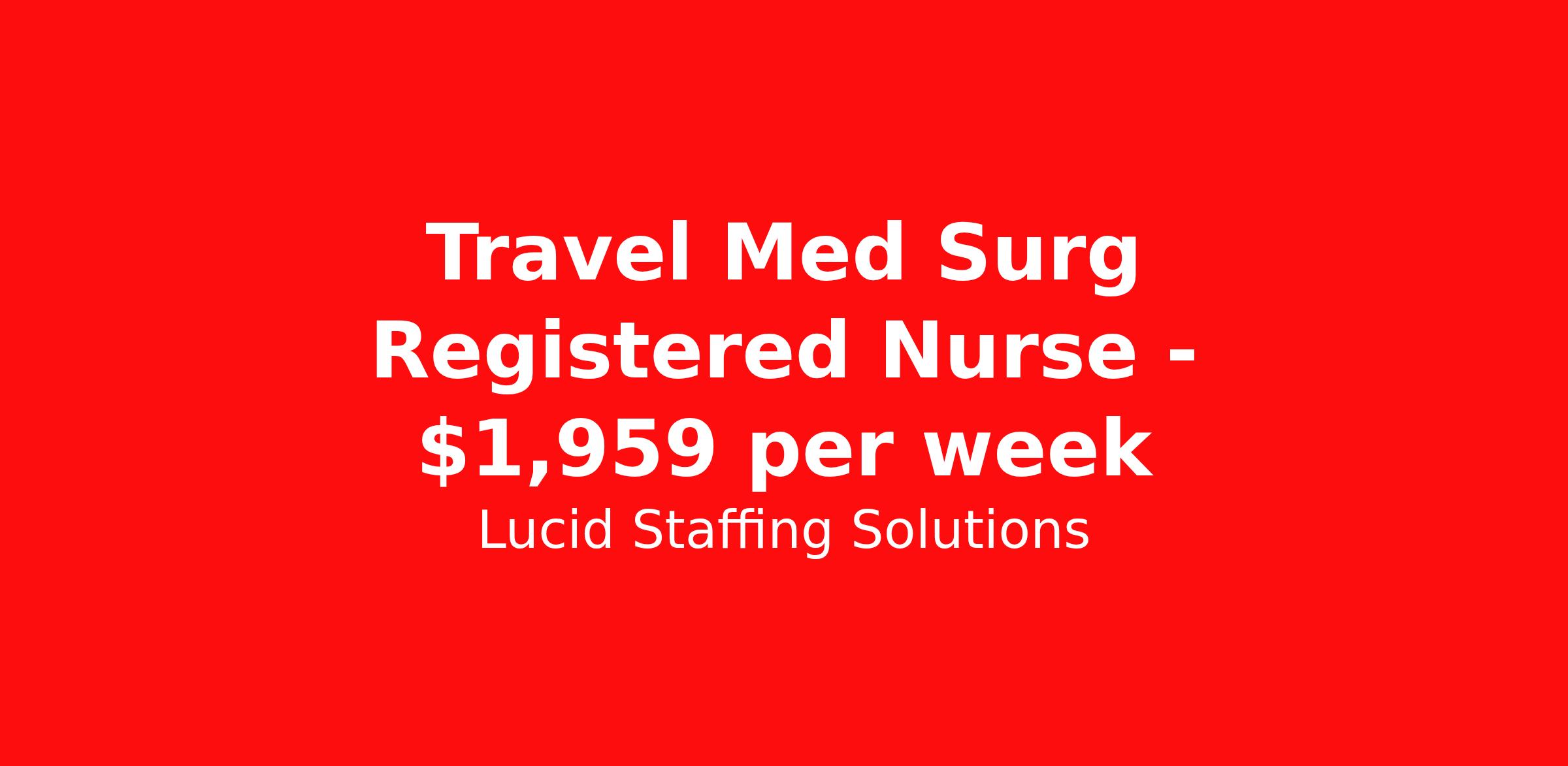 Lucid Staffing Solutions is seeking a travel nurse RN Med Surg for a travel nursing job in Saginaw, Michigan. Job Description & Requirements Specialty: Med Surg Discipline: RN Duration: 13 weeks 36 hours per week Shift: 12 hours Employment Type: Travel Job Description Position: Travel Registered Nurse (RN) with experience in OR Location: Saginaw, Michigan Shift: hr Weekly Gross: $1958.67 Lucid Staffing Solutions was created by former healthcare workers who lived the short staffing, the chaotic workflows, and the nonstop pressure that comes with patient care. We built an agency powered by real clinical experience, kept simple and supportive, so you never have to guess whether the people guiding you actually know what they’re talking about. Minimum Requirements: Active license as a Registered Nurse (RN) Licensed in Michigan (If applicable) or compact eligible Two years of recent OR experience Active BLS Why Lucid Works for Travelers Paid Weekly: Stipends pushed to GSA limits whenever possible $500 Travel Reimbursement: Paid at the start of each assignment Clinician-Led Team: Recruiters and Account Managers with real clinical experience In-House Compliance: fast updates, real communication, and none of the delays that come with outsourced vendors. Health Coverage Options: Multiple medical plans plus dental, vision, and workers compensation 401(k) Match: 4 percent match after 6 months License & Certification Reimbursement: We help cover the cost of staying compliant Liability Insurance: Included automatically Referral Bonuses: $500 per referral, $750 after five referrals Ready to start your journey? Apply today to connect with a Clinician-Recruiter! Lucid Staffing Solutions Job ID 35895. Pay package is based on 12 hour shifts and 36 hours per week (subject to confirmation) with tax-free stipend amount to be determined. Posted job title: OR About Lucid Staffing Solutions Clinician Owned & Operated At Lucid Staffing Solutions, we do things differently—because we’ve been in your shoes. Founded by actual healthcare professionals, Lucid was built to fix the issues we experienced as travelers. We know what makes a great assignment: competitive pay, seamless onboarding, honest recruiters, and most importantly—working with a team that truly sees and supports you. Our entire team is made up of former clinicians who understand the demands of the job and what travelers truly need to succeed. We offer some of the highest paying allied health and nursing contracts across the country, along with some amazing benefits & perks. Whether you're chasing freedom, flexible schedules, bigger paychecks, or your next adventure, Lucid helps you get there—with real support, real respect , and real healthcare experts. Benefits Dental benefits Medical benefits Vision benefits