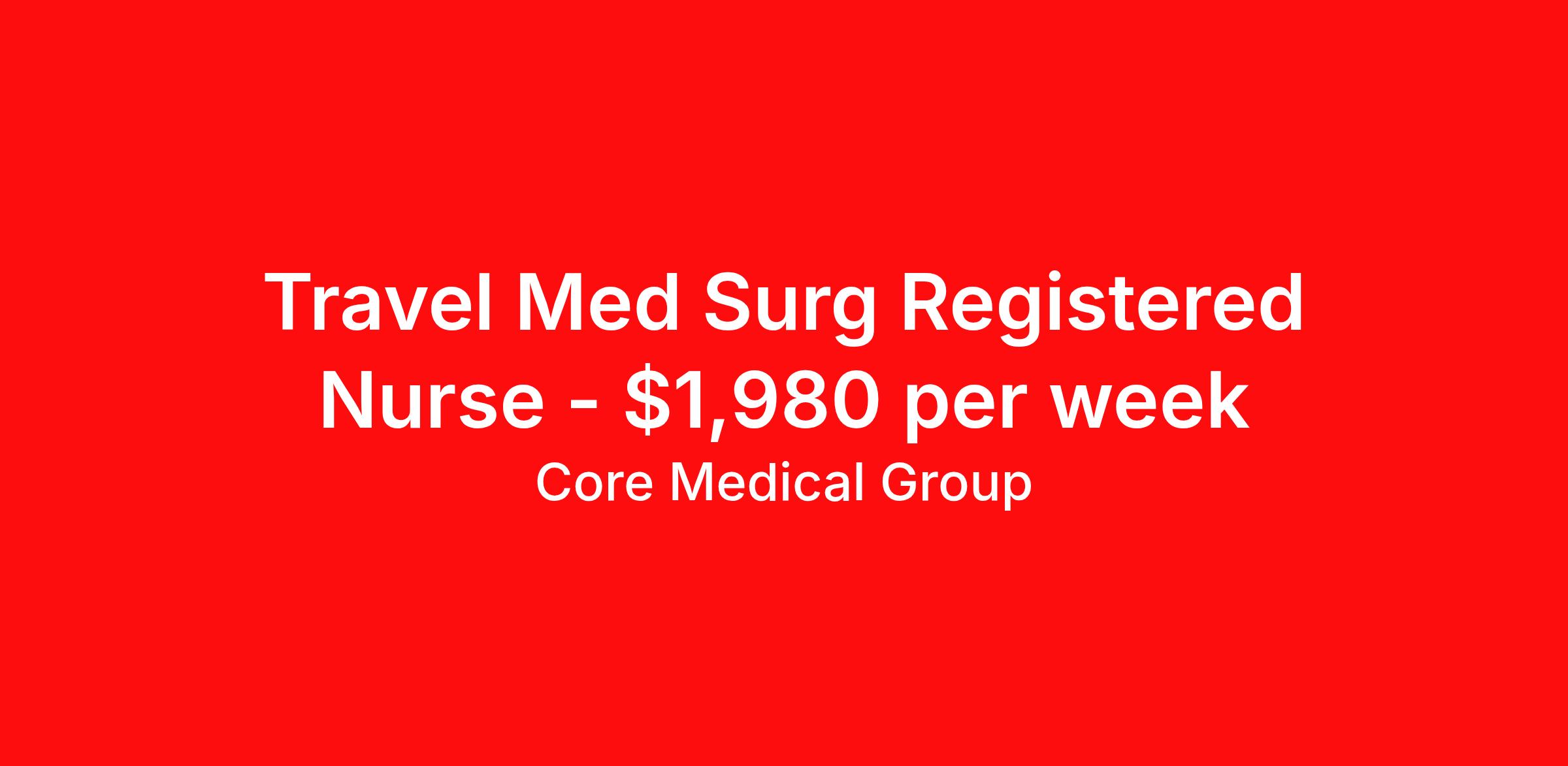 Core Medical Group is seeking a travel nurse RN Med Surg for a travel nursing job in Edmond, Oklahoma. Job Description & Requirements Specialty: Med Surg Discipline: RN Start Date: 04/13/2026 Duration: 13 weeks 36 hours per week Shift: 12 hours Employment Type: Travel Client in OK seeking Registered Nurse: Med/Surg for the following shift(s): Nights We are looking for a healthcare professional who is ready to provide exceptional patient care in this contract/travel role. Contract/travel assignments are typically 13 weeks, with potential to extend. Help us continue our mission to connect people, improve lives, and give back to the community by joining the CoreMedical Group team. When you work with CoreMedical Group, we put you first and treat you like family, supporting you every step of the way. CoreMedical Group is one of the largest healthcare staffing agencies in the country, with travel and contract positions located across the United States. Our recruiters will help you find the perfect job, whether it's across the country or across the street. In addition to dedicated, personalized support from your recruiter, when you work with CoreMedical Group you'll receive: Access to an extensive benefits package, including day 1 health, dental, and vision insurance, employer paid life insurance, a health reimbursement account, and more! Weekly paychecks with competitive pay packages Matching 401(k) benefits to help you save for retirement Licensure assistance and reimbursement to set you up for success on your contract Travel reimbursement and dedicated housing support while on assignment Referral cash bonuses when you connect us with other clinicians CoreMedical Group also offers you a free, all-inclusive vacation each year as our way of saying "thank you" for your hard work. Join other healthcare professionals on the annual Club CoreMed retreat and you'll see why our contract and travel professionals come back to us year after year! Your career is too valuable to tackle on your own. Let CoreMedical Group help you with your healthcare journey! *Estimate of weekly payments is intended for informational purposes and includes hourly wages, as well as reimbursements for meal & incidental expenses, and housing expenses incurred on behalf of the Company. Any benefits (medical/dental/vision) are in addition to the weekly pay. Please speak with your Recruiter for additional details. Estimated payments are subject to change until formal offer of assignment is made and accepted. Core Medical Group Job ID 1367334. Pay package is based on 12 hour shifts and 36 hours per week (subject to confirmation) with tax-free stipend amount to be determined. Posted job title: RN About Core Medical Group CoreMedical Group is one of the largest healthcare staffing agencies in the country. We have jobs nationwide in travel nursing, travel allied health, interim, locum tenens, and permanent placements! Join the staffing agency with Club CoreMed, the best perk in the industry - an all inclusive paid trip to a tropical resort! Benefits Weekly pay Holiday Pay Guaranteed Hours Continuing Education 401k retirement plan Pet insurance Company provided housing options Sick pay Wellness and fitness programs Mileage reimbursement Referral bonus Employee assistance programs Medical benefits Dental benefits Vision benefits Benefits start day 1 License and certification reimbursement Life insurance Discount program