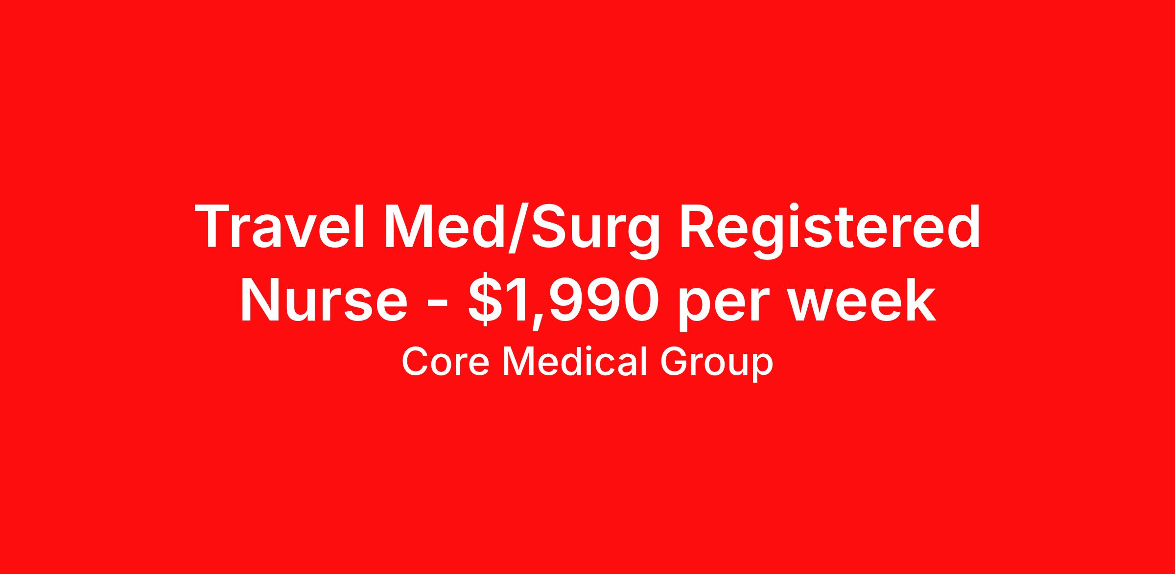 Core Medical Group is seeking a travel nurse RN Med Surg for a travel nursing job in Shelton, Washington. Job Description & Requirements Specialty: Med Surg Discipline: RN Start Date: 04/06/2026 Duration: 13 weeks 36 hours per week Shift: 12 hours Employment Type: Travel Client in WA seeking Registered Nurse: Med/Surg for the following shift(s): Nights We are looking for a healthcare professional who is ready to provide exceptional patient care in this contract/travel role. Contract/travel assignments are typically 13 weeks, with potential to extend. Help us continue our mission to connect people, improve lives, and give back to the community by joining the CoreMedical Group team. When you work with CoreMedical Group, we put you first and treat you like family, supporting you every step of the way. CoreMedical Group is one of the largest healthcare staffing agencies in the country, with travel and contract positions located across the United States. Our recruiters will help you find the perfect job, whether it's across the country or across the street. In addition to dedicated, personalized support from your recruiter, when you work with CoreMedical Group you'll receive: Access to an extensive benefits package, including day 1 health, dental, and vision insurance, employer paid life insurance, a health reimbursement account, and more! Weekly paychecks with competitive pay packages Matching 401(k) benefits to help you save for retirement Licensure assistance and reimbursement to set you up for success on your contract Travel reimbursement and dedicated housing support while on assignment Referral cash bonuses when you connect us with other clinicians CoreMedical Group also offers you a free, all-inclusive vacation each year as our way of saying "thank you" for your hard work. Join other healthcare professionals on the annual Club CoreMed retreat and you'll see why our contract and travel professionals come back to us year after year! Your career is too valuable to tackle on your own. Let CoreMedical Group help you with your healthcare journey! *Estimate of weekly payments is intended for informational purposes and includes hourly wages, as well as reimbursements for meal & incidental expenses, and housing expenses incurred on behalf of the Company. Any benefits (medical/dental/vision) are in addition to the weekly pay. Please speak with your Recruiter for additional details. Estimated payments are subject to change until formal offer of assignment is made and accepted. Core Medical Group Job ID 1367781. Pay package is based on 12 hour shifts and 36 hours per week (subject to confirmation) with tax-free stipend amount to be determined. Posted job title: RN About Core Medical Group CoreMedical Group is one of the largest healthcare staffing agencies in the country. We have jobs nationwide in travel nursing, travel allied health, interim, locum tenens, and permanent placements! Join the staffing agency with Club CoreMed, the best perk in the industry - an all inclusive paid trip to a tropical resort! Benefits Weekly pay Holiday Pay Guaranteed Hours Continuing Education 401k retirement plan Pet insurance Company provided housing options Sick pay Wellness and fitness programs Mileage reimbursement Referral bonus Employee assistance programs Medical benefits Dental benefits Vision benefits Benefits start day 1 License and certification reimbursement Life insurance Discount program