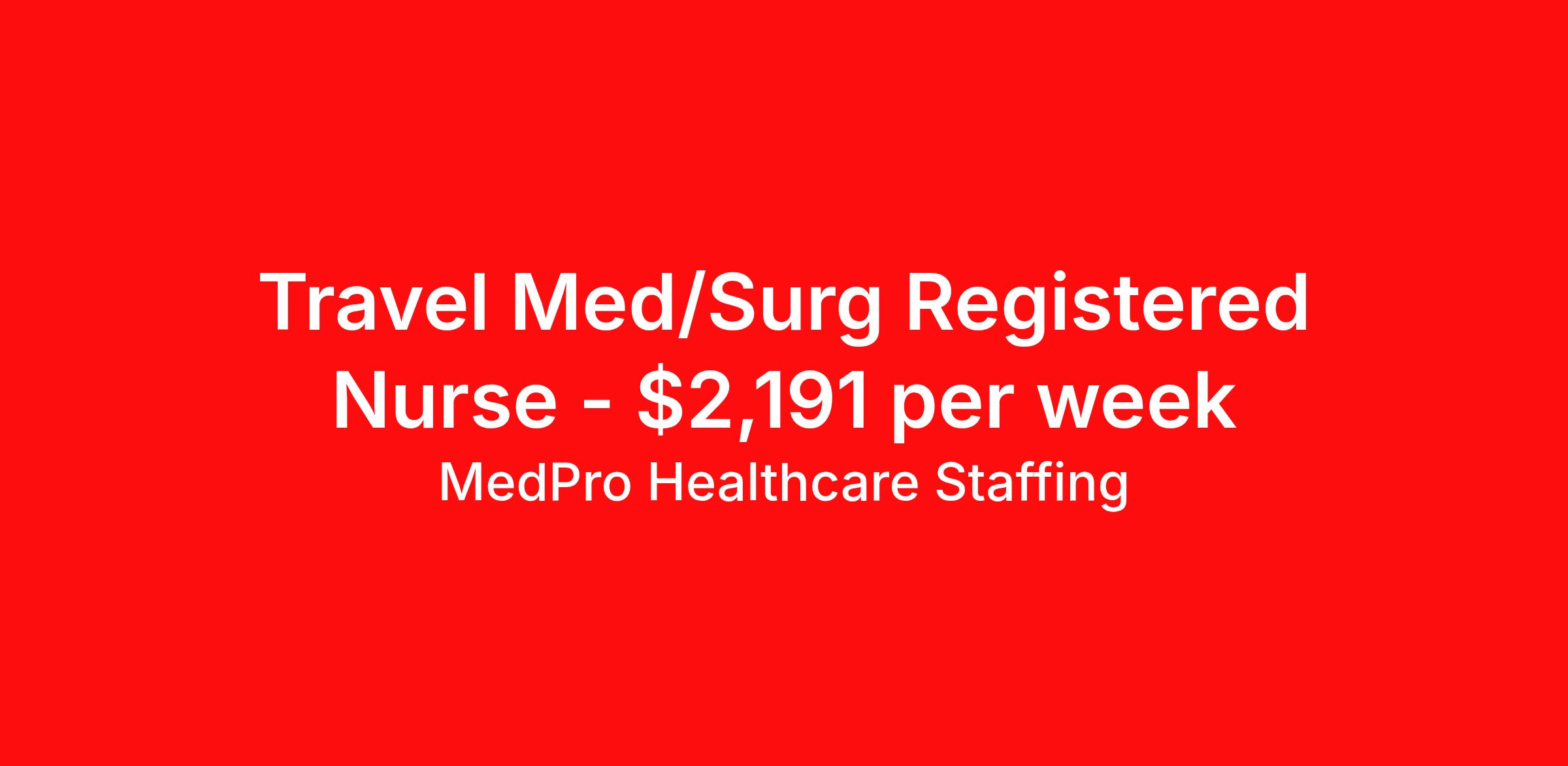 MedPro Healthcare Staffing is seeking a travel nurse RN Med Surg for a travel nursing job in Springfield, Illinois. Job Description & Requirements Specialty: Med Surg Discipline: RN Start Date: 04/13/2026 Duration: 13 weeks 36 hours per week Shift: 12 hours, nights Employment Type: Travel MedPro Healthcare Staffing , a Joint Commission-certified staffing agency, is seeking a quality Med-Surg registered nurse (RN) for a travel assignment with one of our top healthcare clients. Requirements Active RN License Degree from accredited nursing program BLS Certifications Eighteen months of recent experience in an Acute Care Med/Surg setting Other requirements to be determined by our client facility Benefits Weekly pay and direct deposit Full coverage of all credentialing fees Private housing or housing allowance Group Health insurance for you and your family Company-paid life and disability insurance Travel reimbursement 401(k) matching Unlimited Referral Bonuses up to $1,000 Duties Responsibilities Med-Surg Nurses (RN) provide care for primarily adult patients before and after surgical procedures; they also attend to those who are being treated with pharmaceuticals to manage illness. Due to the broad range of medical conditions Med/Surg Nurses will encounter, they must be well-versed in a large variety of health conditions. Complete assignments made by physicians. Provide routine treatment and post-surgical care. Assess changes in patient's health status and perform various treatments. Administer medication. Meticulous documentation as to medication and treatment administration to ensure continuity of care between nursing staff, physicians and other treatment team members. About Agency MedPro Healthcare Staffing is a Joint Commission certified provider of contract staffing services. Since 1983, we have placed nursing and allied travelers in top healthcare facilities nationwide. Join us today for your very own MedPro Experience®. If qualified and interested, please call for immediate consideration. MedPro Staffing is an Equal Opportunity Employer. All applicants will be considered for employment without attention to race, color, religion, national origin, age, sex, disability, marital status or veteran status. Key Words: Registered Nurse, RN, Medical-Surgical, Travel Nurse, Contract Nurse, Agency Nurse, Agency RN, RN-MS, RN- Medical Surgical, Travel RN, Contract, Nursing, RN Med-Surg, Travel Nursing *Weekly payment estimates are intended for informational purposes only and include a gross estimate of hourly wages and reimbursements for meal, incidental, and housing expenses. Your recruiter will confirm your eligibility and provide additional details. MedPro Job ID a0Fcx00000F5j0hEAB. Pay package is based on 12 hour shifts and 36 hours per week (subject to confirmation) with tax-free stipend amount to be determined. Posted job title: Med-Surg Registered Nurse Nursing: Medical Surgical. About MedPro Healthcare Staffing At MedPro Healthcare Staffing , we believe no one cares more for caregivers than we do. Our mission is simple: you focus on your patients, and we’ll take care of the rest. As a Joint Commission-certified leader in temporary and contract healthcare staffing since 1983, MedPro has proudly connected nursing and allied travelers with top healthcare facilities across the nation. With thousands of job opportunities available nationwide, we make it easy to find assignments that align with your goals and lifestyle. Our on-staff clinical support team—alongside a compassionate group of experienced recruiters—provides hands-on guidance every step of the way. From Day 1 medical benefits and a 401(k) plan to personalized career support, we’re committed to ensuring every professional we serve feels valued, cared for, and empowered to succeed. Guided by a CEO who is a Registered Nurse, MedPro is built on a foundation of clinical insight and genuine compassion for the caregiving community. Through The MedPro Experience® , we deliver travel assignments that are rewarding, memorable, and designed to help you DREAM big, EXPLORE often, and ACHIEVE greatness. Benefits Day 1 medical, dental, and vision benefits for you and your family Weekly pay and direct deposit Unlimited Referral Bonuses starting at $500 On Staff Clinical Support Team Access to nationwide travel assignments MPX Mobile app -24/7 real-time access to jobs, credentials, assignment details, and more Full coverage of all credentialing fees Private housing or housing allowance Tax Free Per Diems, Housing Stipends and Travel Reimbursements Company-paid life and disability insurance Travel reimbursement 401(k) matching Benefits Weekly pay Referral bonus Employee assistance programs