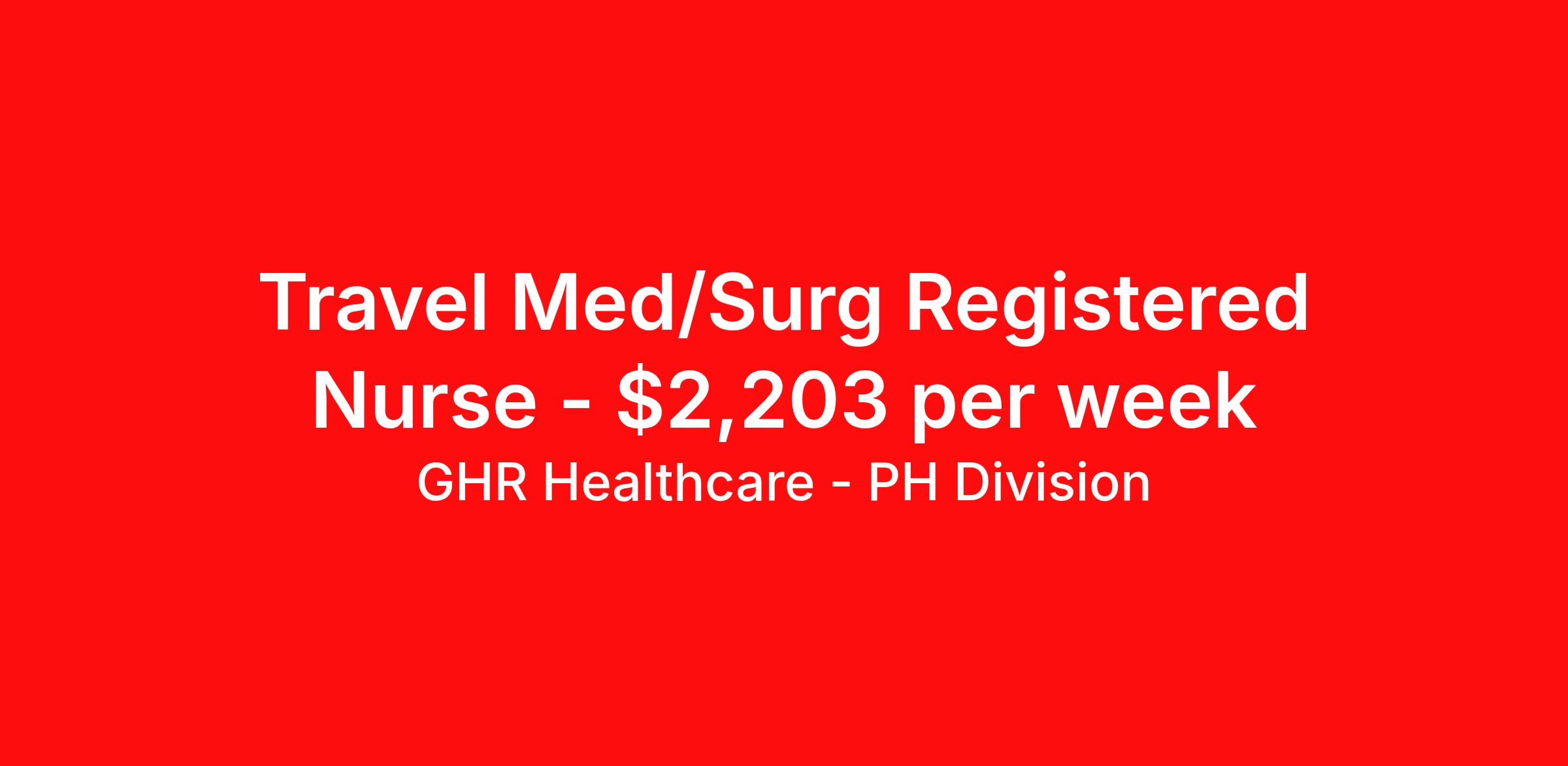 GHR Healthcare - PH Division is seeking a travel nurse RN Med Surg for a travel nursing job in Altoona, Pennsylvania. Job Description & Requirements Specialty: Med Surg Discipline: RN Start Date: 04/06/2026 Duration: 12 weeks 36 hours per week Shift: 12 hours Employment Type: Travel Planet Healthcare Job ID 75197408. Pay package is based on 12 hour shifts and 36 hours per week (subject to confirmation) with tax-free stipend amount to be determined. About GHR Healthcare - PH Division For over 30 years, GHR Healthcare has been the bridge between healthcare professionals and the facilities that need them nationwide. We're committed to uncovering your ideal fit, supported by GHR's dedication to competitive compensation, transparent communication, and a devoted team that genuinely cares about your career journey. You can trust us to stand by your side as your advocate, confidante, and partner in advancing your career. At GHR, care and consideration are at the heart of everything we do. Visit ghrhealthcare.com to learn more.