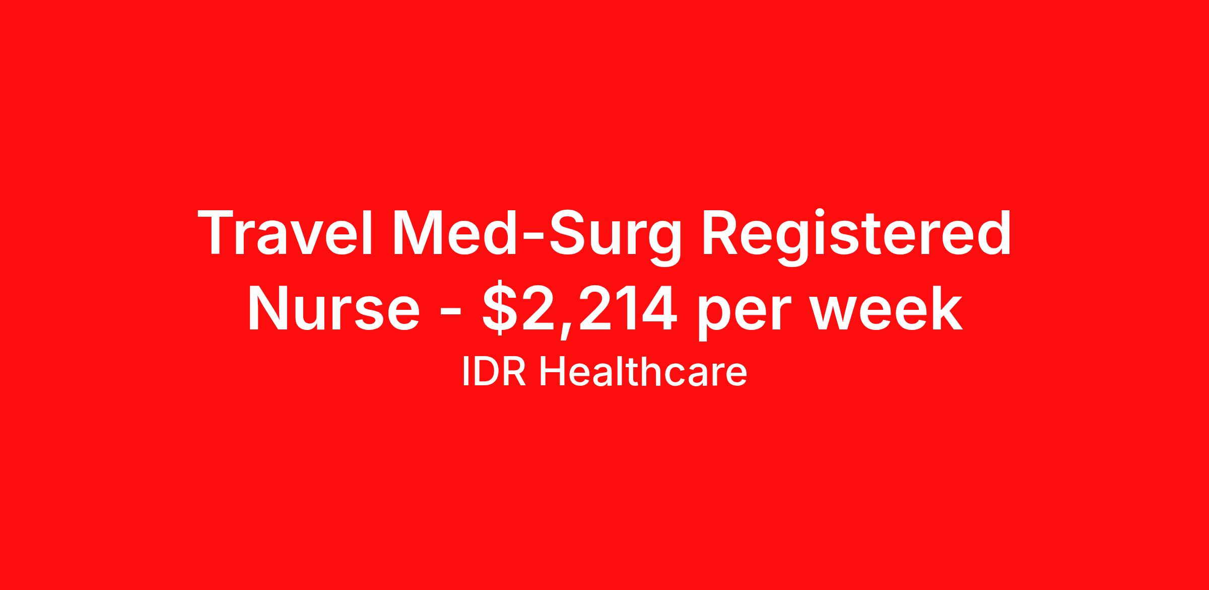 IDR Healthcare is seeking a travel nurse RN Med Surg for a travel nursing job in Newburgh, Indiana. Job Description & Requirements Specialty: Med Surg Discipline: RN Start Date: 04/20/2026 Duration: 13 weeks 36 hours per week Shift: 12 hours, nights Employment Type: Travel IDR Healthcare is an awarding winning staffing firm that believes it is a privilege and awesome responsibility to serve those who selflessly care for others. Our mission is to empower healthcare professionals to achieve their fullest potential both personally and professionally while they create positive change within the healthcare community. We exercise true grit, tenacity, and authenticity while embracing and ownership mindset to go above and beyond providing healthcare professionals a world class experience. We are employee owned and our travelers and clinicians earn shares/equity by just completing multiple assignments! We have been named SIA’s Fastest Growing Staffing Firms and have won ClearlyRated® Best of Staffing for 11 consecutive years! This cements our commitment to clinician satisfaction earning top net promoter scores putting us in the top 2% of agencies in North America! TravelFarWithIDR and see what an extraordinary experience is all about! Benefits 2024 World Staffing Best Staffing Firms to Work For! ESOP (Equity) Healthcare Benefits for up to 30 days Between Assignments Comprehensive Health Insurance Dental and Vision Insurance Sign-On, Completion, & Referral Bonus Programs License and Certification Reimbursement Weekly Pay and Competitive Compensation Large Network of Clients and Job Opportunities 401k retirement plan Exclusive Assignments IDR Job ID 496829. Pay package is based on 12 hour shifts and 36 hours per week (subject to confirmation) with tax-free stipend amount to be determined. About IDR Healthcare IDR Healthcare is an awarding winning staffing firm that believes it is a privilege and awesome responsibility to serve those who selflessly care for others. Our mission is to empower healthcare professionals to achieve their fullest potential both personally and professionally while they create positive change within the healthcare community. We exercise true grit, tenacity, and authenticity while embracing and ownership mindset to go above and beyond providing healthcare professionals a world class experience. We are employee owned and our travelers and clinicians earn shares/equity by just completing multiple assignments! We have been named SIA’s Fastest Growing Staffing Firms and have won ClearlyRated® Best of Staffing for 11 consecutive years! This cements our commitment to clinician satisfaction earning top net promoter scores putting us in the top 2% of agencies in North America! Help us give back! For every booked assignment, proceeds are donated to St. Jude and Feeding America! Last year we raised over $18,000 for St. Jude and provided over 49,000 meals for children in need. TravelFarWithIDR and see what it is all about! Benefits Weekly pay 401k retirement plan Referral bonus Medical benefits Dental benefits License and certification reimbursement Vision benefits