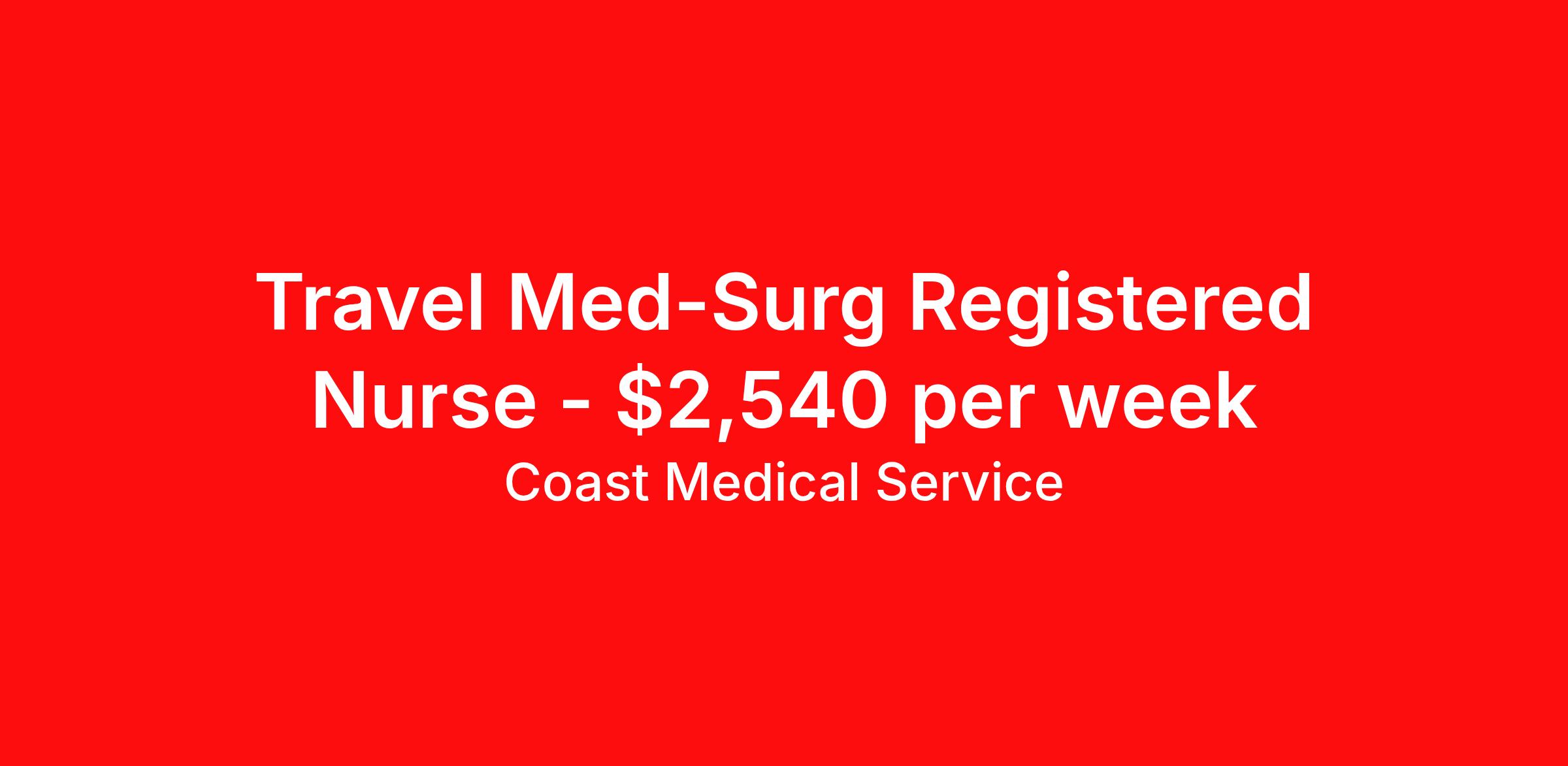 Coast Medical Service is seeking a travel nurse RN Med Surg for a travel nursing job in Bethel, Alaska. Job Description & Requirements Specialty: Med Surg Discipline: RN Start Date: ASAP Duration: 13 weeks 36 hours per week Shift: 12 hours, rotating Employment Type: Travel Coast Medical Service is a nationwide travel nursing & allied healthcare staffing agency dedicated to providing an elite traveler experience for the experienced or first-time traveler. Coast is featured on Blue Pipes' 2023 Best Travel Agencies and named a 2022 Top Rated Healthcare Staffing Firm & 2023 First Half Top Rated Healthcare Staffing Firm by Great Recruiters. Please note that pay rate may differ for locally based candidates. Please apply here or contact a recruiter directly to learn more about this position & the facility, and/or explore others that may be of interest to you. We look forward to speaking with you! Coast Medical Services Job ID 35479179. Pay package is based on 12 hour shifts and 36.0 hours per week (subject to confirmation) with tax-free stipend amount to be determined. Posted job title: RN:Medical-Surgical,07:00:00-19:00:00