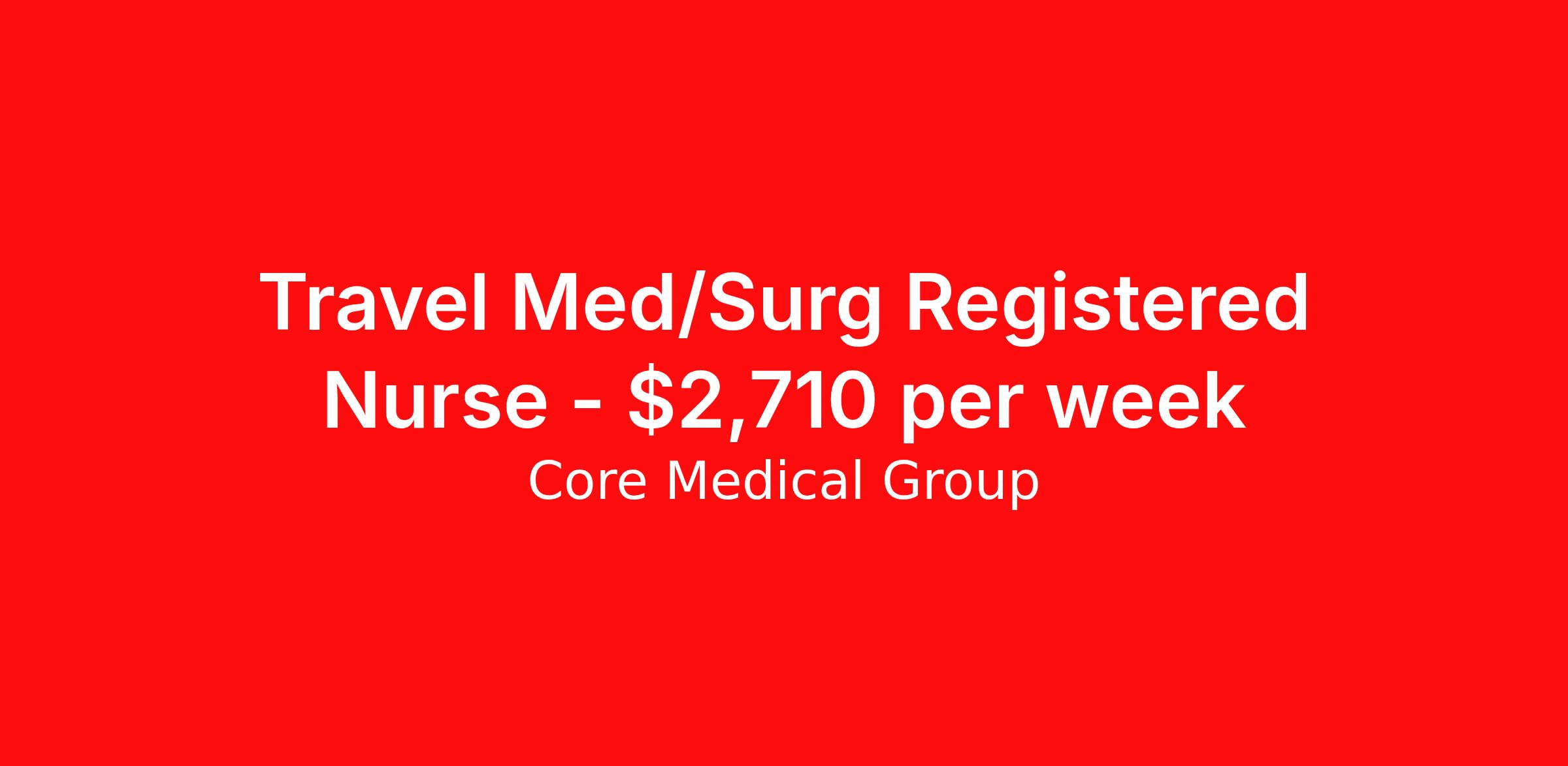 Core Medical Group is seeking a travel nurse RN Med Surg for a travel nursing job in Merced, California. Job Description & Requirements Specialty: Med Surg Discipline: RN Start Date: ASAP Duration: 13 weeks 40 hours per week Shift: 8 hours Employment Type: Travel Client in CA seeking Registered Nurse: Med/Surg for the following shift(s): Days We are looking for a healthcare professional who is ready to provide exceptional patient care in this contract/travel role. Contract/travel assignments are typically 13 weeks, with potential to extend. Help us continue our mission to connect people, improve lives, and give back to the community by joining the CoreMedical Group team. When you work with CoreMedical Group, we put you first and treat you like family, supporting you every step of the way. CoreMedical Group is one of the largest healthcare staffing agencies in the country, with travel and contract positions located across the United States. Our recruiters will help you find the perfect job, whether it's across the country or across the street. In addition to dedicated, personalized support from your recruiter, when you work with CoreMedical Group you'll receive: Access to an extensive benefits package, including day 1 health, dental, and vision insurance, employer paid life insurance, a health reimbursement account, and more! Weekly paychecks with competitive pay packages Matching 401(k) benefits to help you save for retirement Licensure assistance and reimbursement to set you up for success on your contract Travel reimbursement and dedicated housing support while on assignment Referral cash bonuses when you connect us with other clinicians CoreMedical Group also offers you a free, all-inclusive vacation each year as our way of saying "thank you" for your hard work. Join other healthcare professionals on the annual Club CoreMed retreat and you'll see why our contract and travel professionals come back to us year after year! Your career is too valuable to tackle on your own. Let CoreMedical Group help you with your healthcare journey! *Estimate of weekly payments is intended for informational purposes and includes hourly wages, as well as reimbursements for meal & incidental expenses, and housing expenses incurred on behalf of the Company. Any benefits (medical/dental/vision) are in addition to the weekly pay. Please speak with your Recruiter for additional details. Estimated payments are subject to change until formal offer of assignment is made and accepted. Core Medical Group Job ID 1362637. Pay package is based on 8 hour shifts and 40 hours per week (subject to confirmation) with tax-free stipend amount to be determined. Posted job title: RN About Core Medical Group CoreMedical Group is one of the largest healthcare staffing agencies in the country. We have jobs nationwide in travel nursing, travel allied health, interim, locum tenens, and permanent placements! Join the staffing agency with Club CoreMed, the best perk in the industry - an all inclusive paid trip to a tropical resort! Benefits Weekly pay Holiday Pay Guaranteed Hours Continuing Education 401k retirement plan Pet insurance Company provided housing options Sick pay Wellness and fitness programs Mileage reimbursement Referral bonus Employee assistance programs Medical benefits Dental benefits Vision benefits Benefits start day 1 License and certification reimbursement Life insurance Discount program