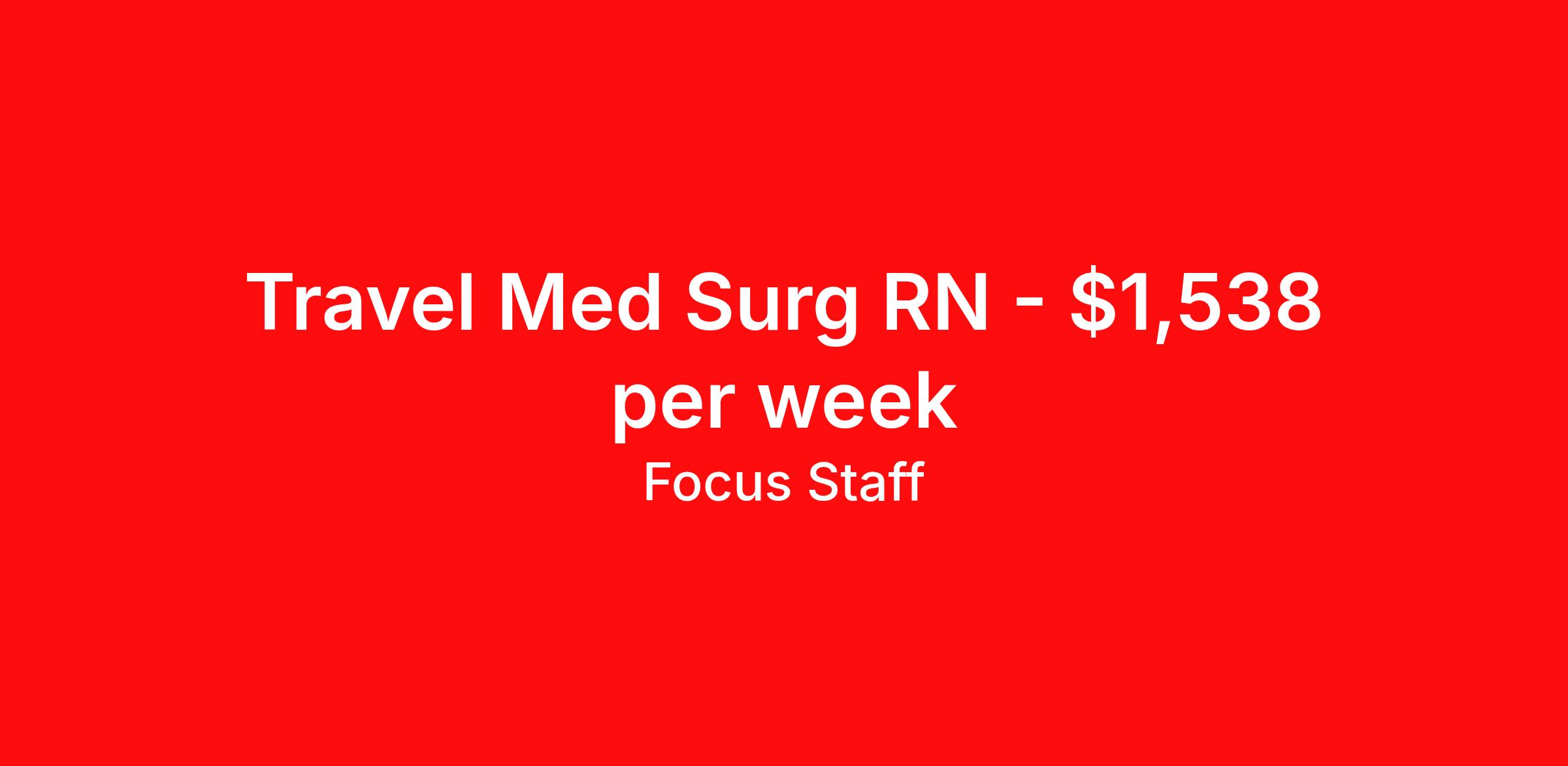 Focus Staff is seeking a travel nurse RN Med Surg for a travel nursing job in Granbury, Texas. Job Description & Requirements Specialty: Med Surg Discipline: RN Start Date: 04/13/2026 Duration: 13 weeks 36 hours per week Shift: 12 hours, nights Employment Type: Travel Want to be a crucial part of the care continuum? Join the Focus Staff team as a travel Medical/Surgical Nurse (Med/Surg RN) for a rewarding travel contract in Granbury, TX. Your daily work will directly contribute to optimal patient outcomes by providing meticulous care and compassionate support to individuals on their path to wellness. Contract Length: 13 Weeks Start Date: 04/13/2026 Shift: 3x12 Nights Ready to advance your career while seeing the country? Focus Staff provides the benefits and support you need to thrive on every assignment: Comprehensive Benefits : Get paid fast with weekly direct deposits and save for your future with our 401(k) matching and generous bonuses. Instant Peace of Mind : We provide immediate protection with day one medical, dental, vision, and life insurance and no waiting period. Travel with Confidence : Our team handles the details. We offer licensure reimbursement, relocation support, and exclusive discounts to make your next move effortless. Tailored to You : A dedicated recruiter is always available to provide 24/7 support and flexible scheduling options, including pet-friendly housing. Med/Surg RN Requirements: Minimum of 1-2 years of experience Valid TX RN License Current Basic Life Support (BLS) and Advanced Cardiac Life Support (ACLS) certification Must be eligible to work in the United States About Focus Staff: Focus Staff is a traveler-first healthcare staffing agency connecting talented travel nurses and allied health professionals with top assignments nationwide, prioritizing your unique needs and giving you complete control over your journey. Our mission is to help you create the life you love while exploring the country, advancing your healthcare career with competitive pay, and doing what you do best, providing exceptional patient care that makes a difference. Interested in becoming a traveler with Focus Staff? Discover why travelers choose us, apply today! Other Information: Job Title: Travel Med/Surg Nurse RN Employment Time: Contract/Travel Date Posted: 02/13/2026 02:21:18 PM Valid Through: 07/13/2026 Job City: Granbury Job State: TX Job Country: USA Shift: 3x12 Nights Job ID: a0xVt00000IDmxJIAT Hiring Organization: Focus Staff Focus Staff is an EEO/AA (Equal Employment Opportunity and Affirmative Action) Employer. *Estimated pay package based on bill rate at time job was posted. Bill rates can change frequently and without notice. Exact pay package may vary based on several factors, including, but not limited to, guaranteed hours, travel distance, demand, experience, etc. Focus Staff Job ID a0xVt00000IDmxJIAT. Pay package is based on 12 hour shifts and 36 hours per week (subject to confirmation) with tax-free stipend amount to be determined. Posted job title: Travel M/S RN - Med/Surg Registered Nurse About Focus Staff Your Journey, Our Focus. Travel Confidently, Care Boldly with Focus Staff. At Focus Staff, we’re here to make your travel healthcare career rewarding, seamless, and stress-free. Whether you’re a travel nurse, therapist, or allied health professional, we take care of the details so you can focus on what you do best — caring for others. Our mission is simple: to help healthcare heroes like you thrive, no matter where your journey takes you. With thousands of job opportunities across all 50 states, our dedicated recruiters work closely with you to match you to the right assignment, based on what matters most to you — pay, location, benefits, or career growth. From day one, you’ll enjoy premium benefits like medical coverage that bridges between assignments, 401K matching, travel and licensing reimbursements, and personalized housing support. Plus, our team is here for you 24/7, with clinical support available whenever you need guidance or backup. At Focus Staff, we believe in making every assignment a smooth, comfortable, and empowering experience. Let’s make your next adventure your best one yet.