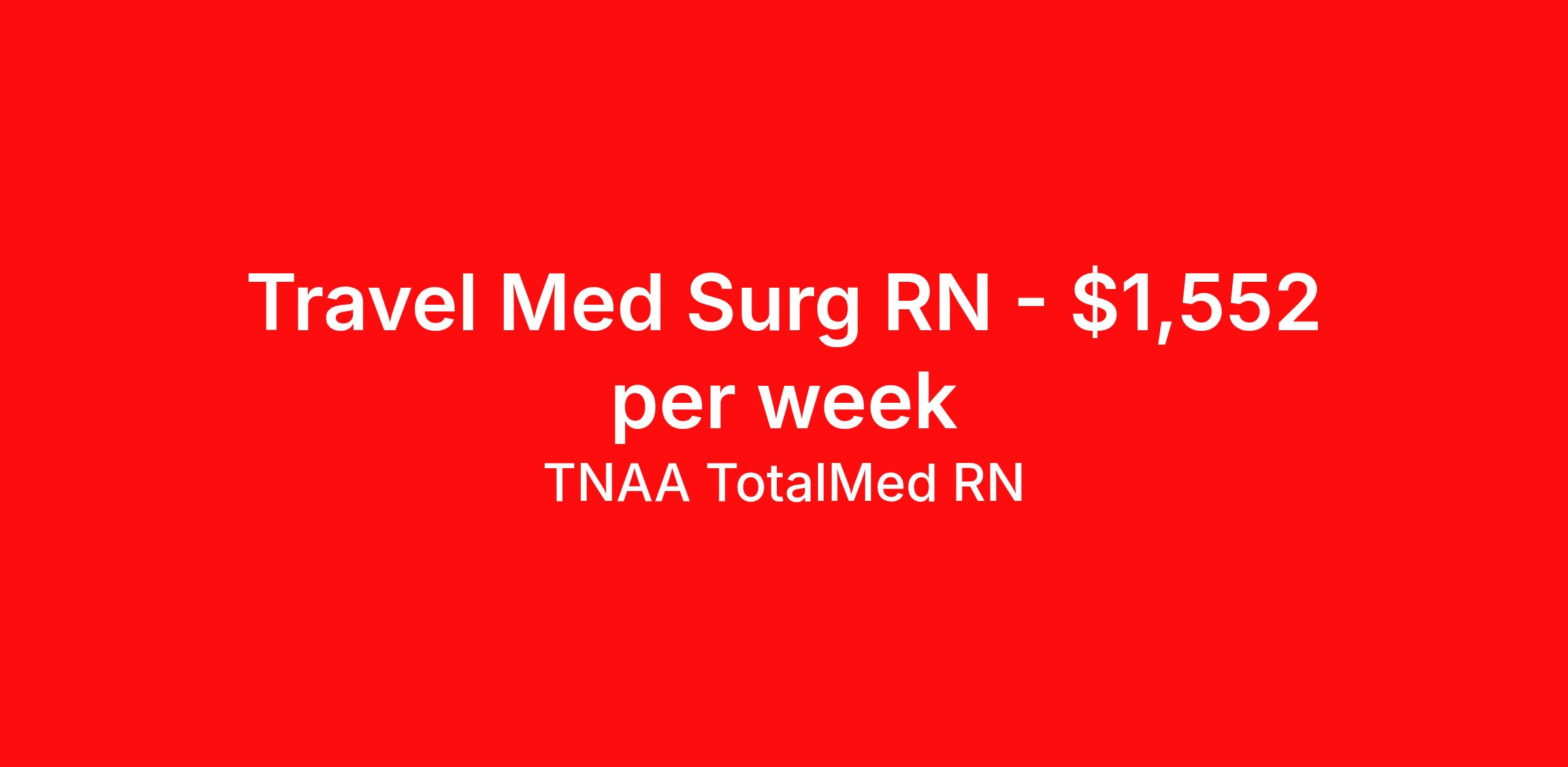 TNAA TotalMed RN is seeking a travel nurse RN Med Surg for a travel nursing job in Natchez, Mississippi. Job Description & Requirements Specialty: Med Surg Discipline: RN Duration: 13 weeks 36 hours per week Shift: 12 hours, days Employment Type: Travel We're looking for Medical Surgical RNs for an immediate travel nurse opening in Natchez, MS. The right RN should have 1-2 years recent acute care experience. Read below for more requirements. As a MedSurg RN, you will conduct patient assessments and prioritize data collection based on patients' immediate conditions or needs. MedSurg RNs perform ongoing assessments and appropriate treatments as ordered by a physician. Documenting patient findings and providing education and support to patients' families is essential to this travel nurse position. As a Medical Surgical Travel Nurse, you should be prepared to perform the following tasks: Provide bedside care for a variety of patients, including pre- and post-op patients. Prepare, administer and record prescribed medication, reporting any adverse reactions to treatment. Change dressings, insert catheters and start IVs. Prepares equipment and aids physician during examination and treatment of patient. Educates patients on surgical procedures. Participates in discharge planning and initiates patient education plan as prescribed by physician. Medical Surgical Travel Nurses should be able to stand and walk for long periods of time, as well as bend, lean and stoop without difficulty. RNs should be able to easily lift 20 pounds. Moving or lifting of patients may require lifting of up to 50 pounds at times. RNs will work in a fast-paced environment treating patients that may be confused, agitated, and/or uncooperative. Requirements*: BLS, PALS, 2 Years * Additional certifications may be required before beginning an assignment. TotalMed Travel Job ID 1377538. Pay package is based on 12 hour shifts and 36 hours per week (subject to confirmation) with tax-free stipend amount to be determined. Posted job title: Medical/Surgical - MedSurg RN - Travel Nurse About TNAA TotalMed RN TotalMed is a Top Ten, travel nursing and healthcare staffing agency with the mission of igniting purpose in healthcare. The organization staffs nurses, therapists, pharmacists, and other clinicians of all specialties in all 50 states. They offer local and travel jobs and match caregivers with the right organization to assist both facilities and patients. As an organization, they focus on putting highly-skilled staff into facilities to ensure adequate staffing for a better patient experience. TotalMed specializes in recruiting and placing healthcare professionals in travel, PRN, and permanent positions across the country in Nursing and Allied Health. Throughout 2020, the organization filled roles at even the most short-staffed facilities during the most challenging time in healthcare. By matching the right travel healthcare professional with the right organization, TotalMed continues to offer a lifeline to facilities and their patients. Benefits Weekly pay Guaranteed Hours Continuing Education 401k retirement plan Sick pay Wellness and fitness programs Referral bonus Employee assistance programs Medical benefits Dental benefits Vision benefits Benefits start day 1