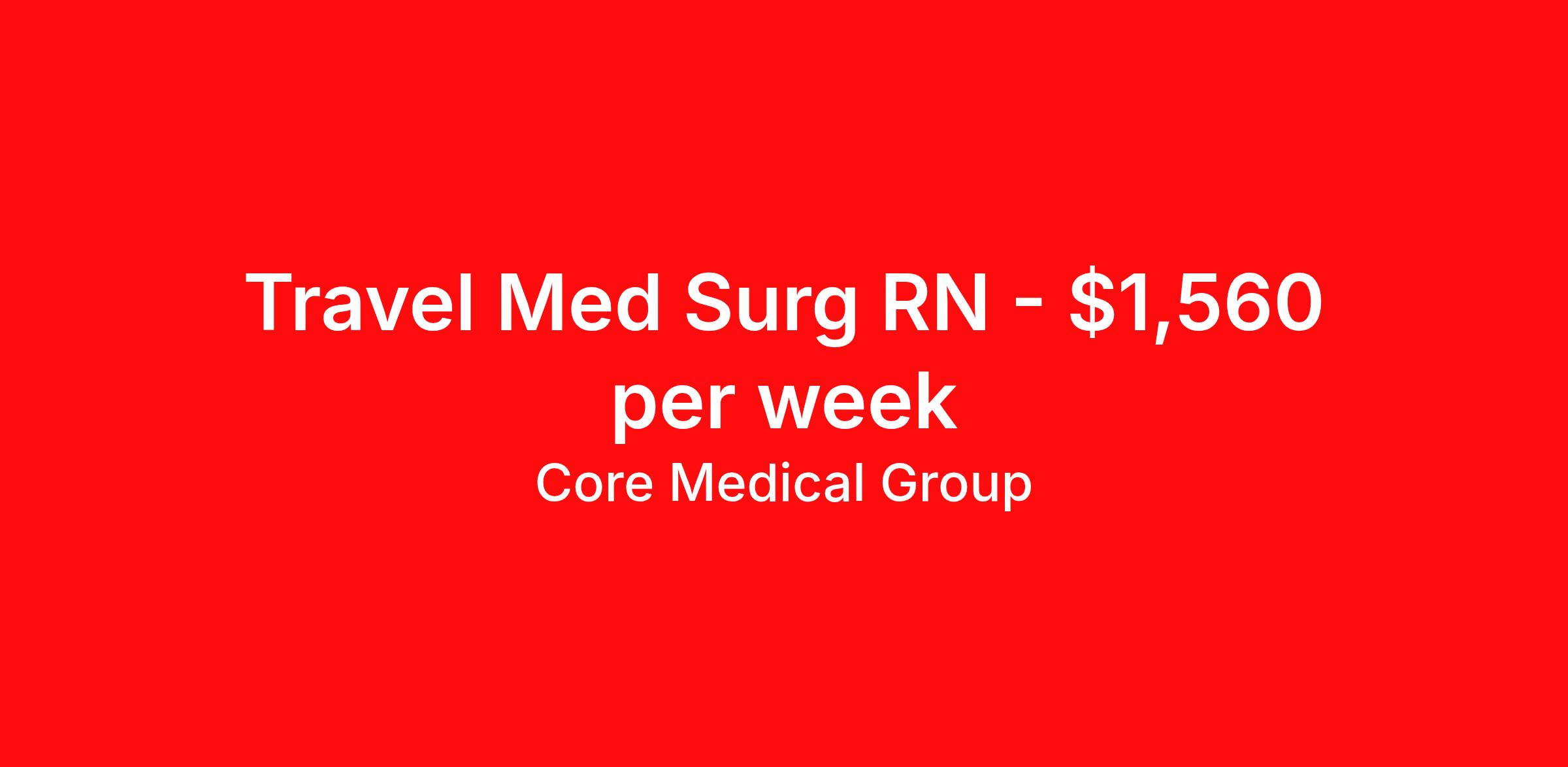 Core Medical Group is seeking a travel nurse RN Med Surg for a travel nursing job in Flowood, Mississippi. Job Description & Requirements Specialty: Med Surg Discipline: RN Start Date: 03/30/2026 Duration: 13 weeks 36 hours per week Shift: 12 hours Employment Type: Travel Client in MS seeking Registered Nurse: Med/Surg for the following shift(s): Days We are looking for a healthcare professional who is ready to provide exceptional patient care in this contract/travel role. Contract/travel assignments are typically 13 weeks, with potential to extend. Help us continue our mission to connect people, improve lives, and give back to the community by joining the CoreMedical Group team. When you work with CoreMedical Group, we put you first and treat you like family, supporting you every step of the way. CoreMedical Group is one of the largest healthcare staffing agencies in the country, with travel and contract positions located across the United States. Our recruiters will help you find the perfect job, whether it's across the country or across the street. In addition to dedicated, personalized support from your recruiter, when you work with CoreMedical Group you'll receive: Access to an extensive benefits package, including day 1 health, dental, and vision insurance, employer paid life insurance, a health reimbursement account, and more! Weekly paychecks with competitive pay packages Matching 401(k) benefits to help you save for retirement Licensure assistance and reimbursement to set you up for success on your contract Travel reimbursement and dedicated housing support while on assignment Referral cash bonuses when you connect us with other clinicians CoreMedical Group also offers you a free, all-inclusive vacation each year as our way of saying "thank you" for your hard work. Join other healthcare professionals on the annual Club CoreMed retreat and you'll see why our contract and travel professionals come back to us year after year! Your career is too valuable to tackle on your own. Let CoreMedical Group help you with your healthcare journey! *Estimate of weekly payments is intended for informational purposes and includes hourly wages, as well as reimbursements for meal & incidental expenses, and housing expenses incurred on behalf of the Company. Any benefits (medical/dental/vision) are in addition to the weekly pay. Please speak with your Recruiter for additional details. Estimated payments are subject to change until formal offer of assignment is made and accepted. Core Medical Group Job ID 1365836. Pay package is based on 12 hour shifts and 36 hours per week (subject to confirmation) with tax-free stipend amount to be determined. Posted job title: RN About Core Medical Group CoreMedical Group is one of the largest healthcare staffing agencies in the country. We have jobs nationwide in travel nursing, travel allied health, interim, locum tenens, and permanent placements! Join the staffing agency with Club CoreMed, the best perk in the industry - an all inclusive paid trip to a tropical resort! Benefits Weekly pay Holiday Pay Guaranteed Hours Continuing Education 401k retirement plan Pet insurance Company provided housing options Sick pay Wellness and fitness programs Mileage reimbursement Referral bonus Employee assistance programs Medical benefits Dental benefits Vision benefits Benefits start day 1 License and certification reimbursement Life insurance Discount program