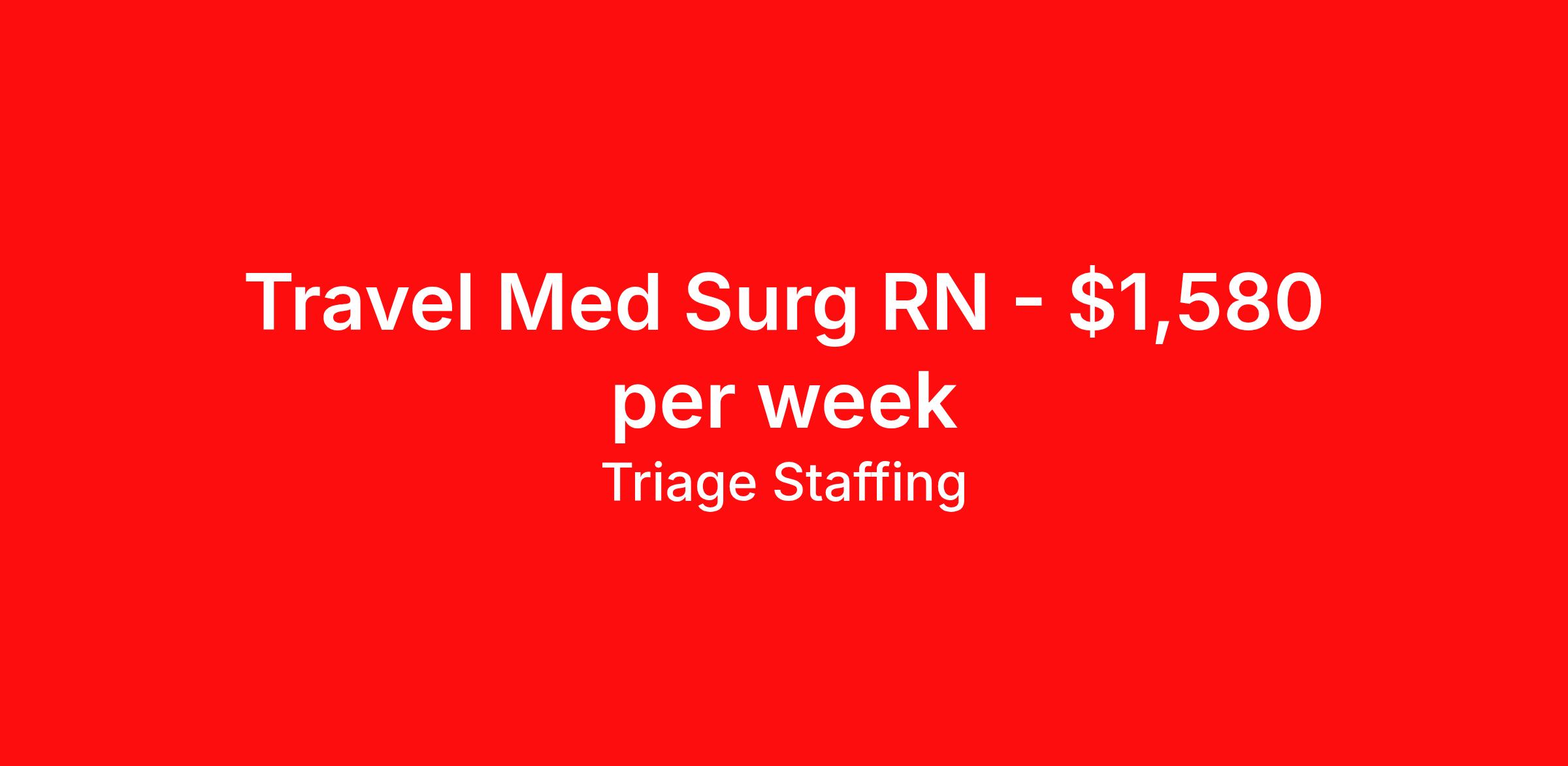 Triage Staffing is seeking a travel nurse RN Med Surg for a travel nursing job in Natchez, Mississippi. Job Description & Requirements Specialty: Med Surg Discipline: RN Start Date: ASAP Duration: 13 weeks 36 hours per week Shift: 12 hours, flexible Employment Type: Travel Travel Nursing: Med/Surg Natchez Location: Natchez Start Date: 3/9/2026 Shift Details: 12H Variable 36 hours per week Length: 13 WEEKS Apply for specific facility details.Med Surg RN Triage Staffing Job ID X4GMUCGC. Posted job title: Nursing: Med/Surg About Triage Staffing At Triage, we prefer to be real . Real about expectations—both ours and yours. Real about how a decision you make today could affect your tomorrows. Real about how compensation actually works. Real about how great—or grating—your next supervisor may be. Being real allows everyone at Triage to be ready . Ready to serve you with real honesty. So if that gig near the ocean is really no day at the beach, or that third shift comes with a second-class rate, we tell you. So you can be ready, too. We staff all five major divisions of acute care—nursing, lab, radiology, cardiopulmonary and rehab therapy, offering: - Competitive, custom pay packages - One point of contact for both travelers and facilities (per division) - A reliable recruiter who's got your back throughout your entire assignment - In-house compliance and accounting specialists - A clinical liaison team available 24/7 to offer medical and professional support and career development - A mentoring program that is run and managed by actual clinicians—yeah, you read that right - And more (because of course there’s more) Are we the biggest? No. Are we the best? That’s rather subjective, but we’re trying to be. Will we work like hell to get you as close to your idea of heaven as possible? Yes. Yes, we will. Benefits: Day One comprehensive, nationwide insurance plans for health, vision and dental and life—including a HSA option Day One 401(k) program with employer-matching contributions once eligible Facility cancelling protection—your time is money on and off-the-clock Guaranteed hours Weekly paychecks via direct deposit Earned vacation bonuses for time worked Paid holidays Employee assistance program (EAP)—your mental health is important, too Continuing education, certification and licensing reimbursement Workers comp—because accidents happen Top-rated professional liability insurance Company provided housing options Referral bonus—$750 in your pocket after they’ve completed a 13-week assignment