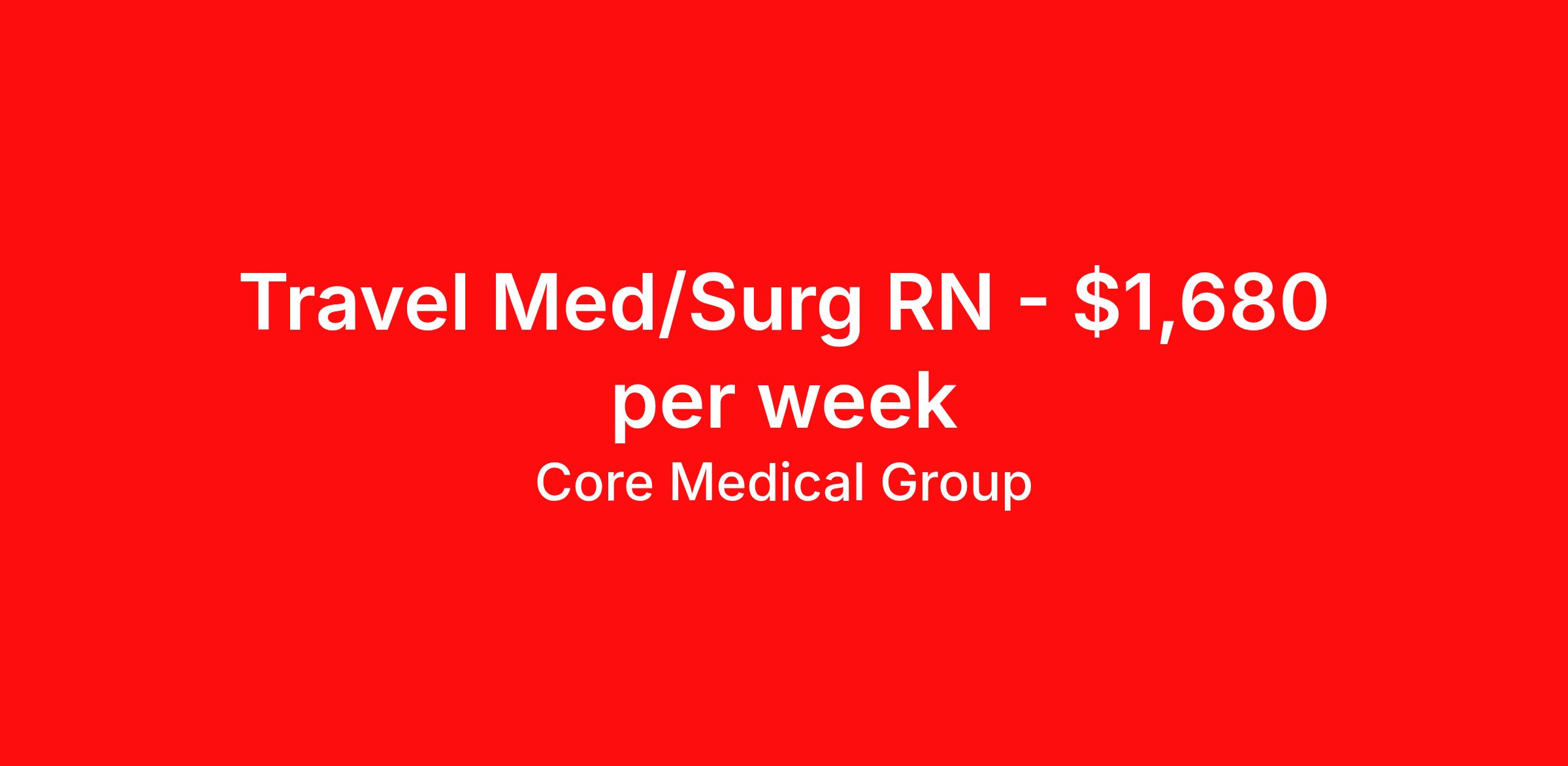 Core Medical Group is seeking a travel nurse RN Med Surg for a travel nursing job in Birmingham, Alabama. Job Description & Requirements Specialty: Med Surg Discipline: RN Start Date: 04/06/2026 Duration: 13 weeks 36 hours per week Shift: 12 hours Employment Type: Travel Client in AL seeking Registered Nurse: Med/Surg for the following shift(s): Nights We are looking for a healthcare professional who is ready to provide exceptional patient care in this contract/travel role. Contract/travel assignments are typically 13 weeks, with potential to extend. Help us continue our mission to connect people, improve lives, and give back to the community by joining the CoreMedical Group team. When you work with CoreMedical Group, we put you first and treat you like family, supporting you every step of the way. CoreMedical Group is one of the largest healthcare staffing agencies in the country, with travel and contract positions located across the United States. Our recruiters will help you find the perfect job, whether it's across the country or across the street. In addition to dedicated, personalized support from your recruiter, when you work with CoreMedical Group you'll receive: Access to an extensive benefits package, including day 1 health, dental, and vision insurance, employer paid life insurance, a health reimbursement account, and more! Weekly paychecks with competitive pay packages Matching 401(k) benefits to help you save for retirement Licensure assistance and reimbursement to set you up for success on your contract Travel reimbursement and dedicated housing support while on assignment Referral cash bonuses when you connect us with other clinicians CoreMedical Group also offers you a free, all-inclusive vacation each year as our way of saying "thank you" for your hard work. Join other healthcare professionals on the annual Club CoreMed retreat and you'll see why our contract and travel professionals come back to us year after year! Your career is too valuable to tackle on your own. Let CoreMedical Group help you with your healthcare journey! *Estimate of weekly payments is intended for informational purposes and includes hourly wages, as well as reimbursements for meal & incidental expenses, and housing expenses incurred on behalf of the Company. Any benefits (medical/dental/vision) are in addition to the weekly pay. Please speak with your Recruiter for additional details. Estimated payments are subject to change until formal offer of assignment is made and accepted. Core Medical Group Job ID 1362930. Pay package is based on 12 hour shifts and 36 hours per week (subject to confirmation) with tax-free stipend amount to be determined. Posted job title: RN About Core Medical Group CoreMedical Group is one of the largest healthcare staffing agencies in the country. We have jobs nationwide in travel nursing, travel allied health, interim, locum tenens, and permanent placements! Join the staffing agency with Club CoreMed, the best perk in the industry - an all inclusive paid trip to a tropical resort! Benefits Weekly pay Holiday Pay Guaranteed Hours Continuing Education 401k retirement plan Pet insurance Company provided housing options Sick pay Wellness and fitness programs Mileage reimbursement Referral bonus Employee assistance programs Medical benefits Dental benefits Vision benefits Benefits start day 1 License and certification reimbursement Life insurance Discount program