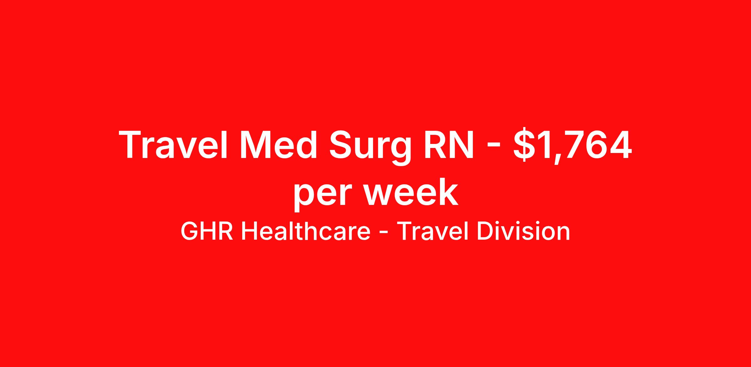 GHR Healthcare - Travel Division is seeking a travel nurse RN Med Surg for a travel nursing job in Natchez, Mississippi. Job Description & Requirements Specialty: Med Surg Discipline: RN Start Date: ASAP Duration: 13 weeks 36 hours per week Shift: 12 hours Employment Type: Travel GHR Healthcare - Travel Division Job ID 75735999. Pay package is based on 12 hour shifts and 36 hours per week (subject to confirmation) with tax-free stipend amount to be determined. About GHR Healthcare - Travel Division For over 30 years, GHR Healthcare has been the bridge between healthcare professionals and the facilities that need them nationwide. We're committed to uncovering your ideal fit, supported by GHR's dedication to competitive compensation, transparent communication, and a devoted team that genuinely cares about your career journey. You can trust us to stand by your side as your advocate, confidante, and partner in advancing your career. At GHR, care and consideration are at the heart of everything we do. Visit ghrhealthcare.com to learn more.