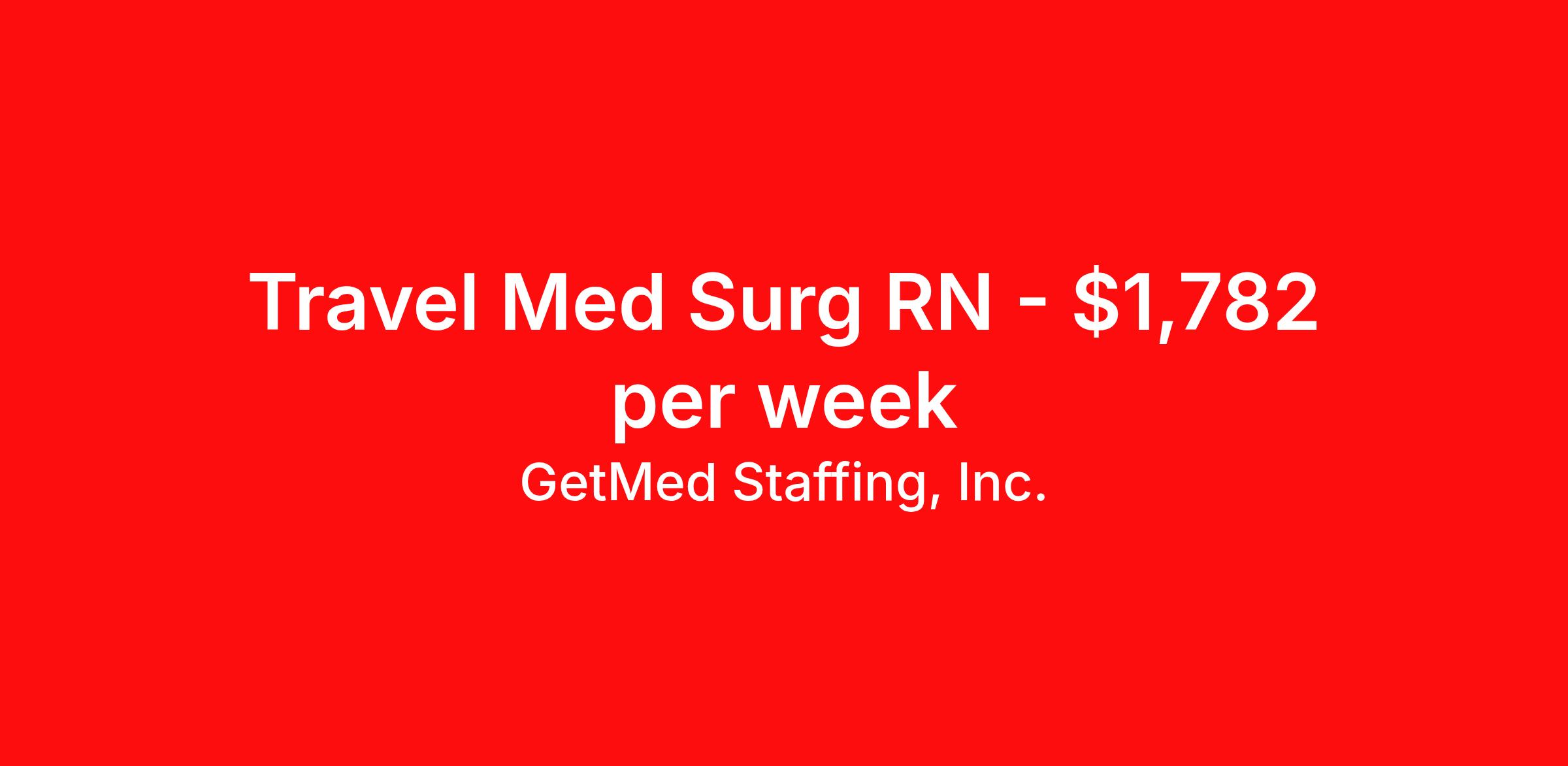 GetMed Staffing, Inc. is seeking a travel nurse RN Med Surg for a travel nursing job in Americus, Georgia. Job Description & Requirements Specialty: Med Surg Discipline: RN Start Date: 03/30/2026 Duration: 17 weeks 36 hours per week Shift: 12 hours, nights Employment Type: Travel GetMed Staffing is searching for a strong MedSurg RN to assist our traveler-friendly client. A minimum of 1-2 years of experience is required. Traveling with GetMed Staffing offers the unique opportunity to gain diverse experiences, both personally and professionally. Gain experience that matters. GetMed Staffing, Inc. Job ID 36008054. Pay package is based on 12 hour shifts and 36.0 hours per week (subject to confirmation) with tax-free stipend amount to be determined. Posted job title: RN:MedSurg,19:00:00-07:00:00 About GetMed Staffing, Inc. We are a diversity owned company, specializing in healthcare recruiting services. We truly understand how important a healthcare travelers' relationship is with their recruiter, as well as our relationship is with our healthcare facilities. We recognize that the needs of our healthcare travelers can vary, and therefore we provide the personalized touch necessary to ensure a successful travel assignment each and every time. Our healthcare facilities and clients benefit from us putting our healthcare travelers first. GetMed Staffing is excited to be a leader within the industry by focusing on providing healthcare travelers with more choices and possibilities as they plan for their next healthcare travel assignment. Benefits Life insurance Medical benefits Dental benefits Vision benefits 401k retirement plan