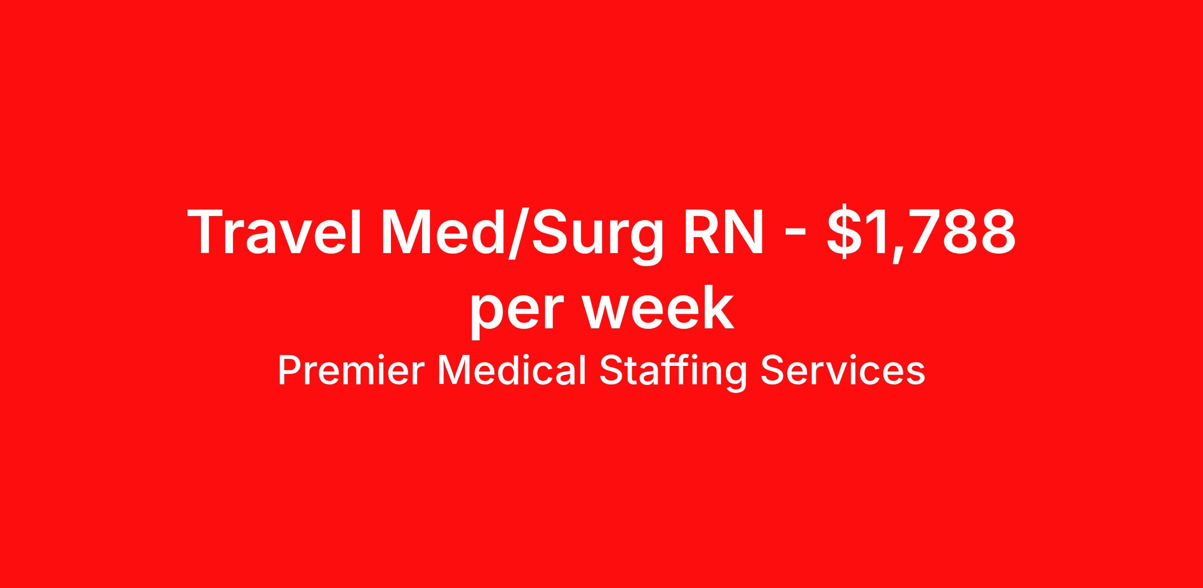 Premier Medical Staffing Services is seeking a travel nurse RN Med Surg for a travel nursing job in Harlingen, Texas. Job Description & Requirements Specialty: Med Surg Discipline: RN Start Date: 04/08/2026 Duration: 13 weeks 36 hours per week Shift: 12 hours Employment Type: Travel Premier Medical Staffing Job ID 625730. Pay package is based on 12 hour shifts and 36 hours per week (subject to confirmation) with tax-free stipend amount to be determined. Posted job title: RN Med/Surg About Premier Medical Staffing Services Premier Medical Staffing Services, LLC is a nationally expanding healthcare staffing firm for healthcare professionals and companies. We understand our clients’ need for highly qualified, expertly trained medical professionals and are passionate about helping clinicians find employment opportunities that fit their personality and needs. Able to accommodate the ever-changing needs of the healthcare landscape, we offer per-diem, contract and direct hire placements to support the unique needs of each industry sector. Premier Medical Staffing Services is Joint Commission Certified, a Military Spouse Employment Partner and is certified as a Women’s Business Enterprise. We are proudly nurse owned.